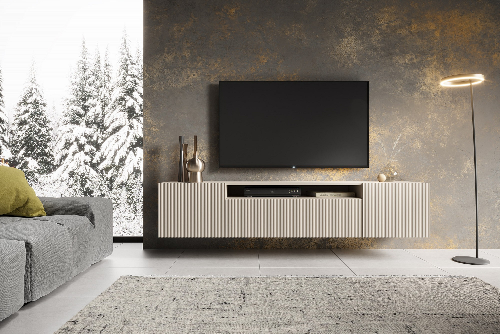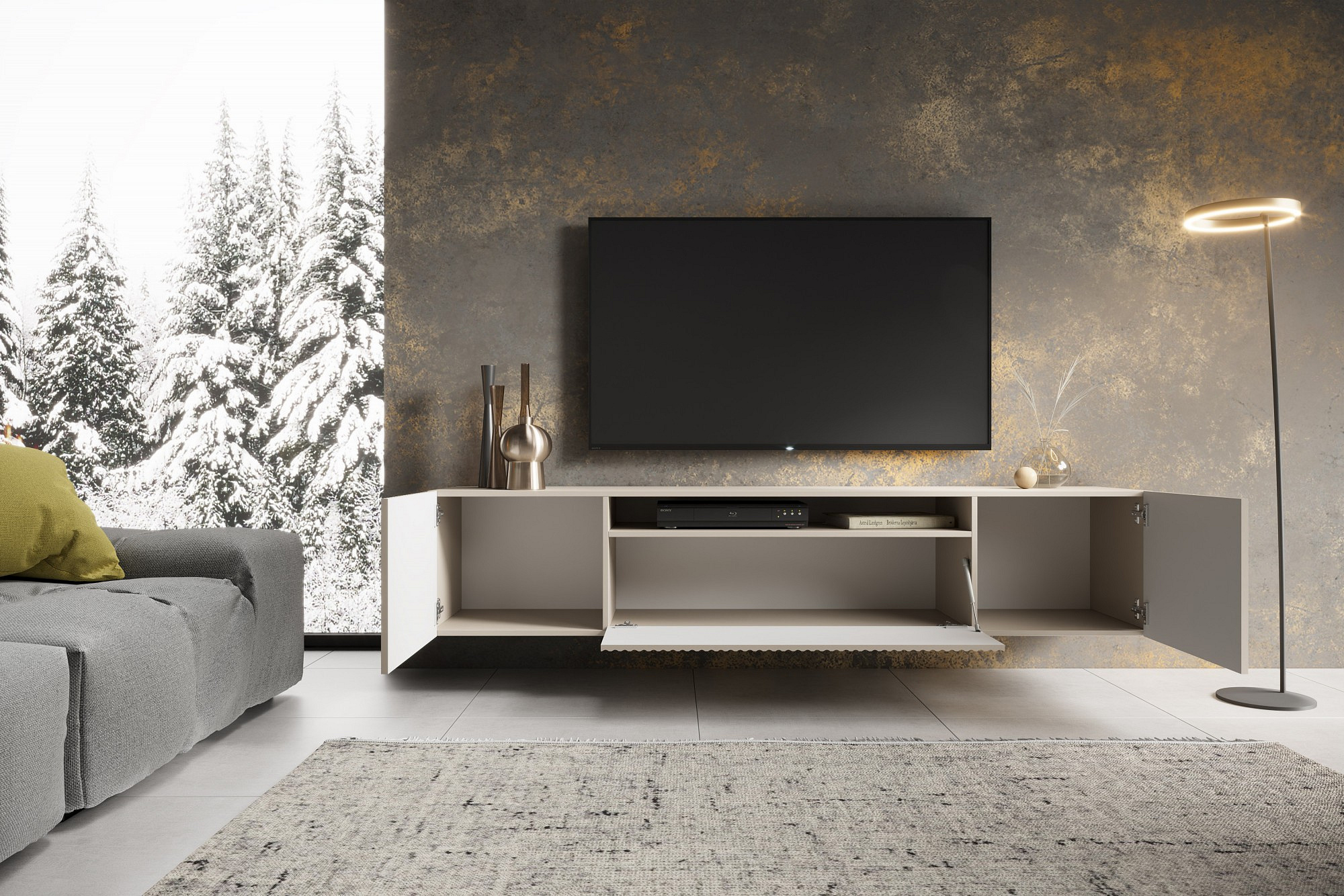 A NOEMI függesztett TV szekrény Kašmír színben nemcsak praktikus, hanem stílusos kiegészítője is az otthonának.