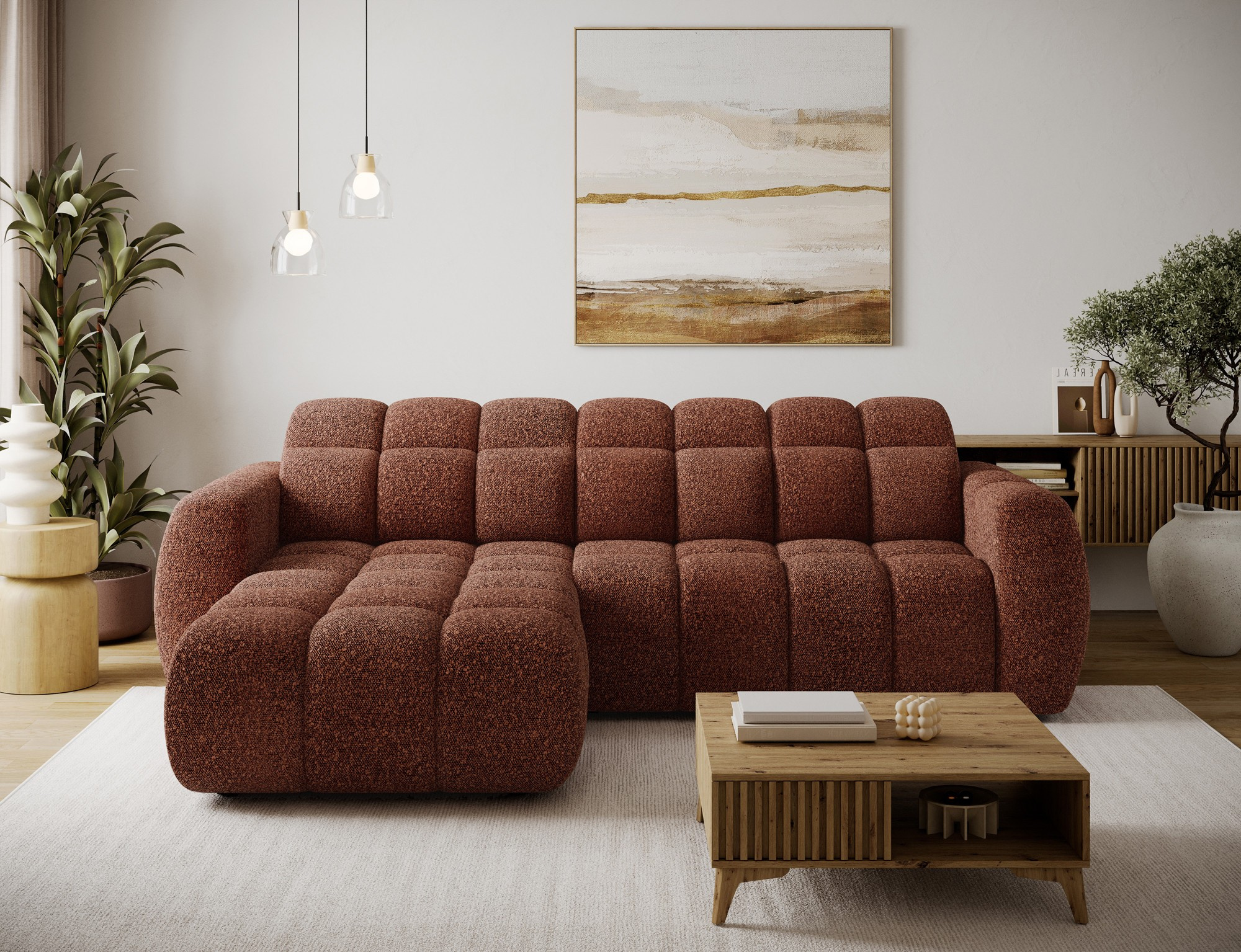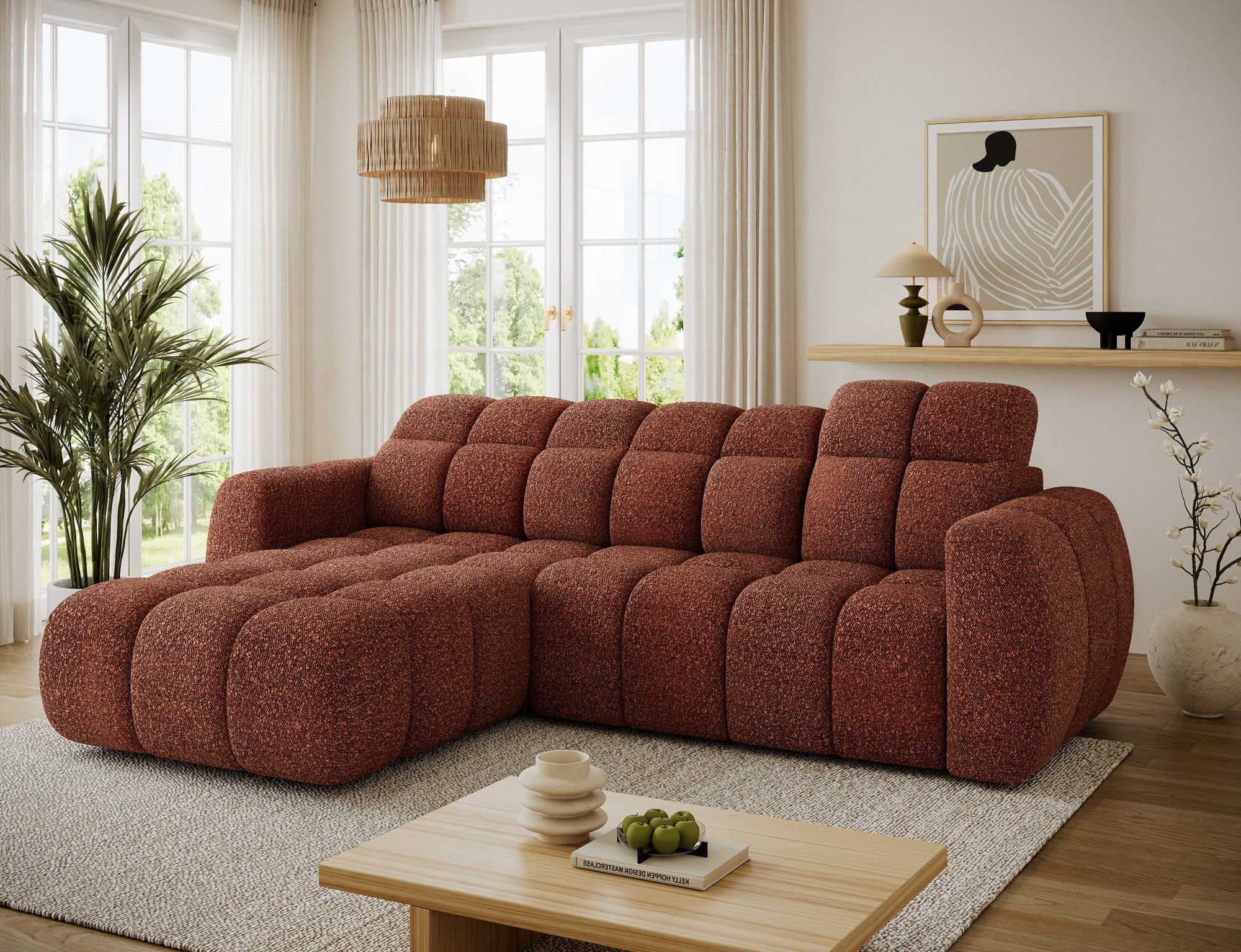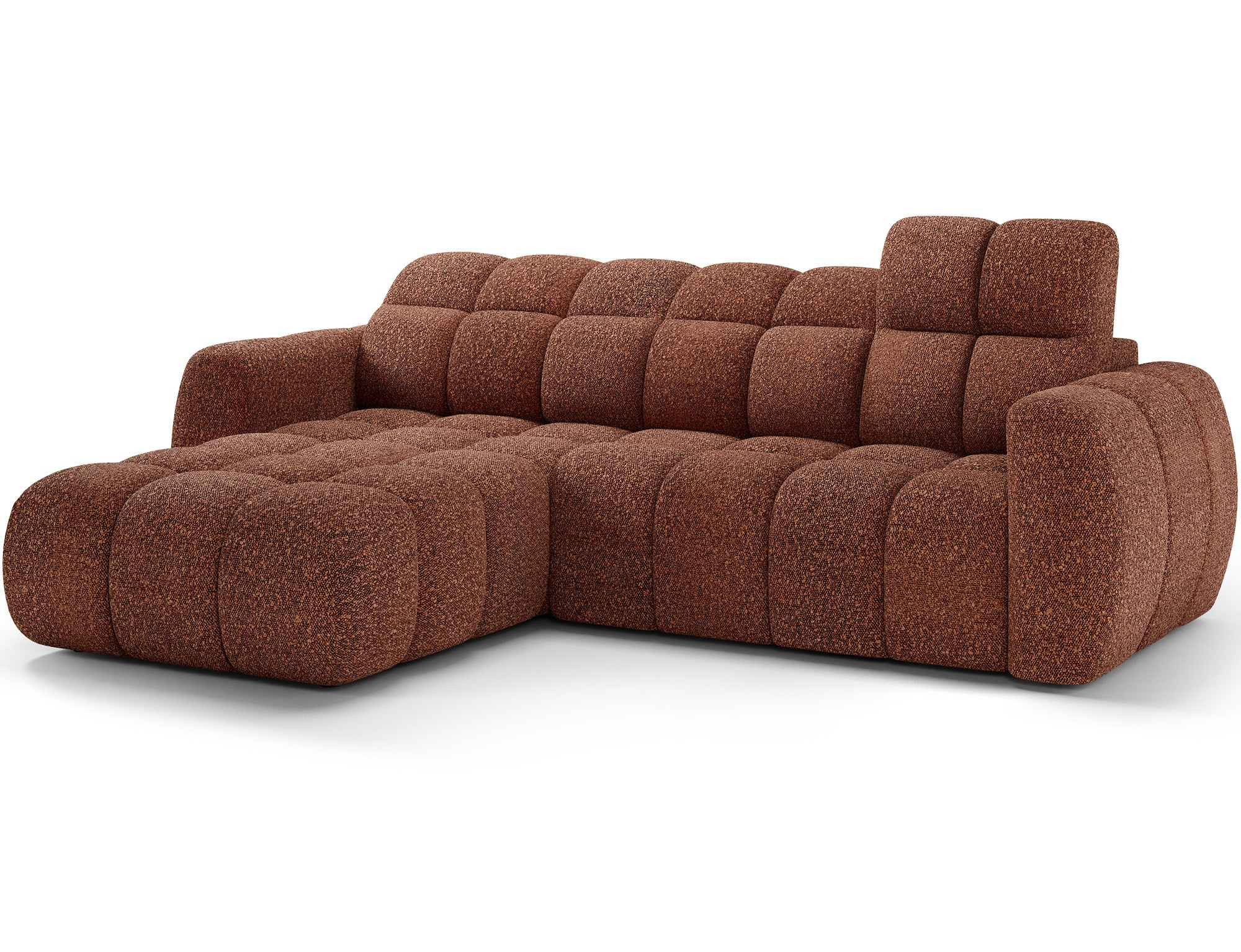 The Fanito corner sofa is a modern, spacious L-shaped sectional designed for the living room, distinguished by its solid, rounded silhouette, deep seat, and segmented tufting that highlights its designer yet cozy character—perfect for a home relaxation zone. The model measures 288 × 200 × 105 cm and weighs 130.6 kg, ensuring stability and everyday comfort. The seat filling combines Type B wave springs, HR3030 high-resilience foam, and 150 g/m² quilted wadding, providing elasticity, comfort, and resistance to sagging, while the backrest is reinforced with upholstery straps and profiled T2316 polyurethane foam for ergonomic back support. As a sleeper sectional, it offers a practical sleeping area of 85 × 232 × 47 cm, and the electric seat extension (actuator) of 28 cm lets you enlarge the lounging surface quickly and effortlessly. Additionally, the headrest mechanism with a return spring allows convenient adjustment of head support, making the Fanito corner sofa an excellent choice for anyone seeking a comfortable pull-out sectional that blends style, functionality, and high build quality.