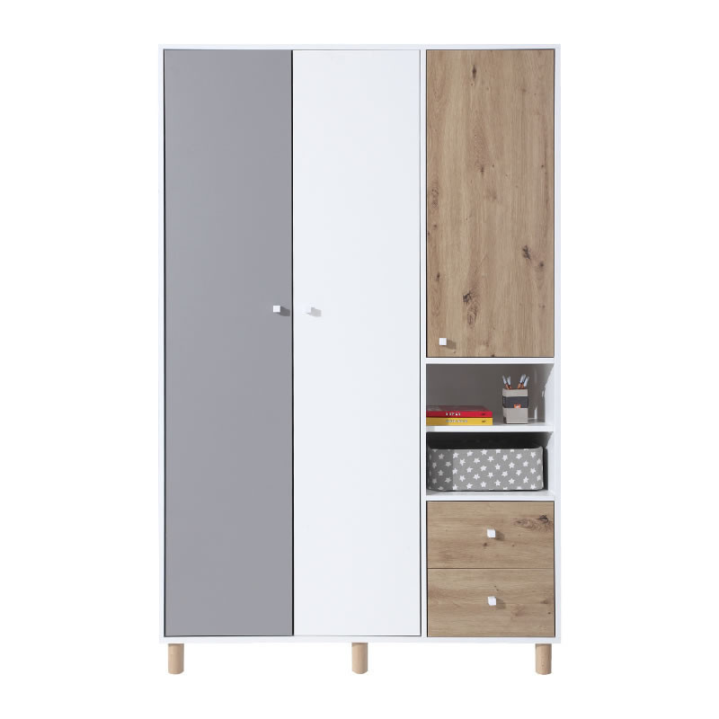 A FARO rendszerből származó ruhásszekrény Fehér Lux/Tölgy Artisan/Szürke színben készül.