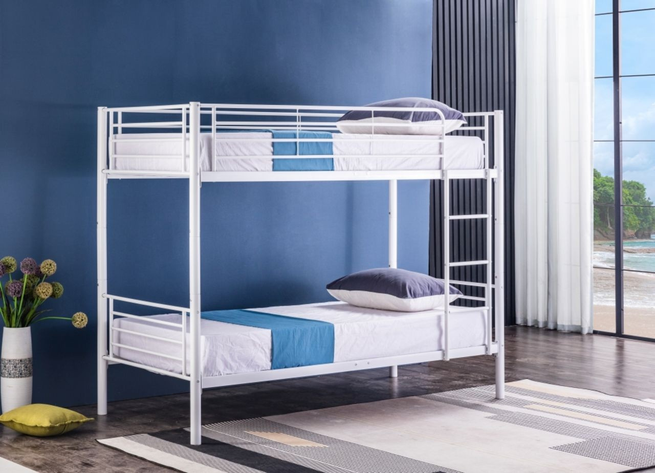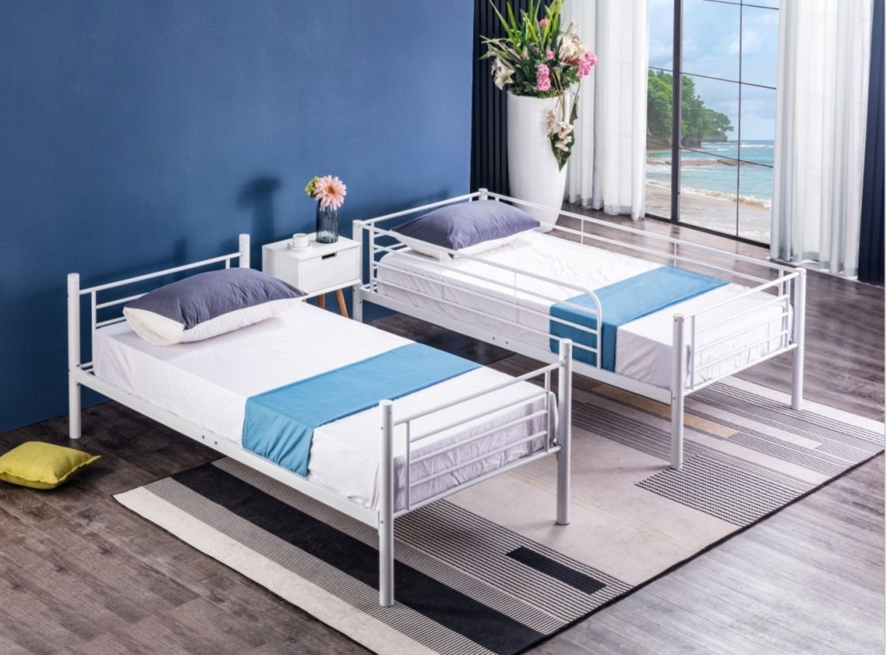 Emeletes ágy Méretek: - teljes hossz: 211 cm - teljes szélesség: 100 cm - teljes magasság: 167 cm - emeletek közötti magasság: 94 cm - korlát magassága: 30 cm - fekvőfelület: 90x200 cm Anyag: - porfestett fém Szín: - fehér