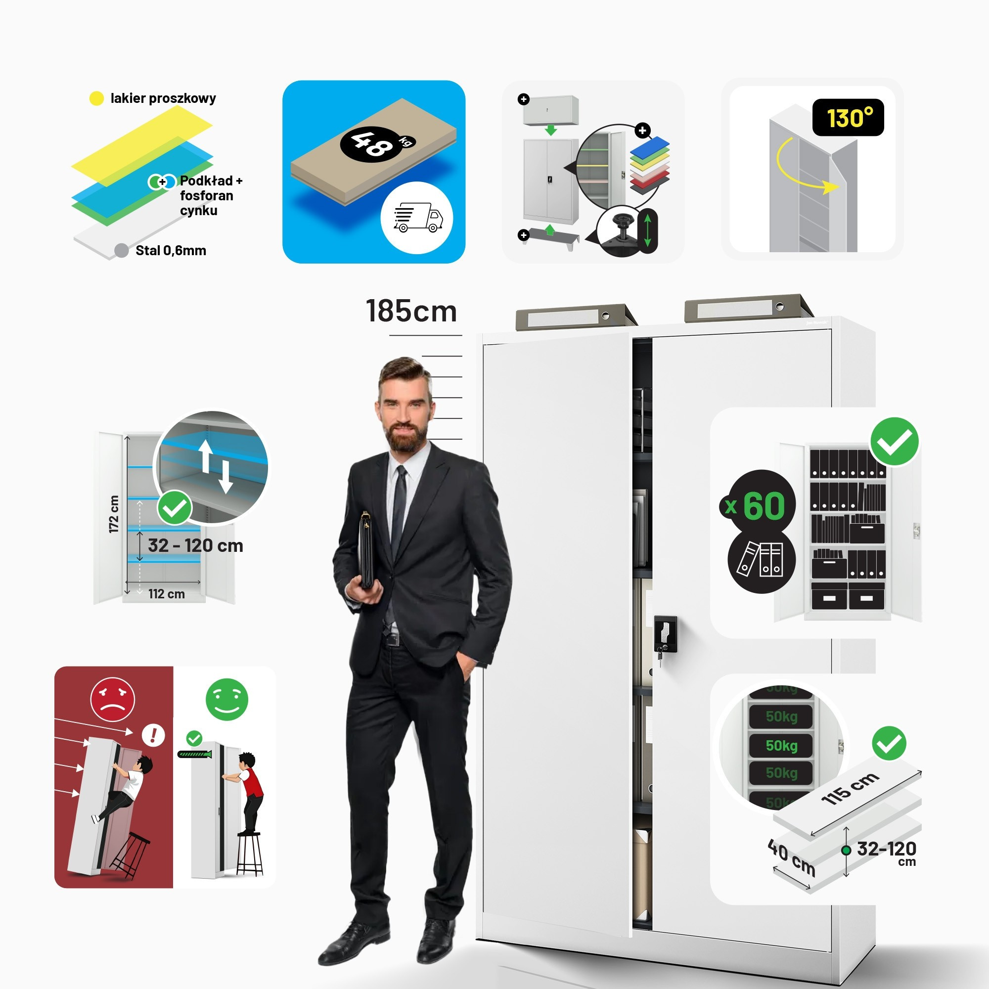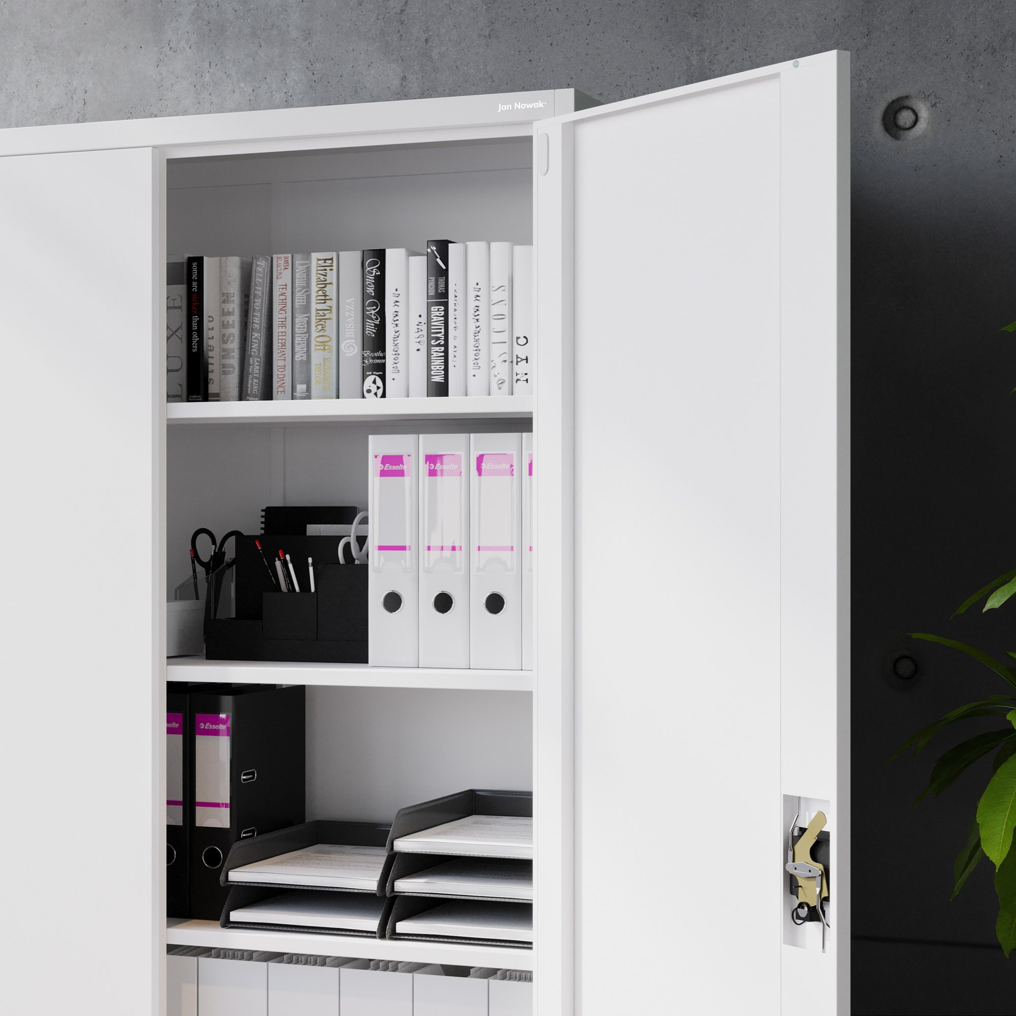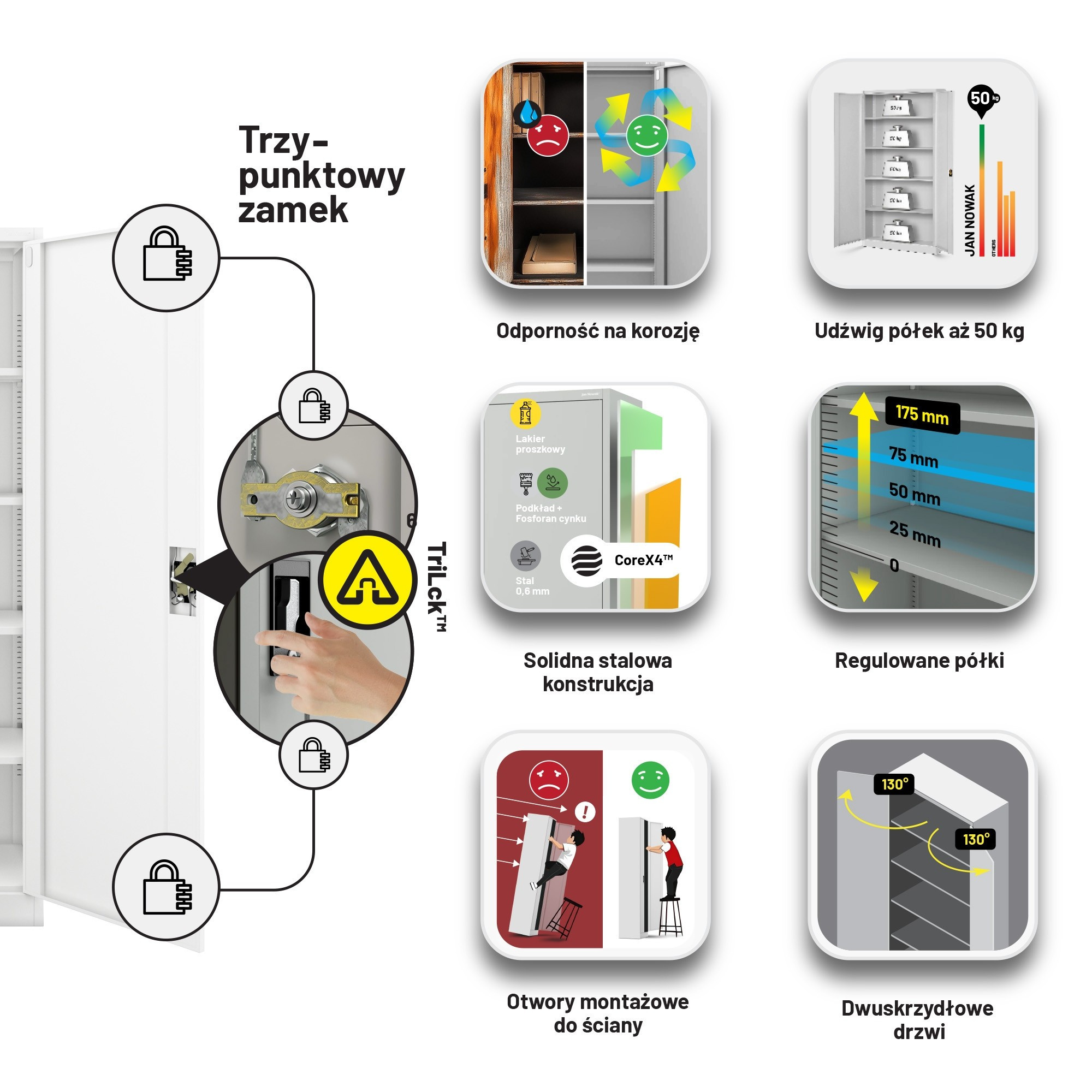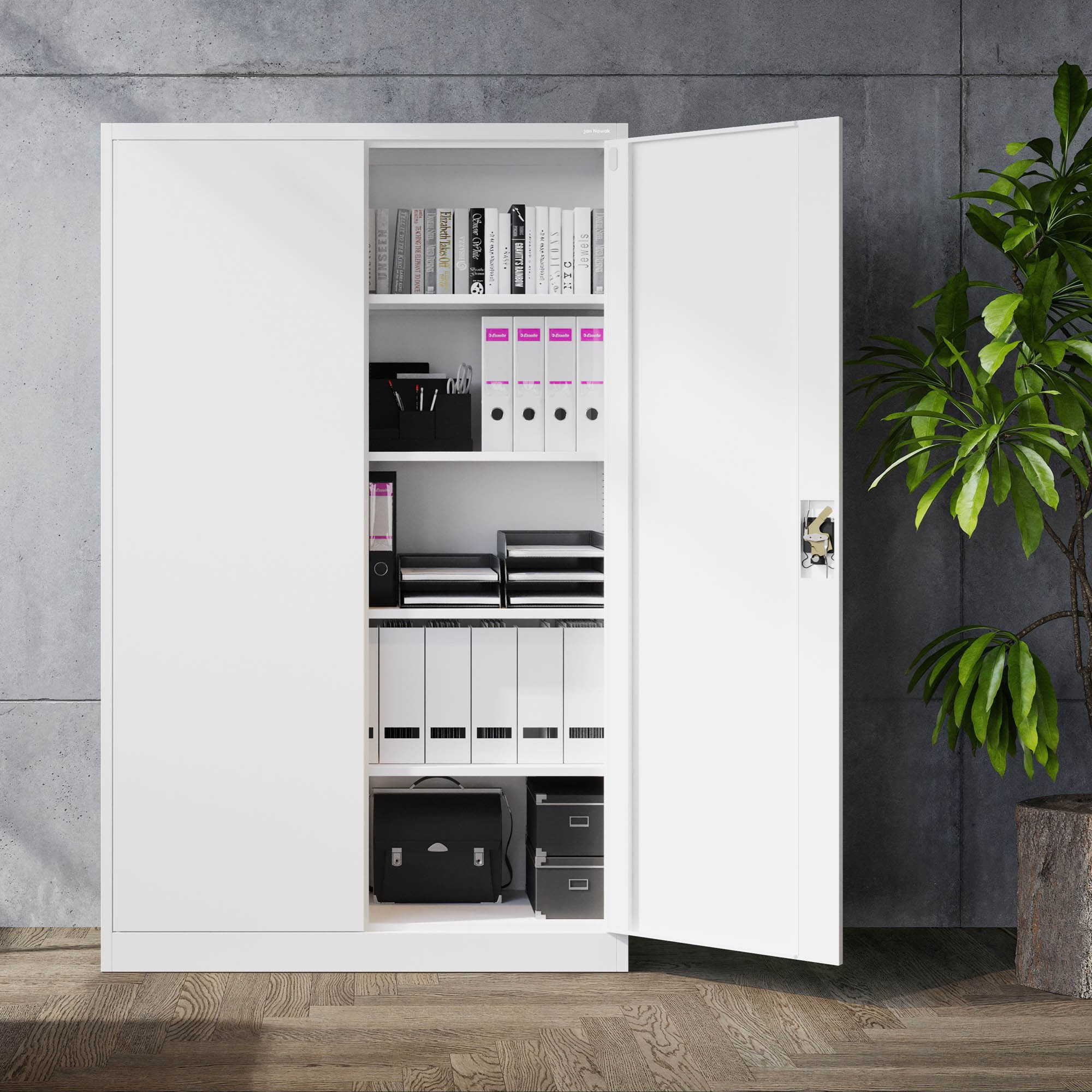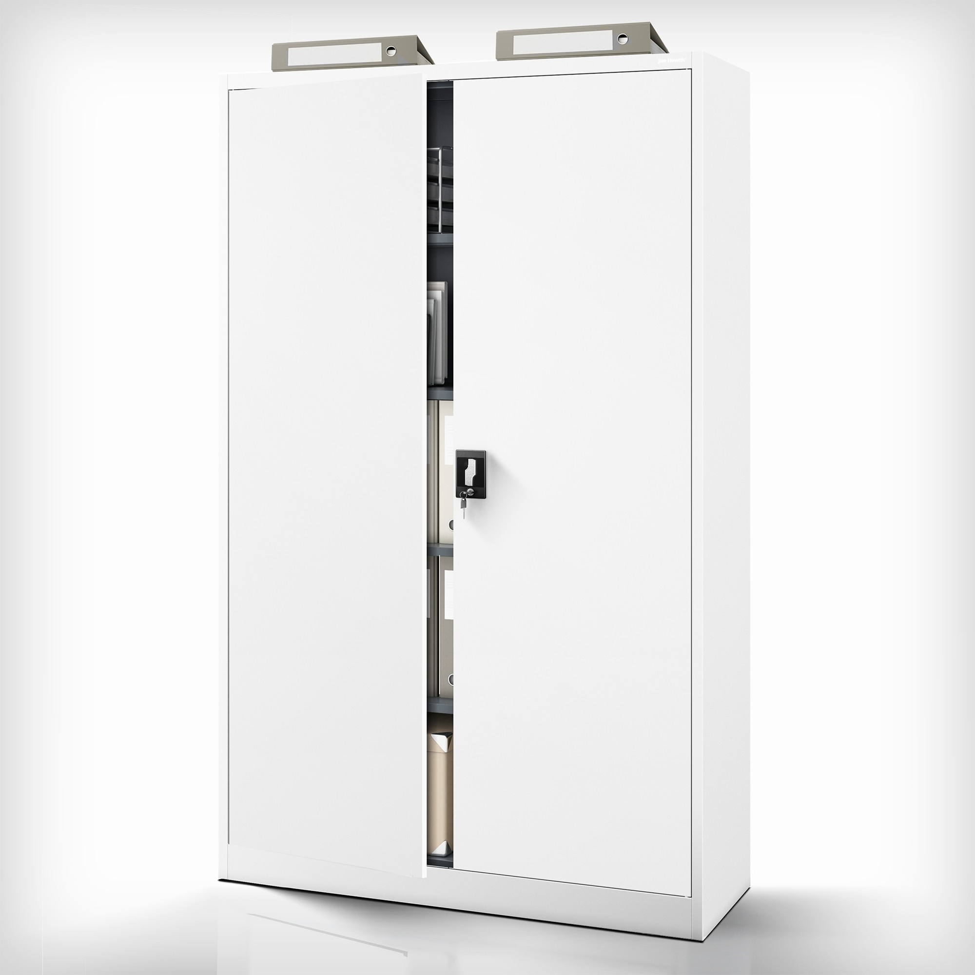 A JAN II szekrény ötvözi a funkcionalitást, a tartósságot és az esztétikus megjelenést. Úgy van tervezve, hogy megfeleljen a legigényesebb tárolási követelményeknek is. Fehér színe (RAL 9003) könnyen illeszkedik bármilyen belső térbe, és friss, modern megjelenést kölcsönöz neki.