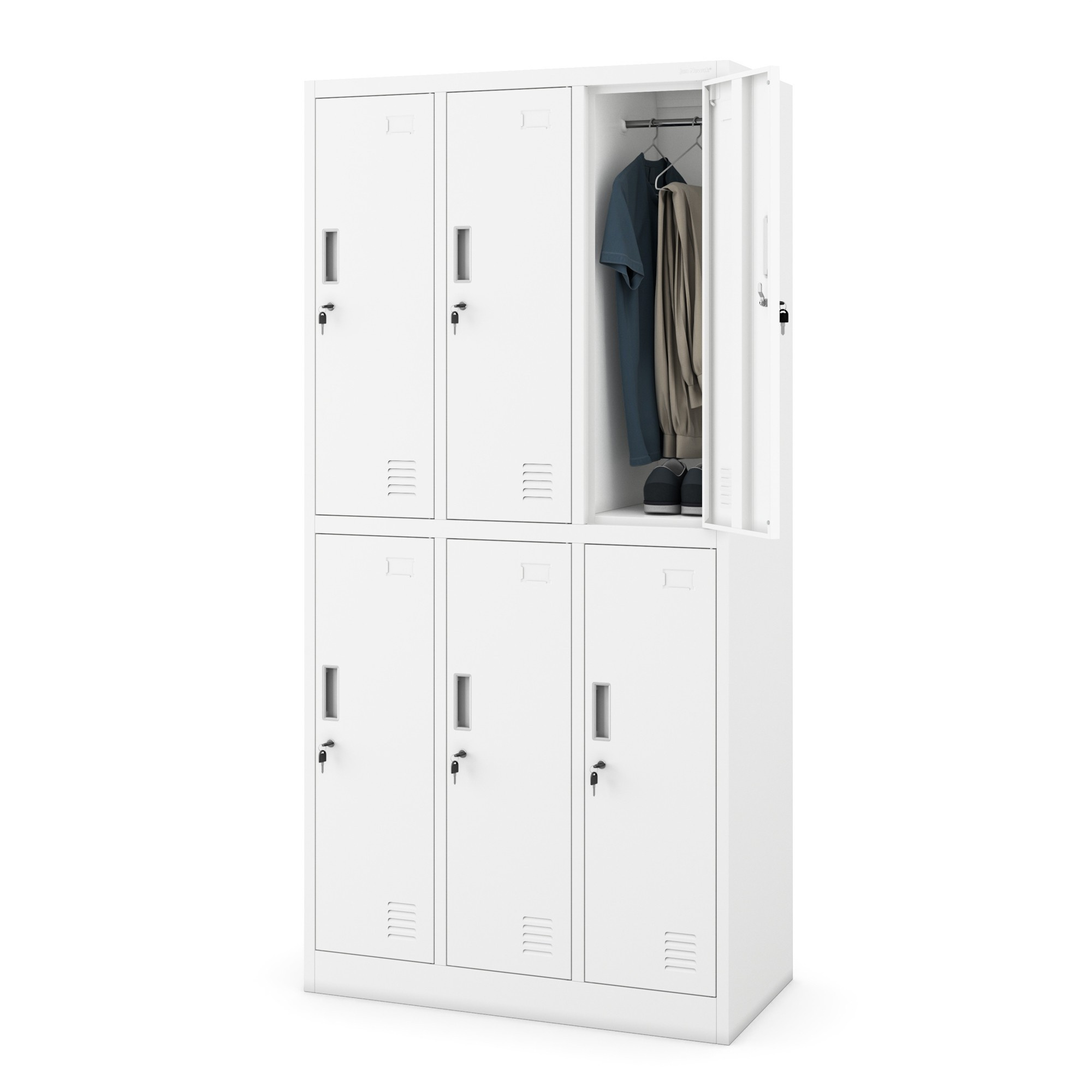Az átgondolt kialakításnak és a hat különálló rekeszre való felosztásnak köszönhetően az IGOR szekrény ideális kisebb helyiségekbe is. Minden rekesz elegendő helyet kínál tartalék ruházat, hátizsák, táska, cipő és egyéb személyes tárgyak tárolására. Az egyes rekeszekbe integrált vállfa rúd lehetővé teszi a ruhák kényelmes felakasztását, megakadályozva azok gyűrődését, és biztosítva, hogy ruházata mindig friss és rendezett megjelenésű legyen.