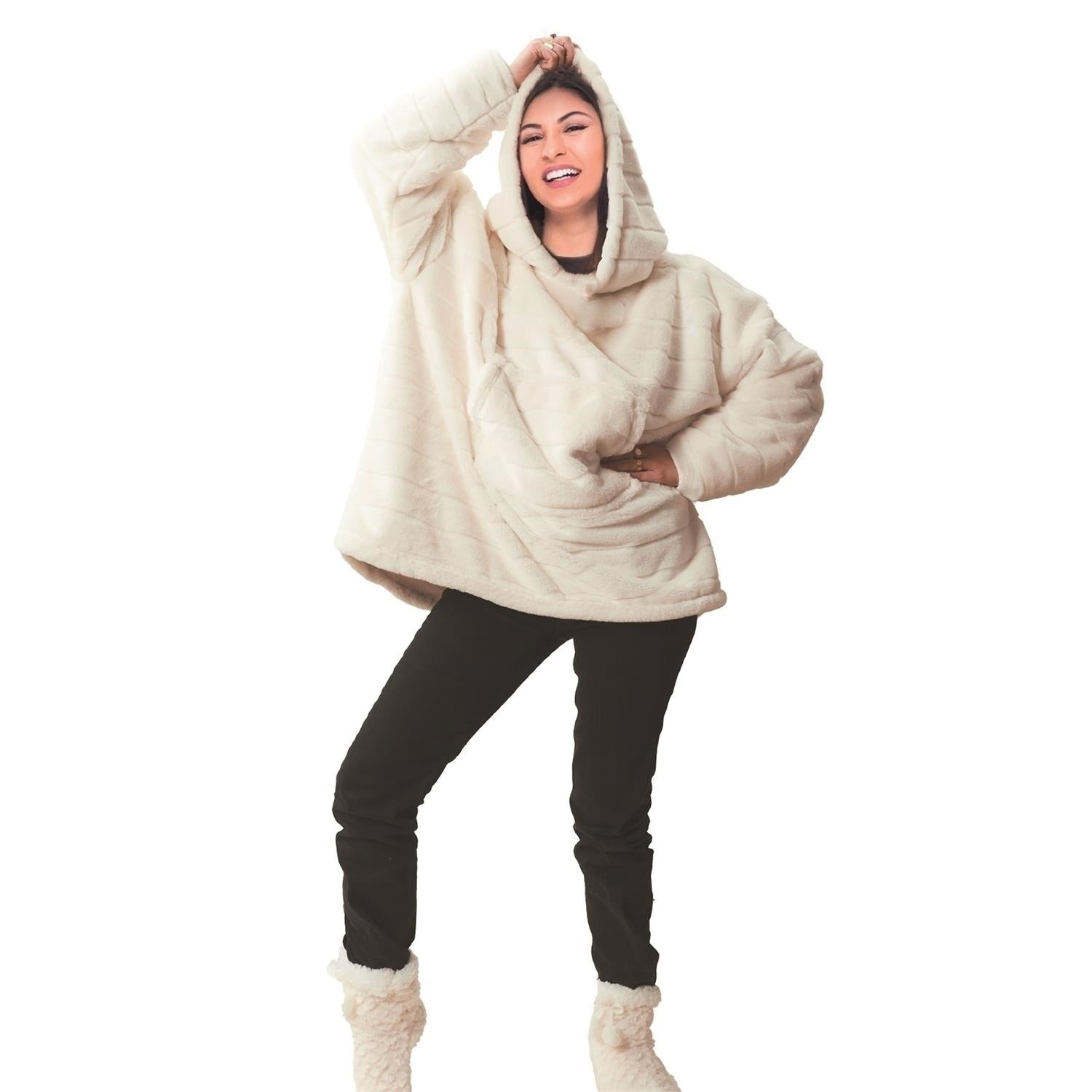 A hosszú sherpa pulóver ideális takaró a hosszú téli estékre. A snuddie pulóver kapucnival és elülső zsebbel van ellátva. Nagyon kellemes és meleg tapintású anyag garantálja a hosszú, kényelmes filmestéket. Mosás legfeljebb 30 fokon. Ne vasaljon. Szövet súlya 320g/m2, anyag 100% poliészter