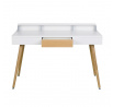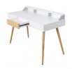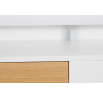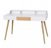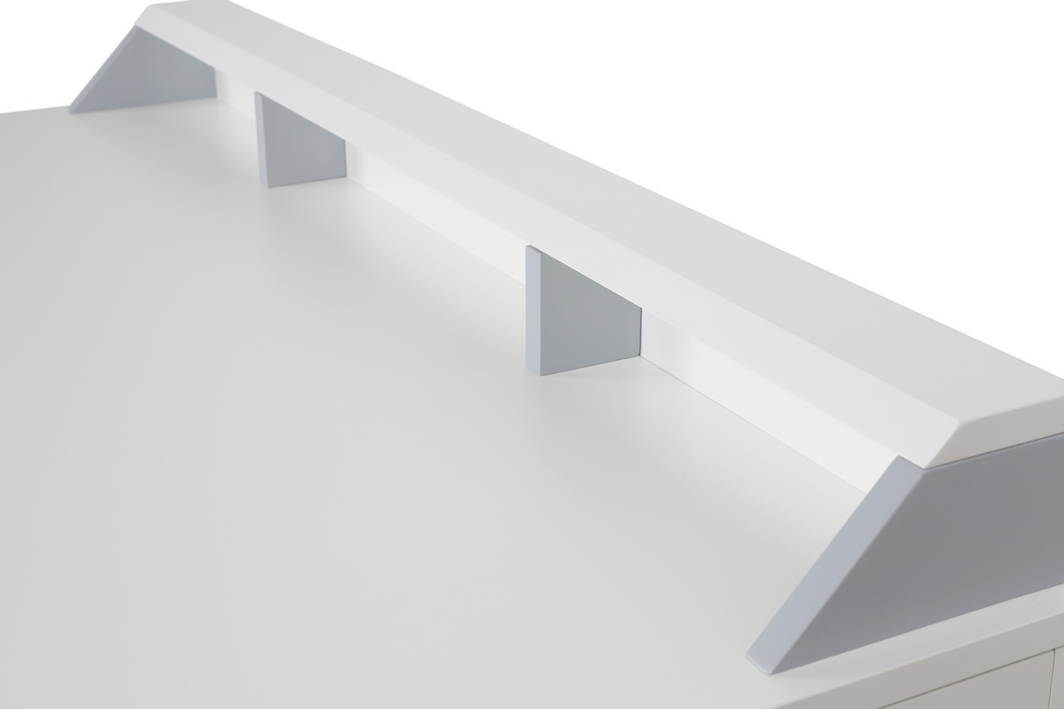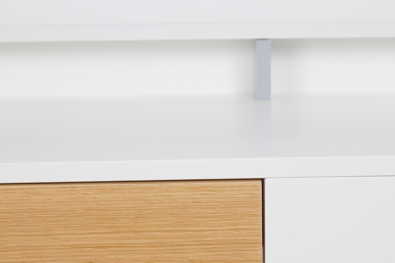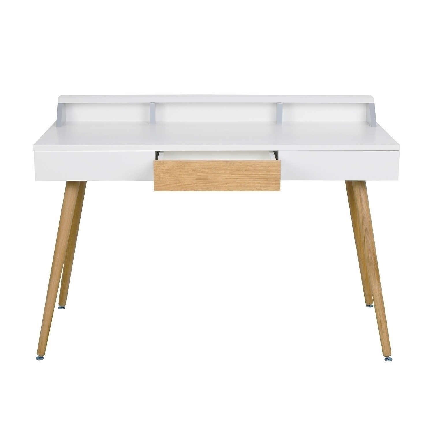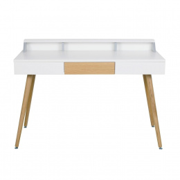 A Skans íróasztal nemcsak az irodában, hanem otthoni környezetben is a munkavégzés helye. Az íróasztal fehér asztallappal és fa lábakkal nemcsak munkasztalként, hanem az otthoni iroda díszeként is szolgál majd. Az asztal alapját négy bükkfa, lakkozott láb alkotja, amelyek finoman szétterülnek oldalra, utalva a vintage stílusra. A fehér széles lap laminált MDF lapból készült, ami rendkívül tartóssá teszi. Az asztal alacsony, 9,5 cm magas falakkal rendelkezik, amelyek speciális helyet hoznak létre az irodai kellékek rendezésére. A válaszfalak segítenek rendet tartani az asztalon. Az asztal érdekes kontrasztos eleme a 11 cm magas előlapú fiók, amely természetes fa hatású furnérral van borítva. A fiók a kiváló minőségű sínek használatának köszönhetően nagyon finoman nyílik. A fal magassága: 9,5 cm Mély. rekesz: 7 cm. Fő. a fiók belsejében: 23,5 cm Szél. a fiókában: 35 cm szélesség. középső válaszfalak: 45 cm, külső: 31,5 cm Lábak távolsága: 125 cm