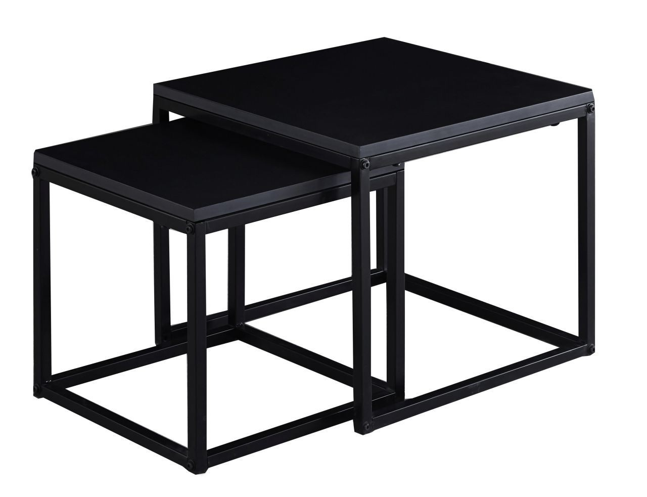 Méretek: *nagyobb asztal: - asztallap: 50x50 cm - magasság: 43 cm *kisebb asztal: - asztallap: 40x40 cm - magasság: 38 cm Anyag: - asztallap: furnér - lábak: porszórt acél Szín: - asztallap: fekete - szerkezet: fekete