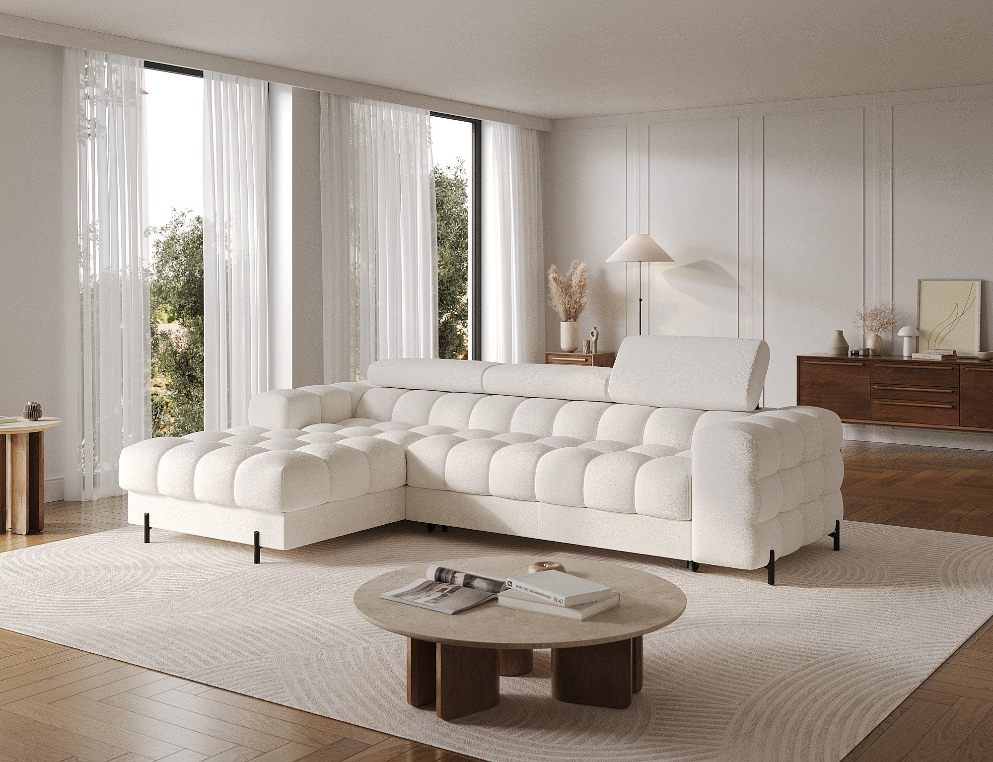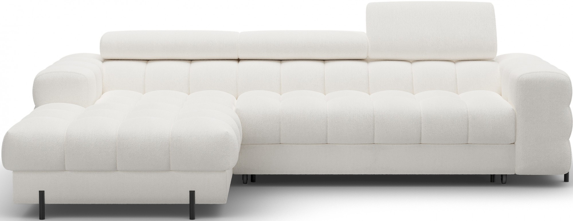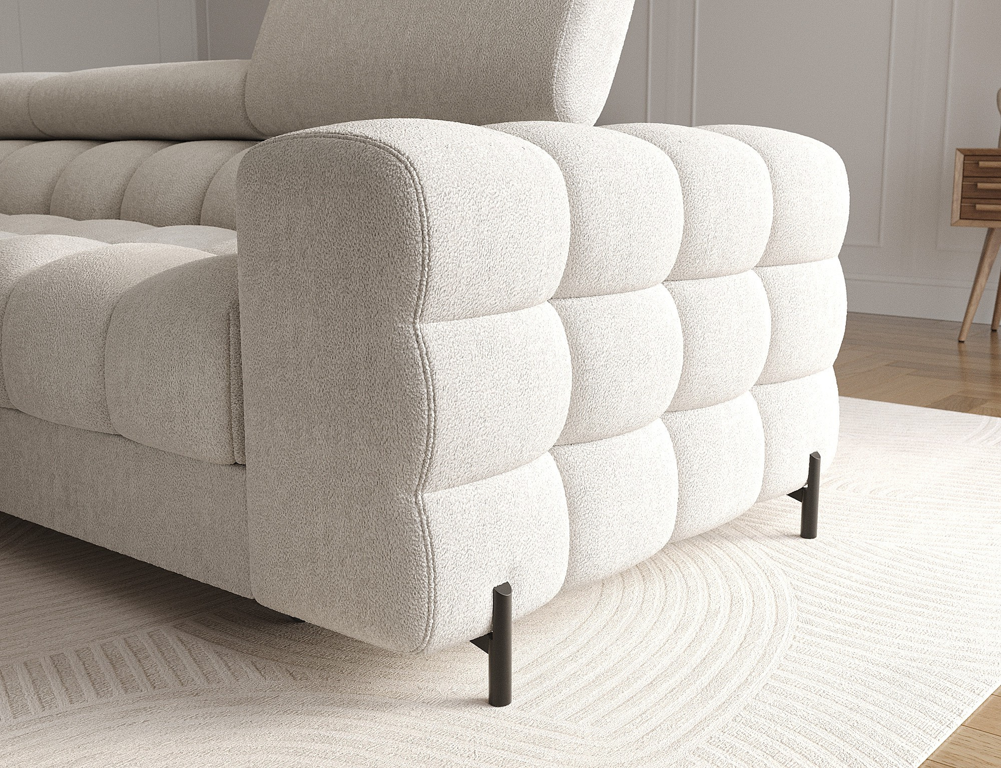 The Felro corner sofa is a combination of modern design, comfort, and functionality. The seat of the sofa is filled with B-type wave springs as well as high-quality T3030 and HR3030 foam, ensuring exceptional comfort for everyday use and relaxation. This makes the furniture not only soft and flexible but also resistant to deformation, guaranteeing long-lasting durability.The sturdy construction is supported by metal legs, powder-coated in black, adding an elegant and modern touch to the overall design. Felro also features a sleeping function, making it a perfect choice for a living room where both style and practicality matter. The "Dolphin" unfolding mechanism allows for an easy and quick transformation of the sofa into a comfortable sleeping space.An additional advantage is the upholstered back, ensuring that the sofa looks great from every angle and can be placed either against a wall or in the center of the room. The entire design follows a modern style, making Felro a perfect fit for contemporary interiors, adding both elegance and functionality.