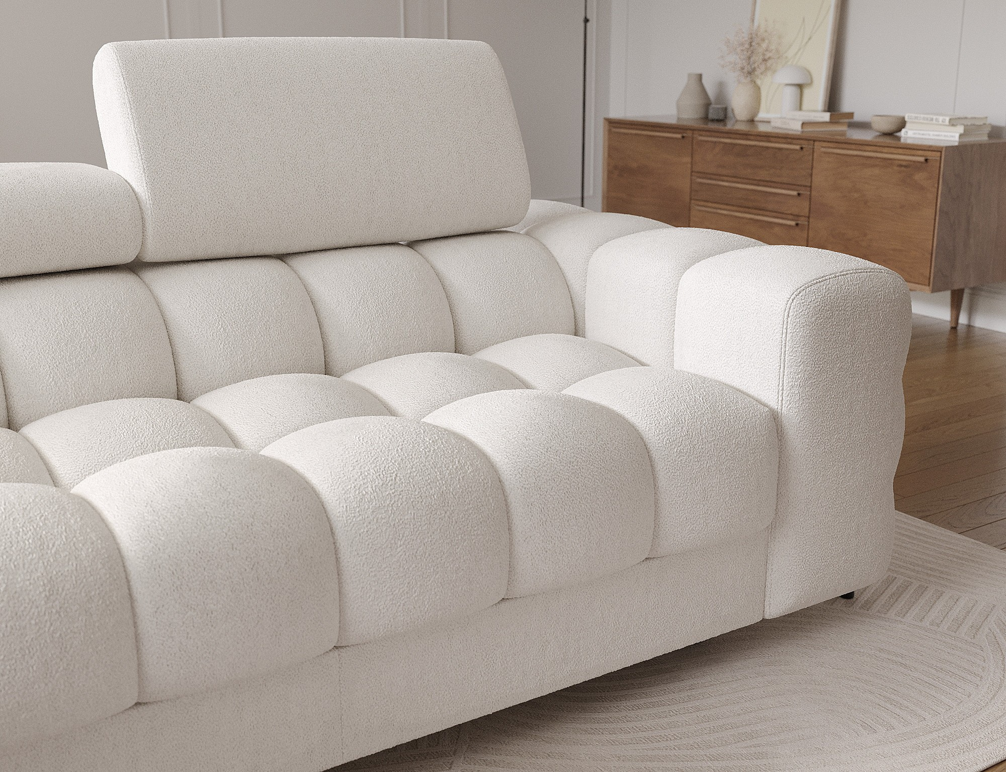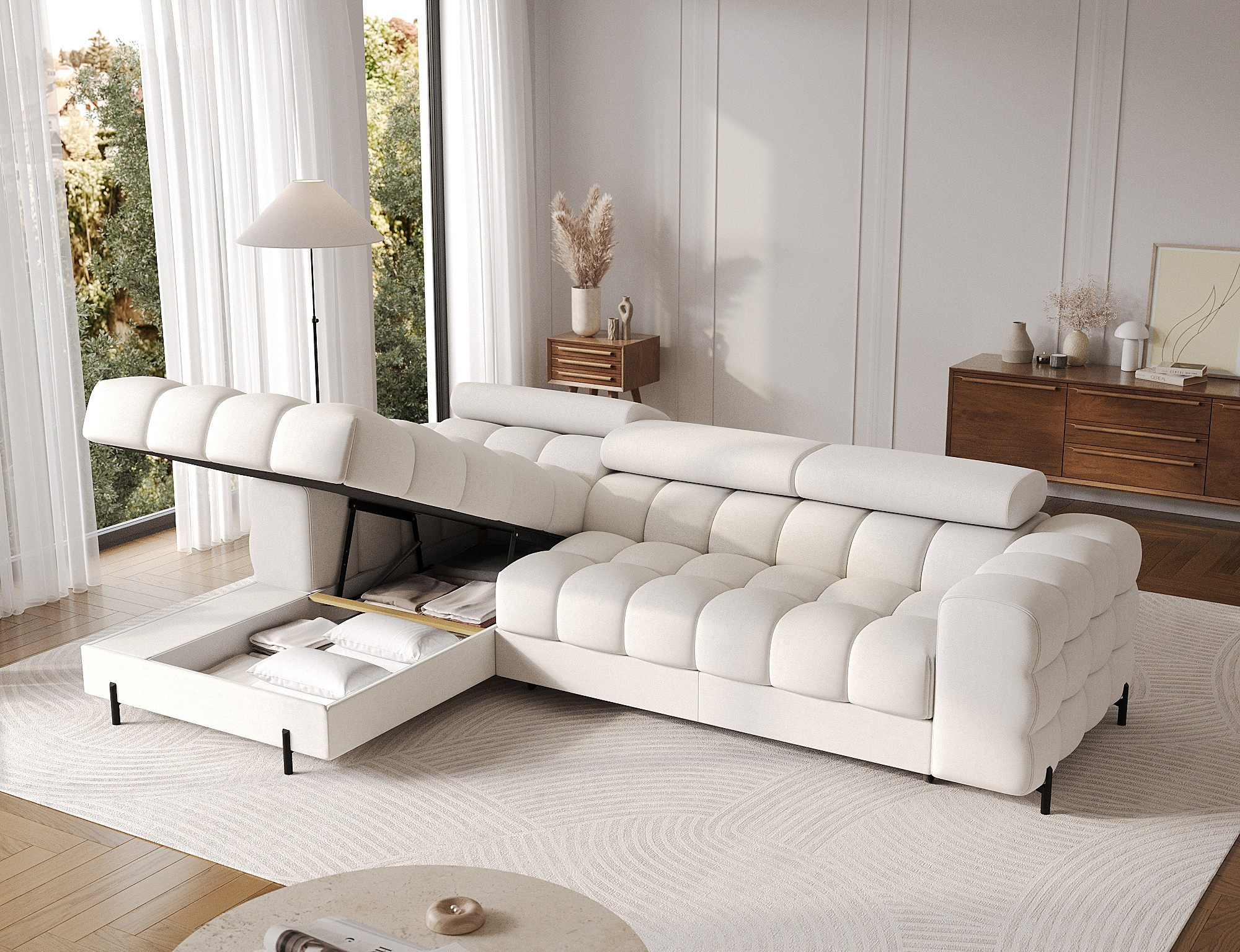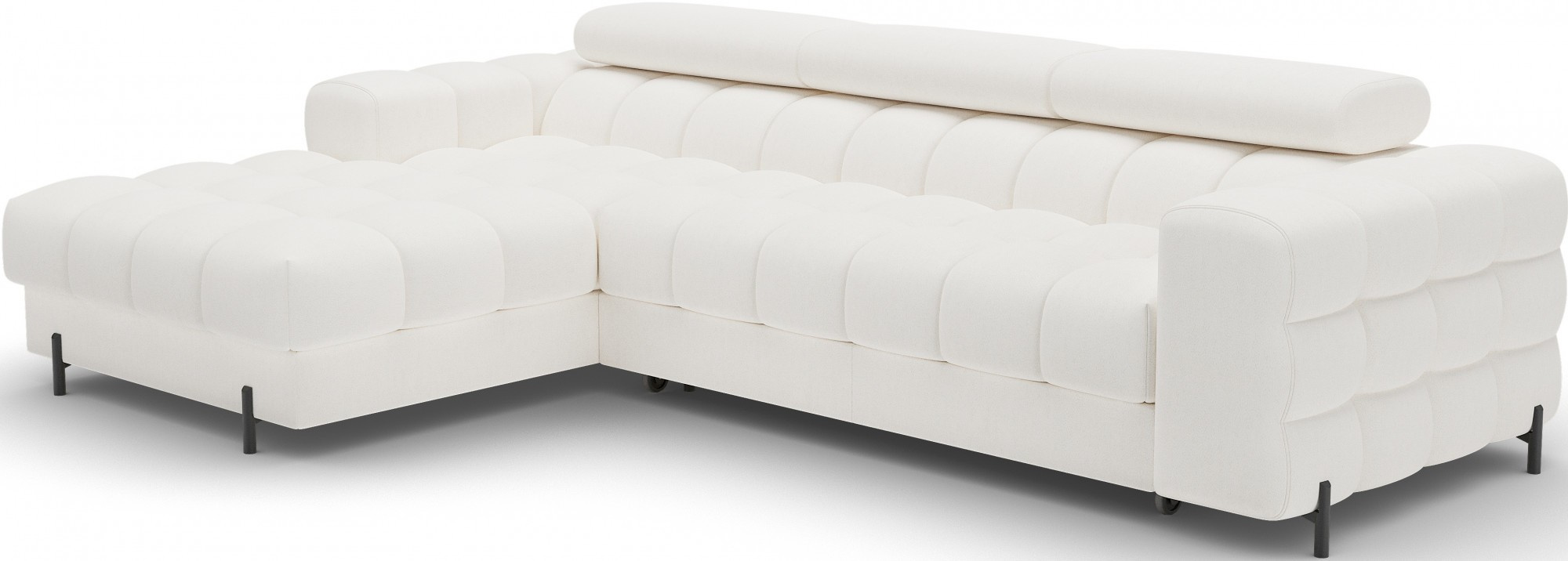 The Felro corner sofa is a combination of modern design, comfort, and functionality. The seat of the sofa is filled with B-type wave springs as well as high-quality T3030 and HR3030 foam, ensuring exceptional comfort for everyday use and relaxation. This makes the furniture not only soft and flexible but also resistant to deformation, guaranteeing long-lasting durability.The sturdy construction is supported by metal legs, powder-coated in black, adding an elegant and modern touch to the overall design. Felro also features a sleeping function, making it a perfect choice for a living room where both style and practicality matter. The "Dolphin" unfolding mechanism allows for an easy and quick transformation of the sofa into a comfortable sleeping space.An additional advantage is the upholstered back, ensuring that the sofa looks great from every angle and can be placed either against a wall or in the center of the room. The entire design follows a modern style, making Felro a perfect fit for contemporary interiors, adding both elegance and functionality.