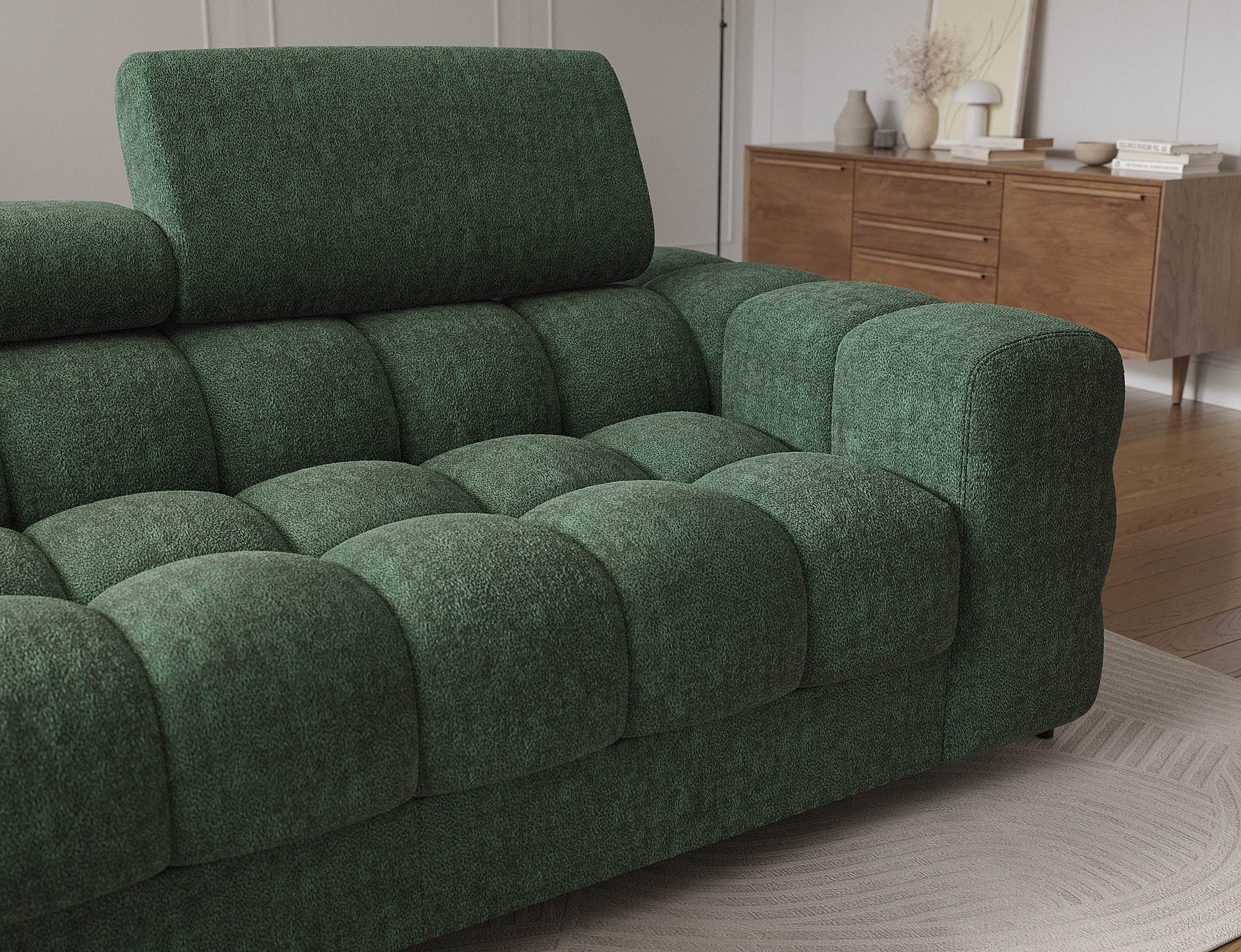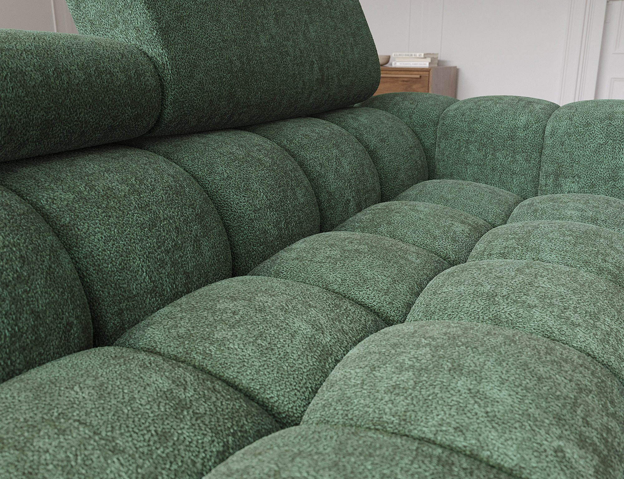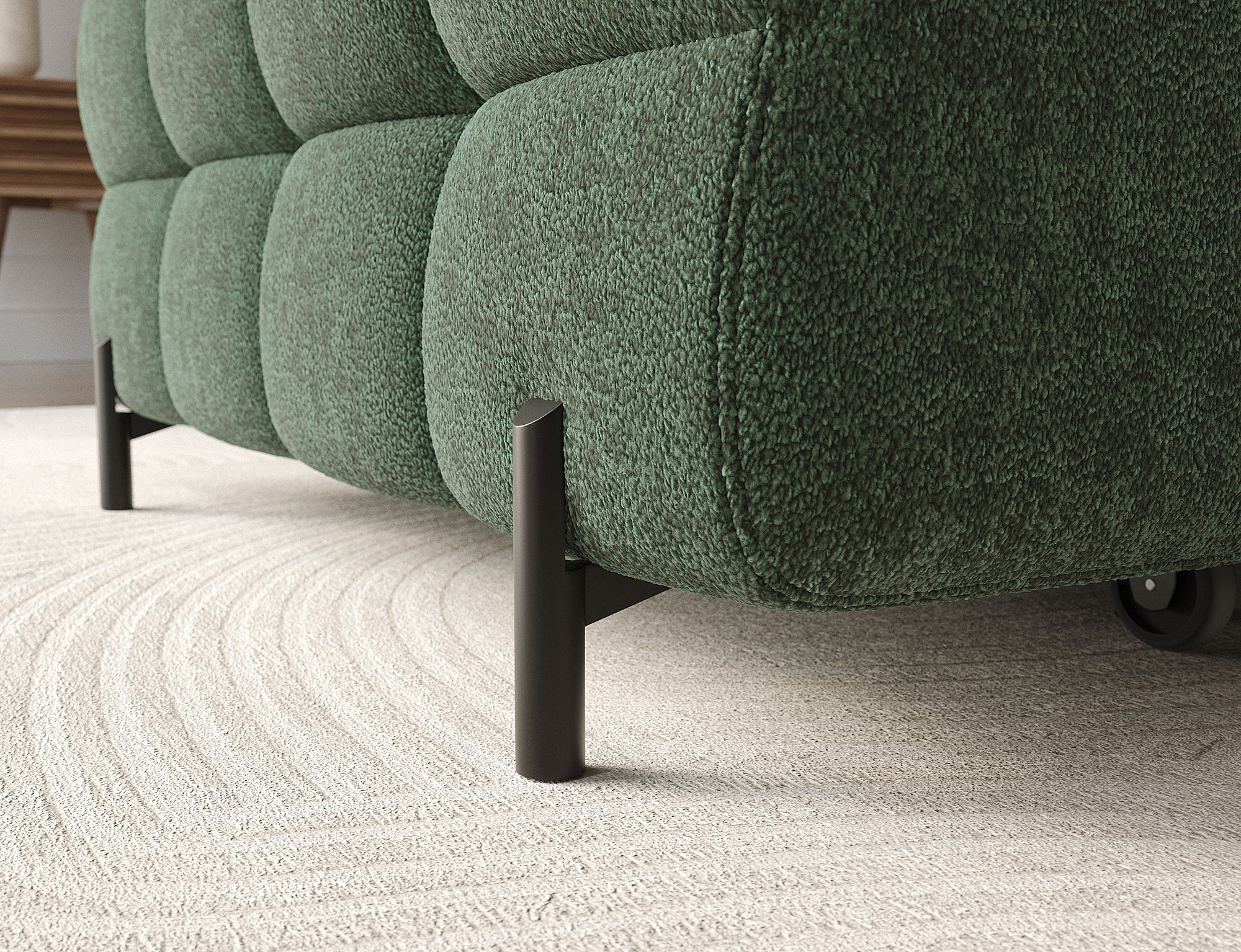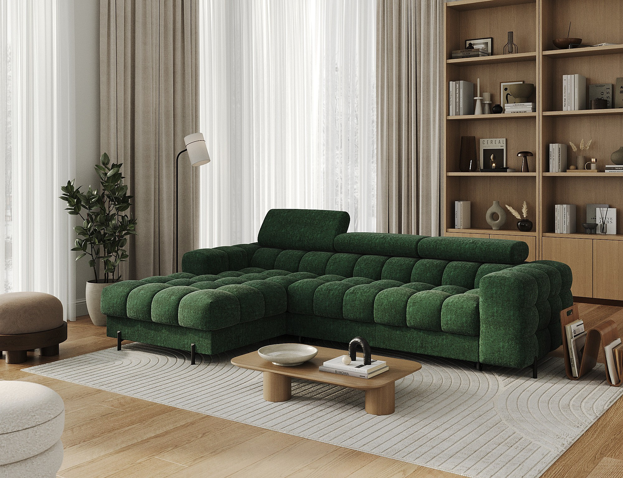 The Felro corner sofa is a combination of modern design, comfort, and functionality. The seat of the sofa is filled with B-type wave springs as well as high-quality T3030 and HR3030 foam, ensuring exceptional comfort for everyday use and relaxation. This makes the furniture not only soft and flexible but also resistant to deformation, guaranteeing long-lasting durability.The sturdy construction is supported by metal legs, powder-coated in black, adding an elegant and modern touch to the overall design. Felro also features a sleeping function, making it a perfect choice for a living room where both style and practicality matter. The "Dolphin" unfolding mechanism allows for an easy and quick transformation of the sofa into a comfortable sleeping space.An additional advantage is the upholstered back, ensuring that the sofa looks great from every angle and can be placed either against a wall or in the center of the room. The entire design follows a modern style, making Felro a perfect fit for contemporary interiors, adding both elegance and functionality.