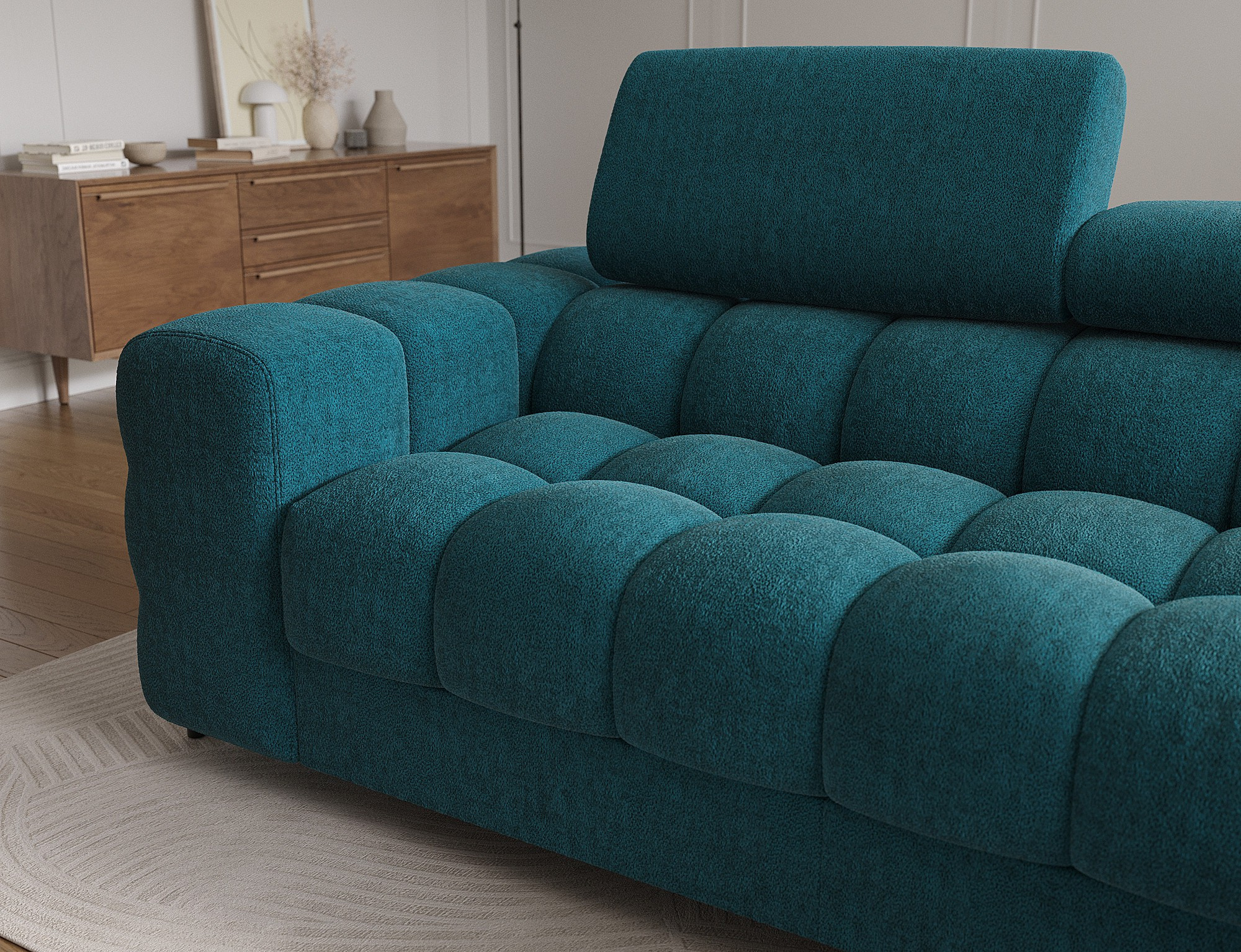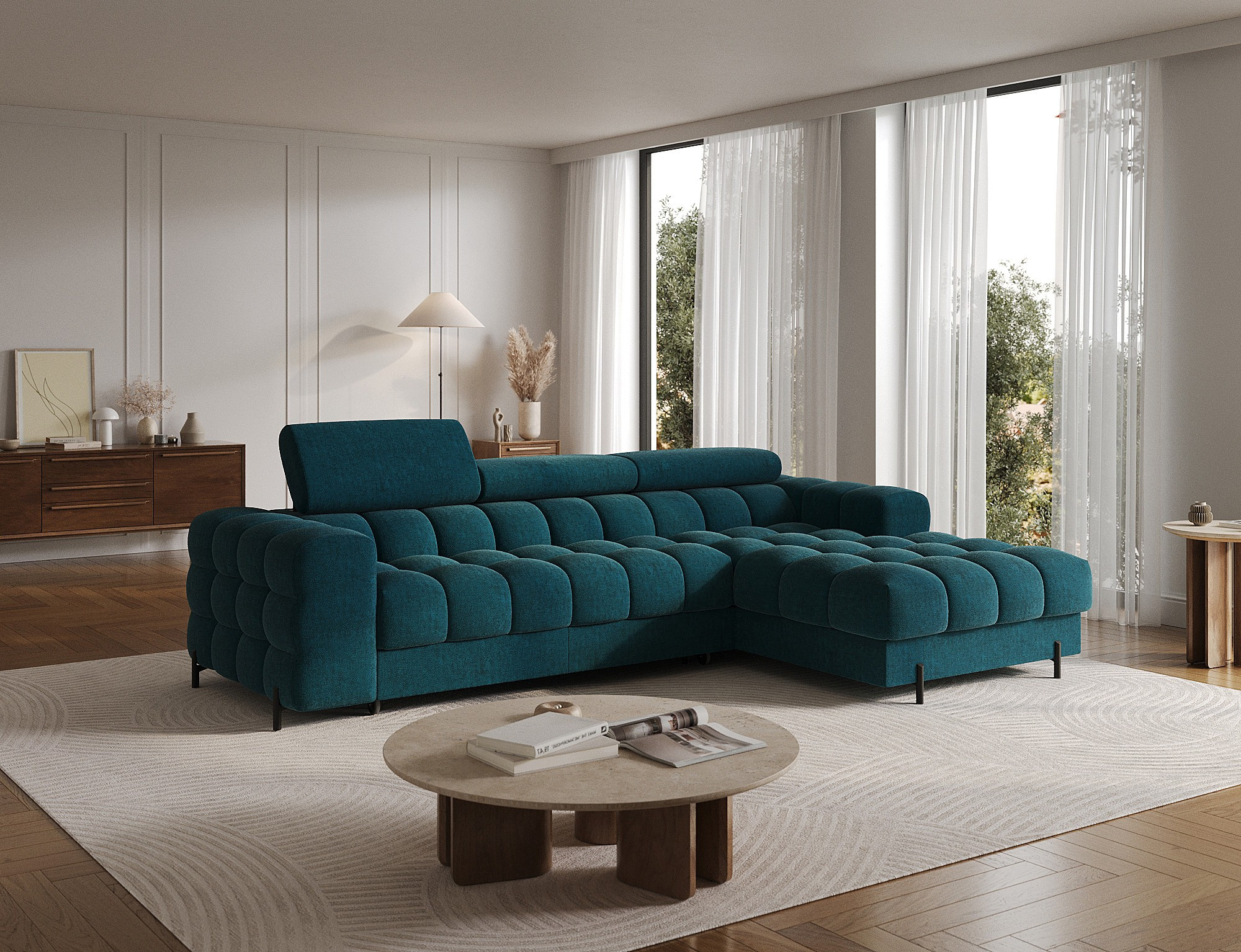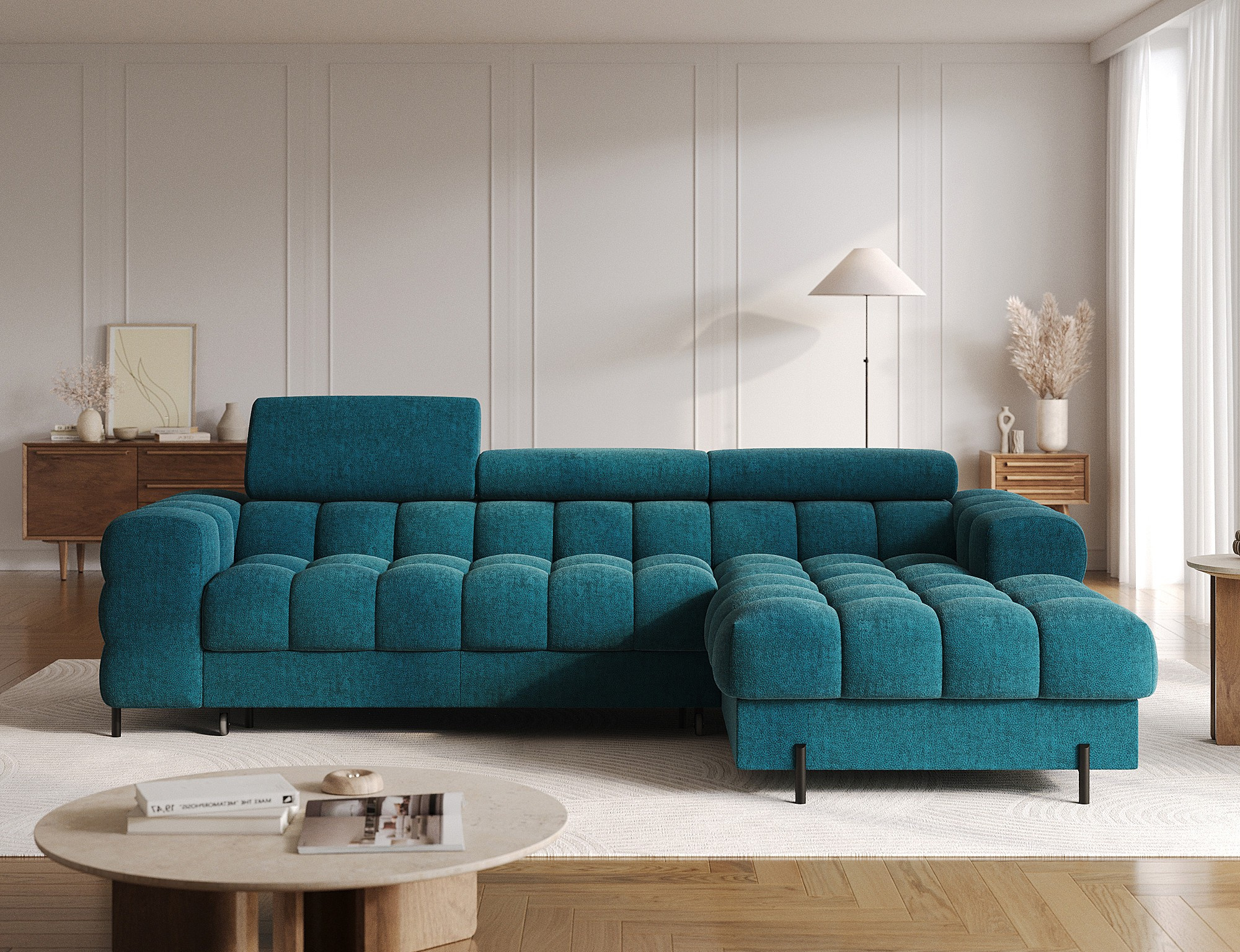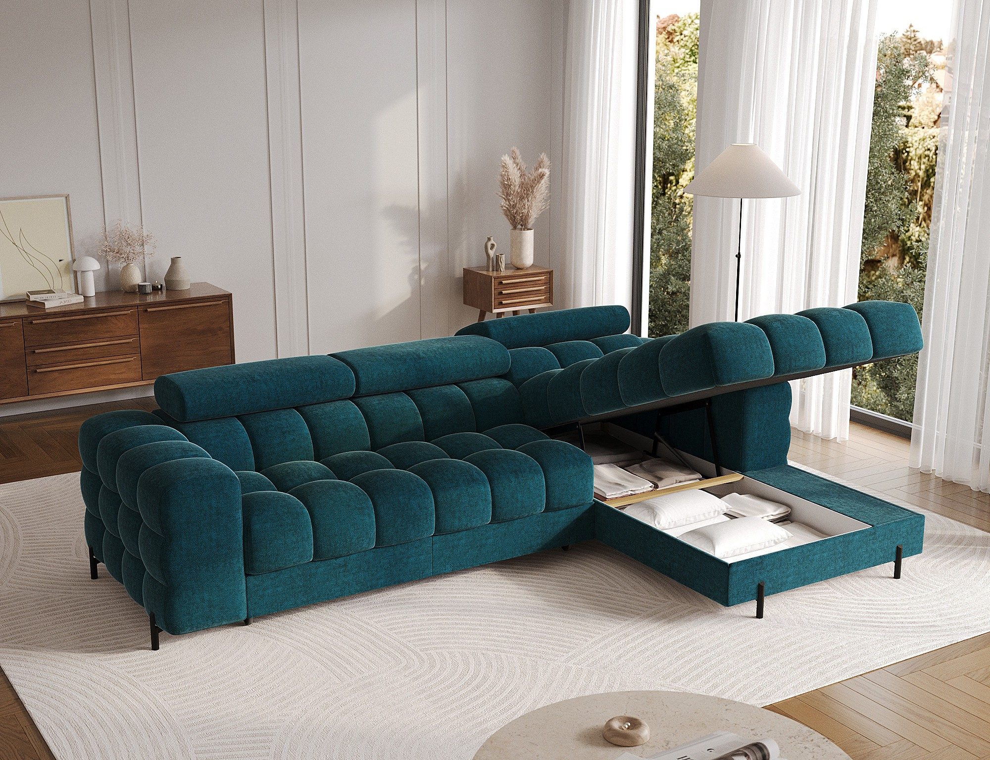 The Felro corner sofa is a combination of modern design, comfort, and functionality. The seat of the sofa is filled with B-type wave springs as well as high-quality T3030 and HR3030 foam, ensuring exceptional comfort for everyday use and relaxation. This makes the furniture not only soft and flexible but also resistant to deformation, guaranteeing long-lasting durability.The sturdy construction is supported by metal legs, powder-coated in black, adding an elegant and modern touch to the overall design. Felro also features a sleeping function, making it a perfect choice for a living room where both style and practicality matter. The "Dolphin" unfolding mechanism allows for an easy and quick transformation of the sofa into a comfortable sleeping space.An additional advantage is the upholstered back, ensuring that the sofa looks great from every angle and can be placed either against a wall or in the center of the room. The entire design follows a modern style, making Felro a perfect fit for contemporary interiors, adding both elegance and functionality.
