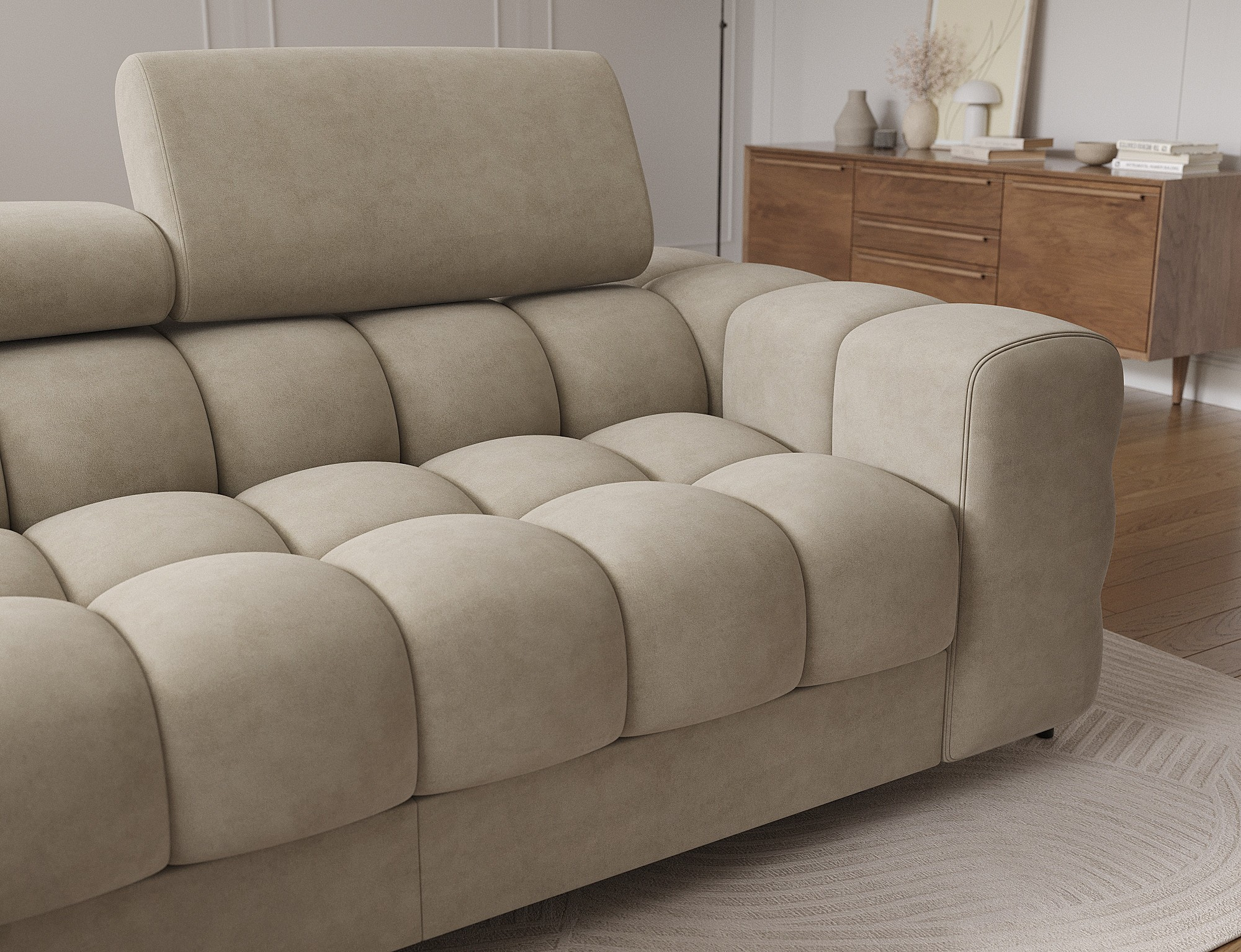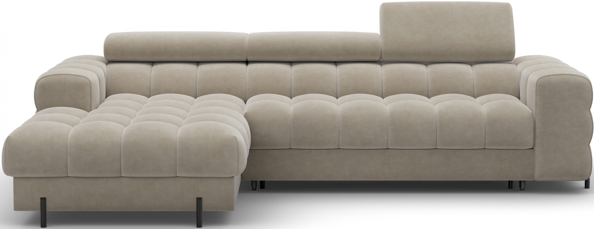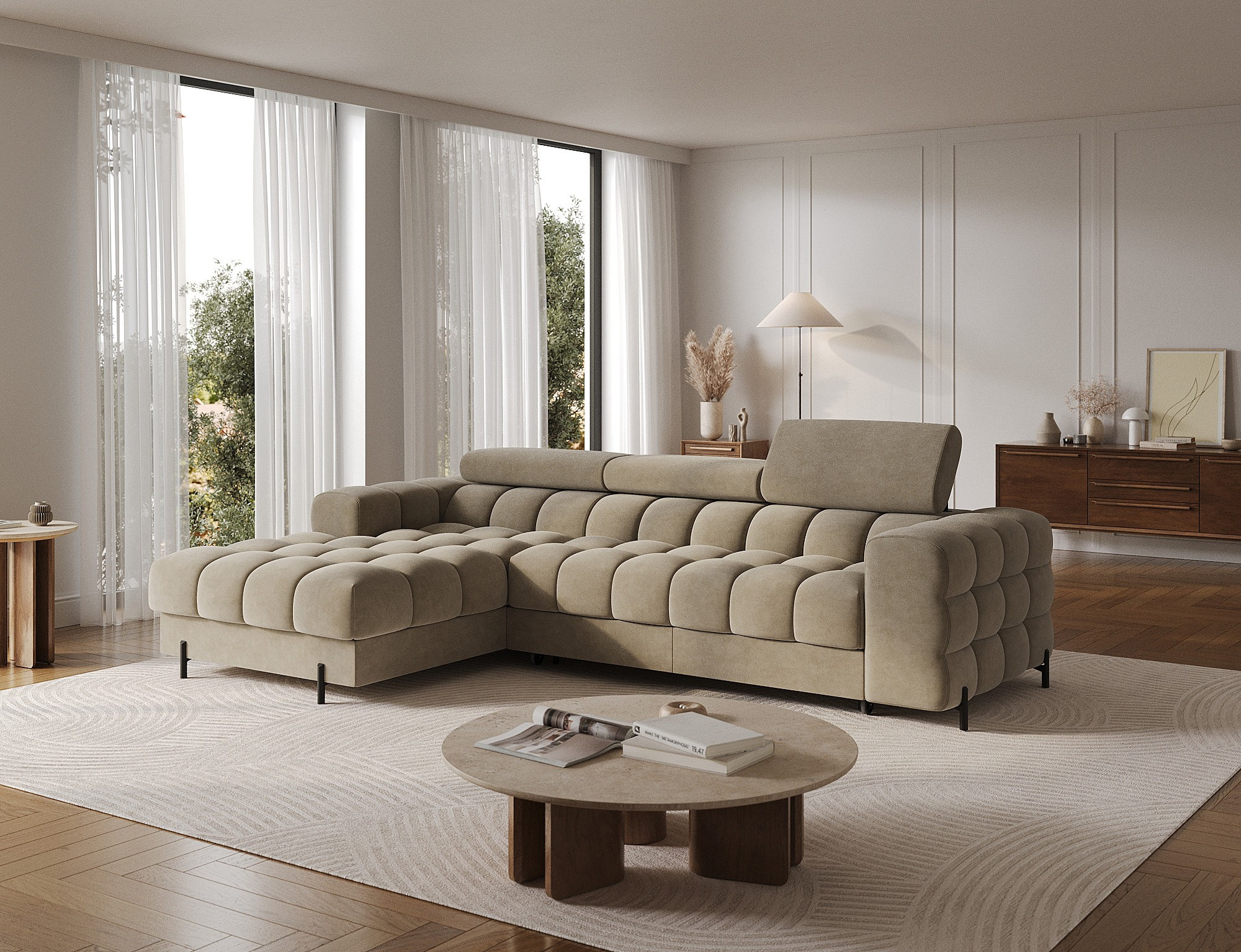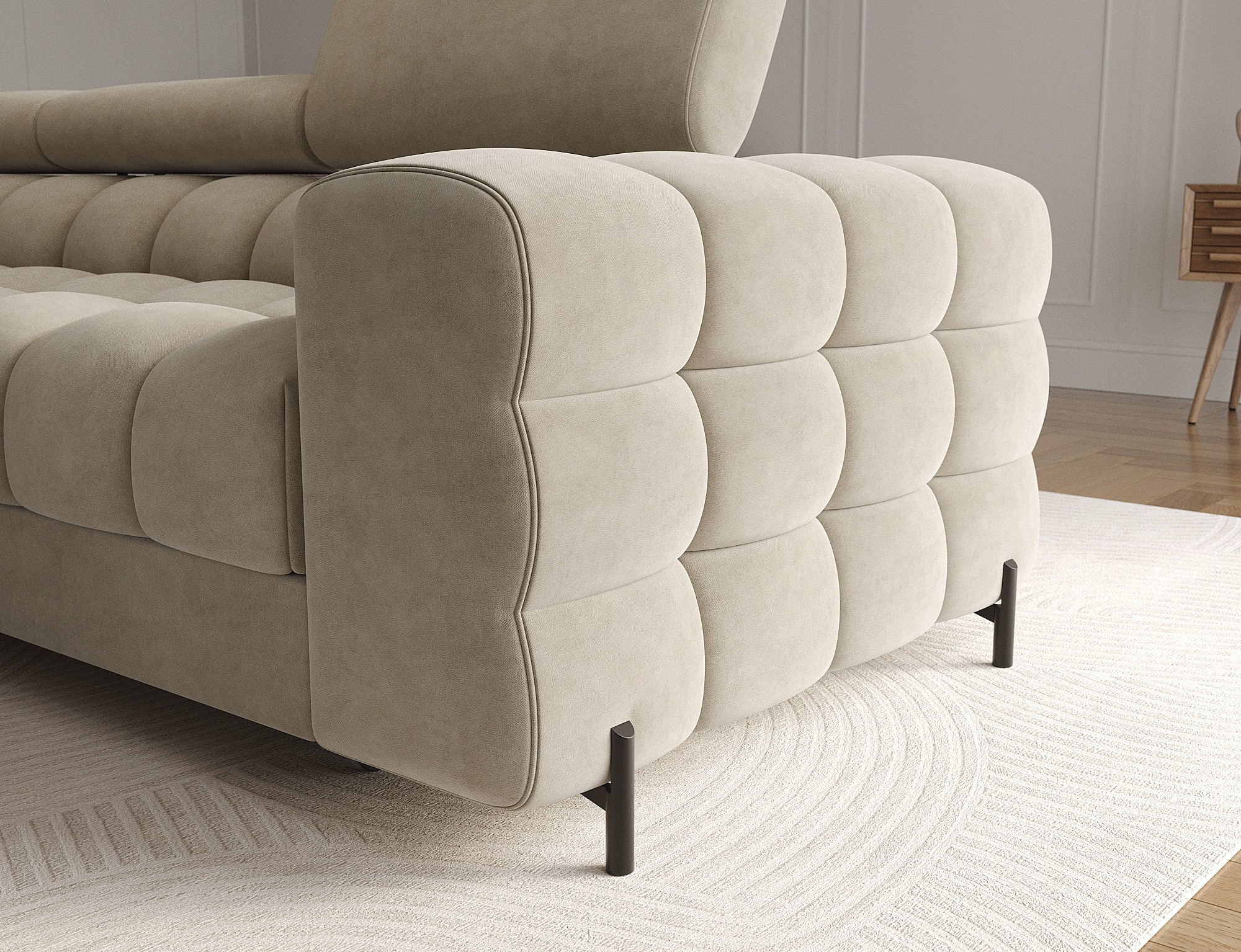 The Felro corner sofa is a combination of modern design, comfort, and functionality. The seat of the sofa is filled with B-type wave springs as well as high-quality T3030 and HR3030 foam, ensuring exceptional comfort for everyday use and relaxation. This makes the furniture not only soft and flexible but also resistant to deformation, guaranteeing long-lasting durability.The sturdy construction is supported by metal legs, powder-coated in black, adding an elegant and modern touch to the overall design. Felro also features a sleeping function, making it a perfect choice for a living room where both style and practicality matter. The "Dolphin" unfolding mechanism allows for an easy and quick transformation of the sofa into a comfortable sleeping space.An additional advantage is the upholstered back, ensuring that the sofa looks great from every angle and can be placed either against a wall or in the center of the room. The entire design follows a modern style, making Felro a perfect fit for contemporary interiors, adding both elegance and functionality.