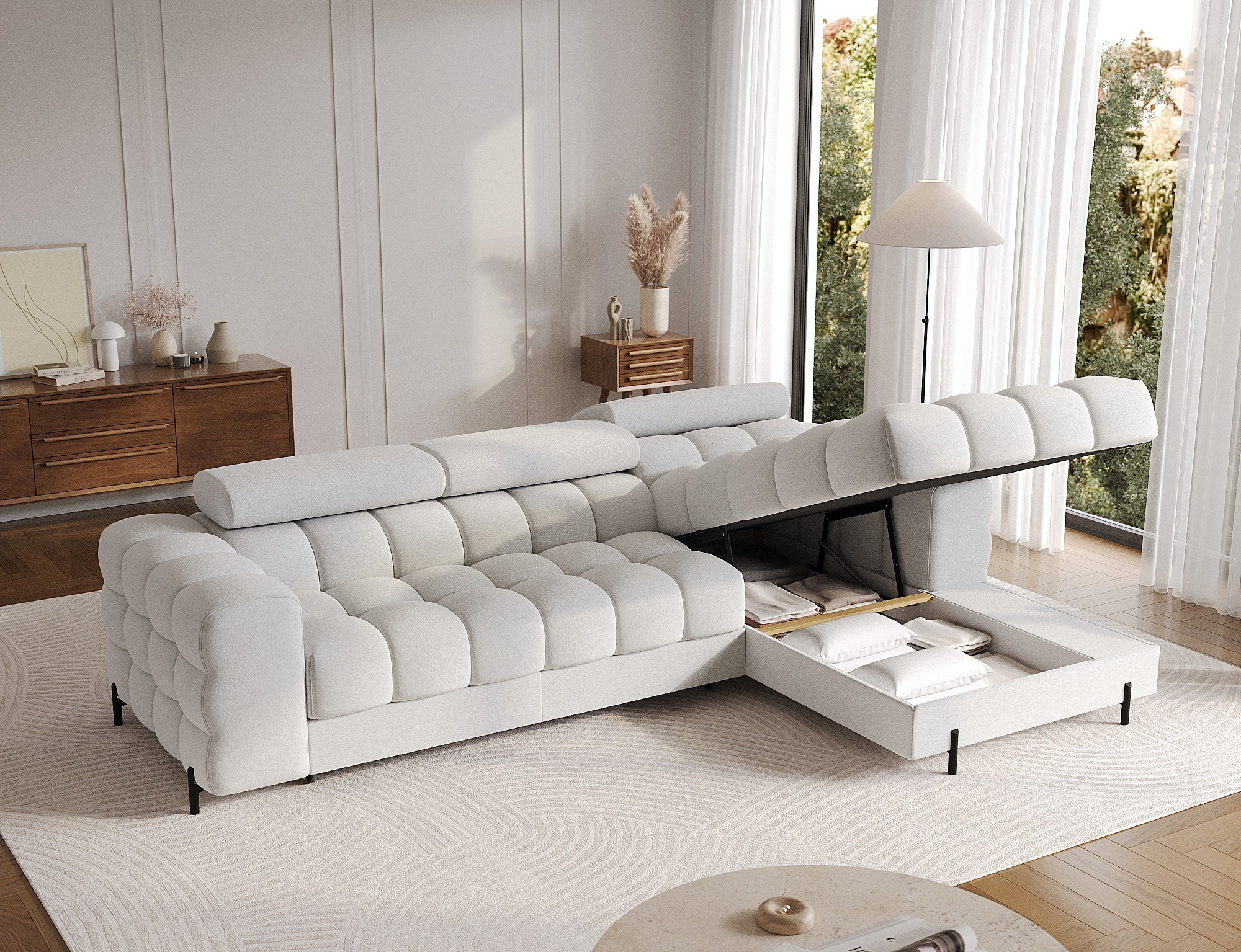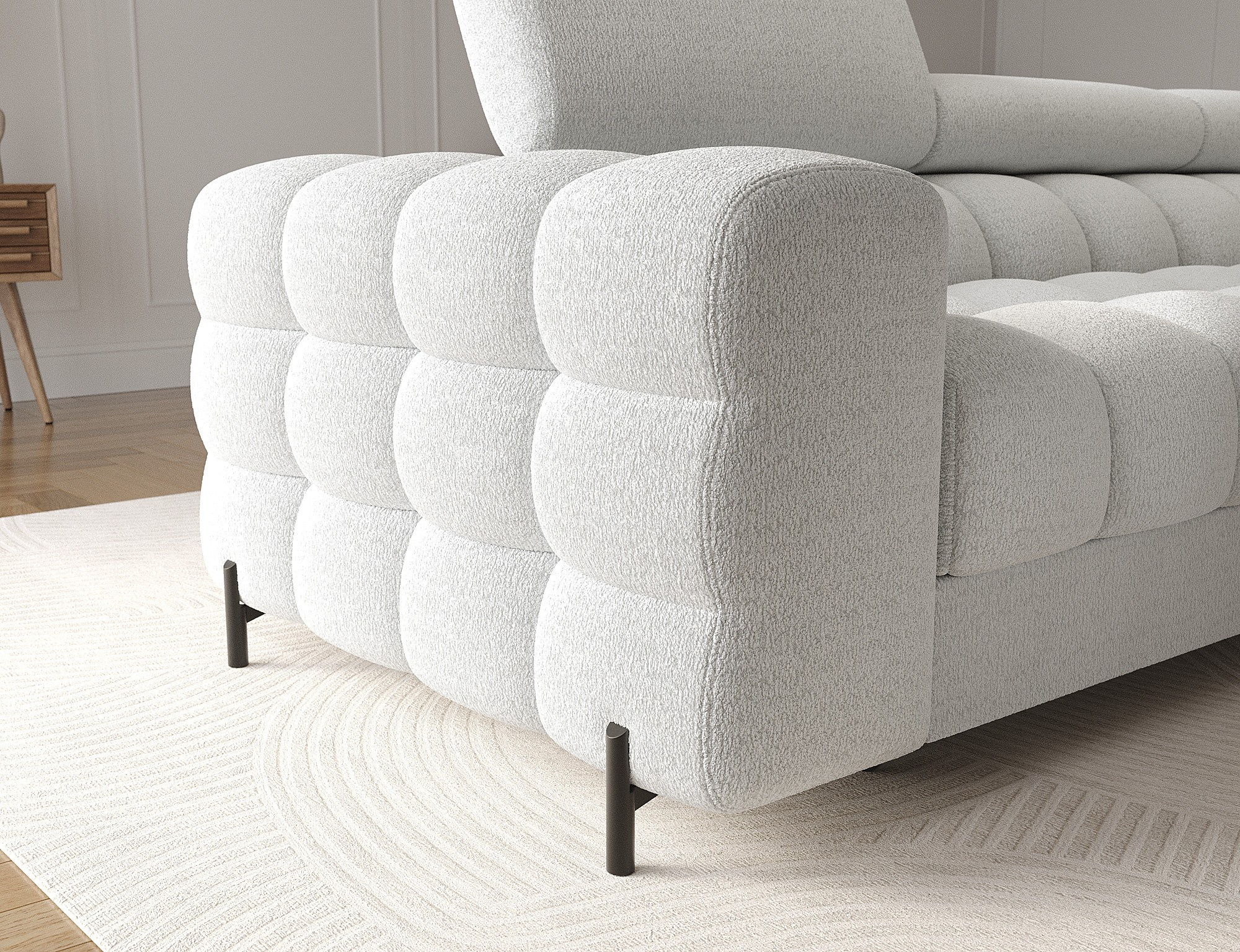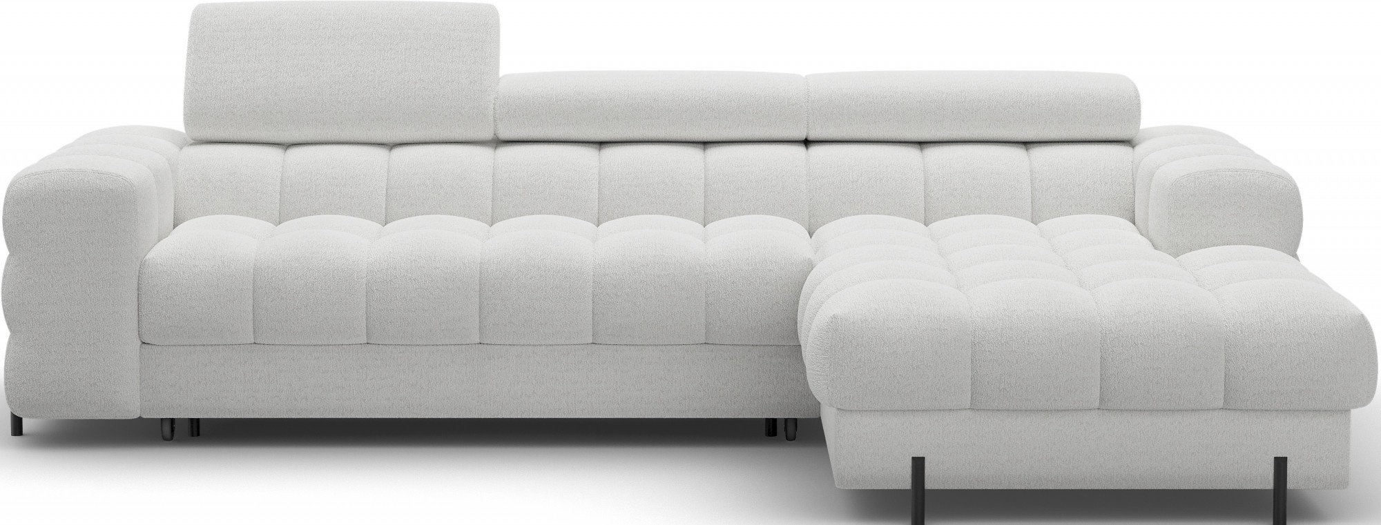 The Felro corner sofa is a combination of modern design, comfort, and functionality. The seat of the sofa is filled with B-type wave springs as well as high-quality T3030 and HR3030 foam, ensuring exceptional comfort for everyday use and relaxation. This makes the furniture not only soft and flexible but also resistant to deformation, guaranteeing long-lasting durability.The sturdy construction is supported by metal legs, powder-coated in black, adding an elegant and modern touch to the overall design. Felro also features a sleeping function, making it a perfect choice for a living room where both style and practicality matter. The "Dolphin" unfolding mechanism allows for an easy and quick transformation of the sofa into a comfortable sleeping space.An additional advantage is the upholstered back, ensuring that the sofa looks great from every angle and can be placed either against a wall or in the center of the room. The entire design follows a modern style, making Felro a perfect fit for contemporary interiors, adding both elegance and functionality.