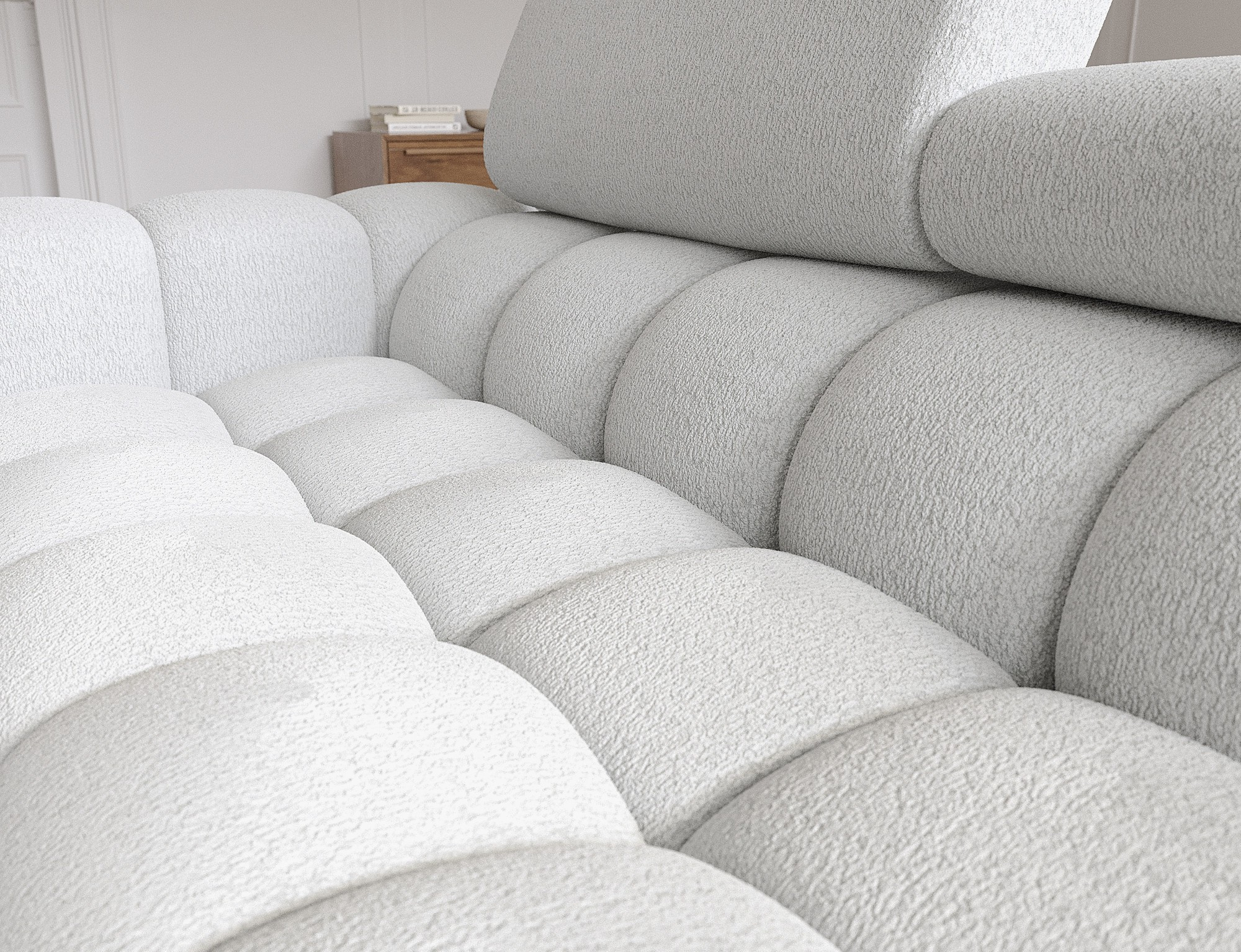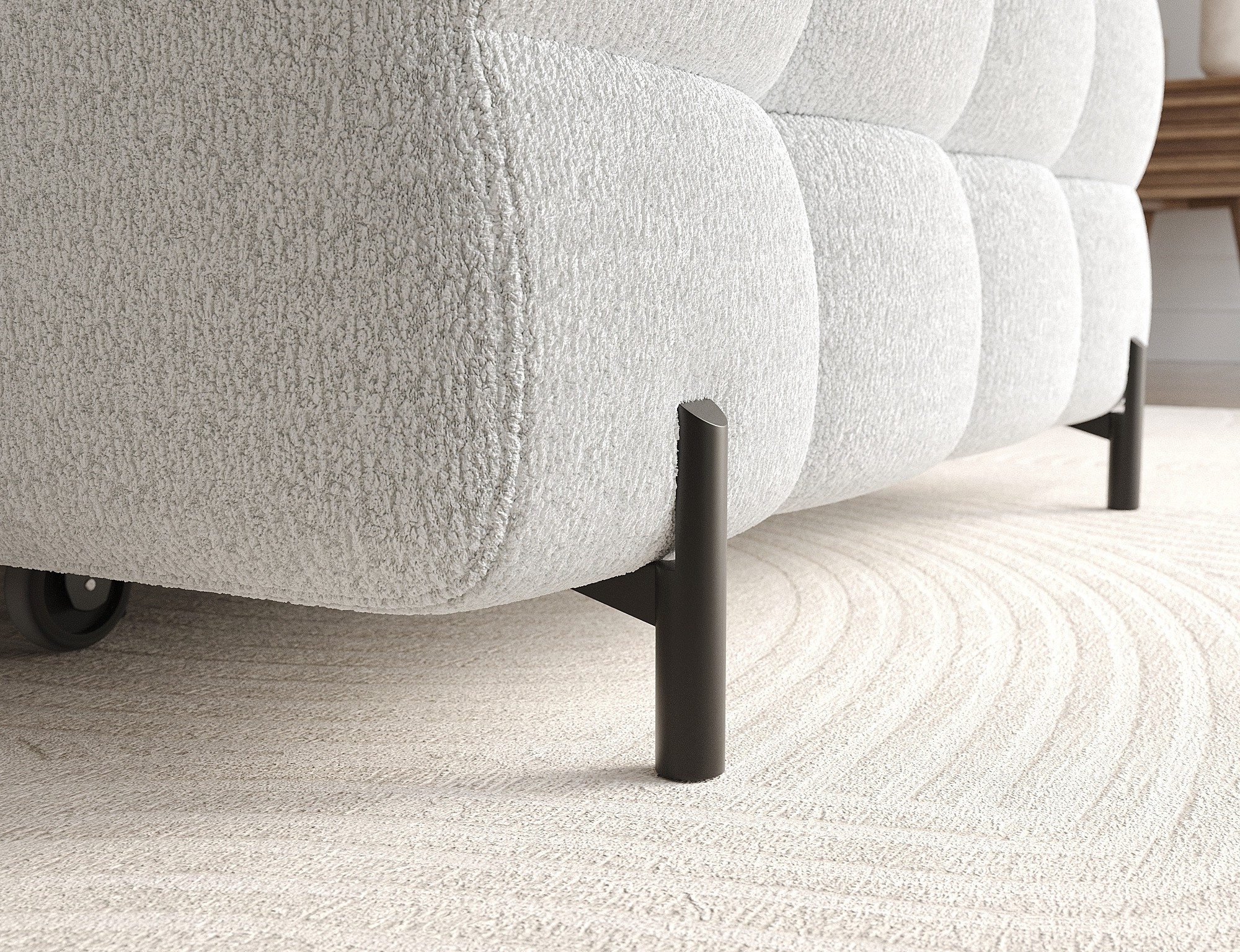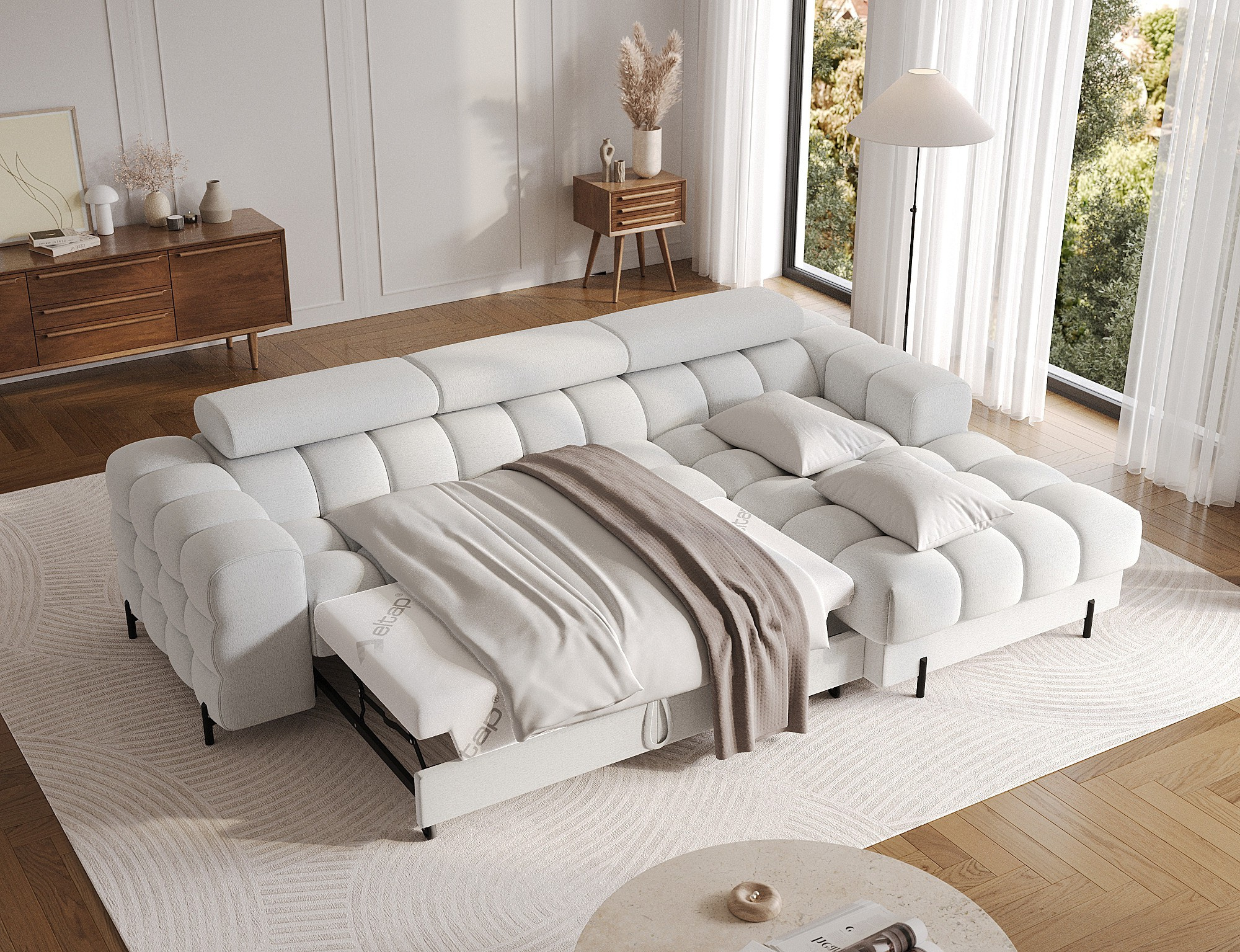The Felro corner sofa is a combination of modern design, comfort, and functionality. The seat of the sofa is filled with B-type wave springs as well as high-quality T3030 and HR3030 foam, ensuring exceptional comfort for everyday use and relaxation. This makes the furniture not only soft and flexible but also resistant to deformation, guaranteeing long-lasting durability.The sturdy construction is supported by metal legs, powder-coated in black, adding an elegant and modern touch to the overall design. Felro also features a sleeping function, making it a perfect choice for a living room where both style and practicality matter. The "Dolphin" unfolding mechanism allows for an easy and quick transformation of the sofa into a comfortable sleeping space.An additional advantage is the upholstered back, ensuring that the sofa looks great from every angle and can be placed either against a wall or in the center of the room. The entire design follows a modern style, making Felro a perfect fit for contemporary interiors, adding both elegance and functionality.