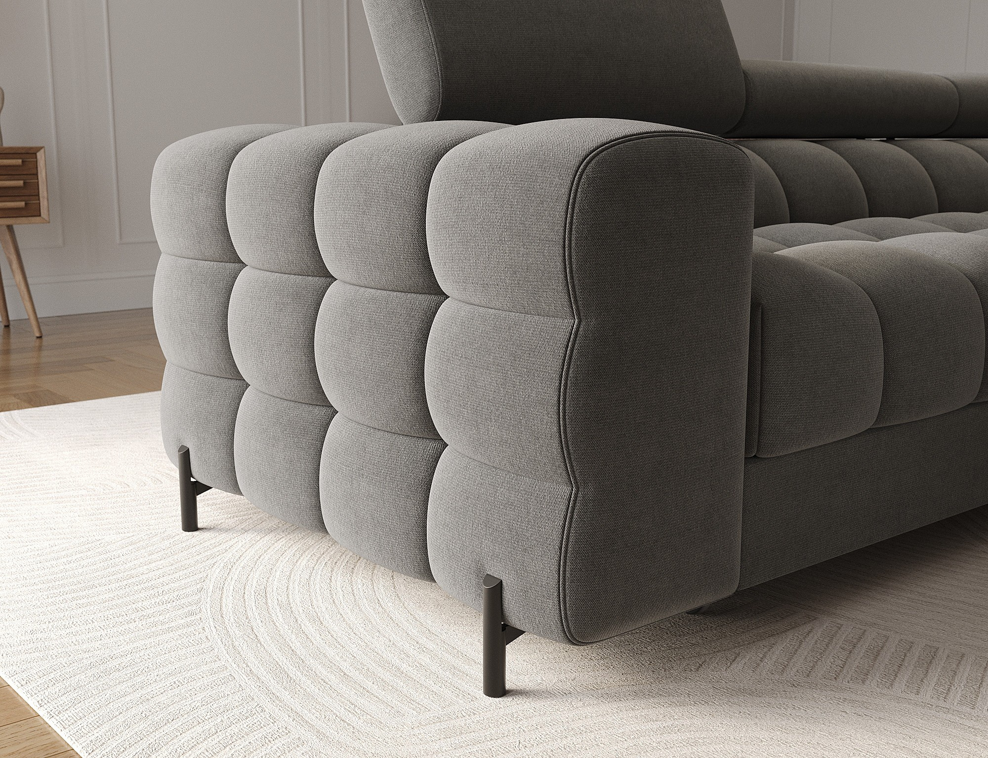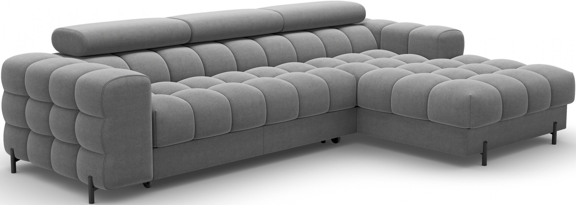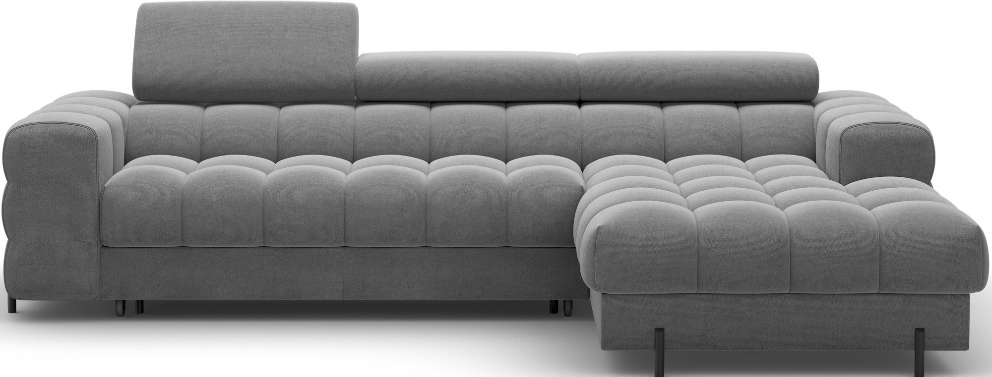 The Felro corner sofa is a combination of modern design, comfort, and functionality. The seat of the sofa is filled with B-type wave springs as well as high-quality T3030 and HR3030 foam, ensuring exceptional comfort for everyday use and relaxation. This makes the furniture not only soft and flexible but also resistant to deformation, guaranteeing long-lasting durability.The sturdy construction is supported by metal legs, powder-coated in black, adding an elegant and modern touch to the overall design. Felro also features a sleeping function, making it a perfect choice for a living room where both style and practicality matter. The "Dolphin" unfolding mechanism allows for an easy and quick transformation of the sofa into a comfortable sleeping space.An additional advantage is the upholstered back, ensuring that the sofa looks great from every angle and can be placed either against a wall or in the center of the room. The entire design follows a modern style, making Felro a perfect fit for contemporary interiors, adding both elegance and functionality.