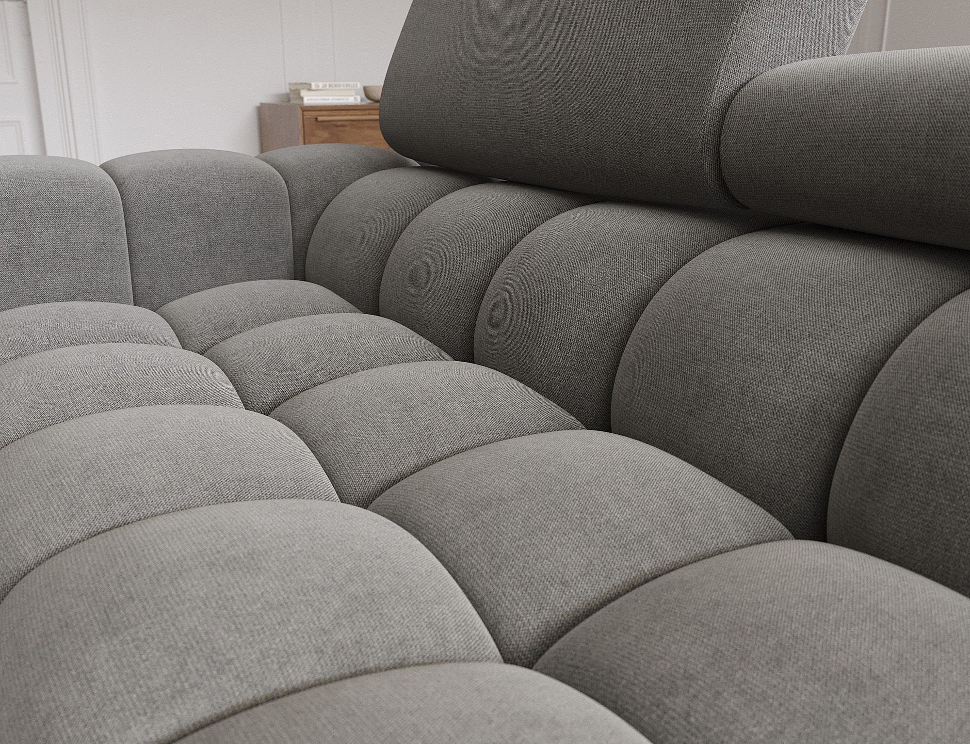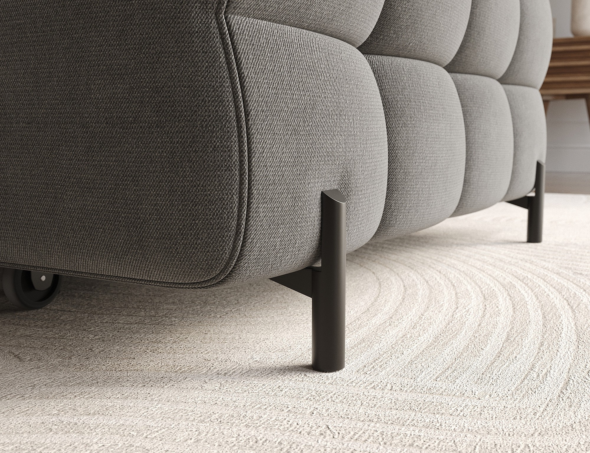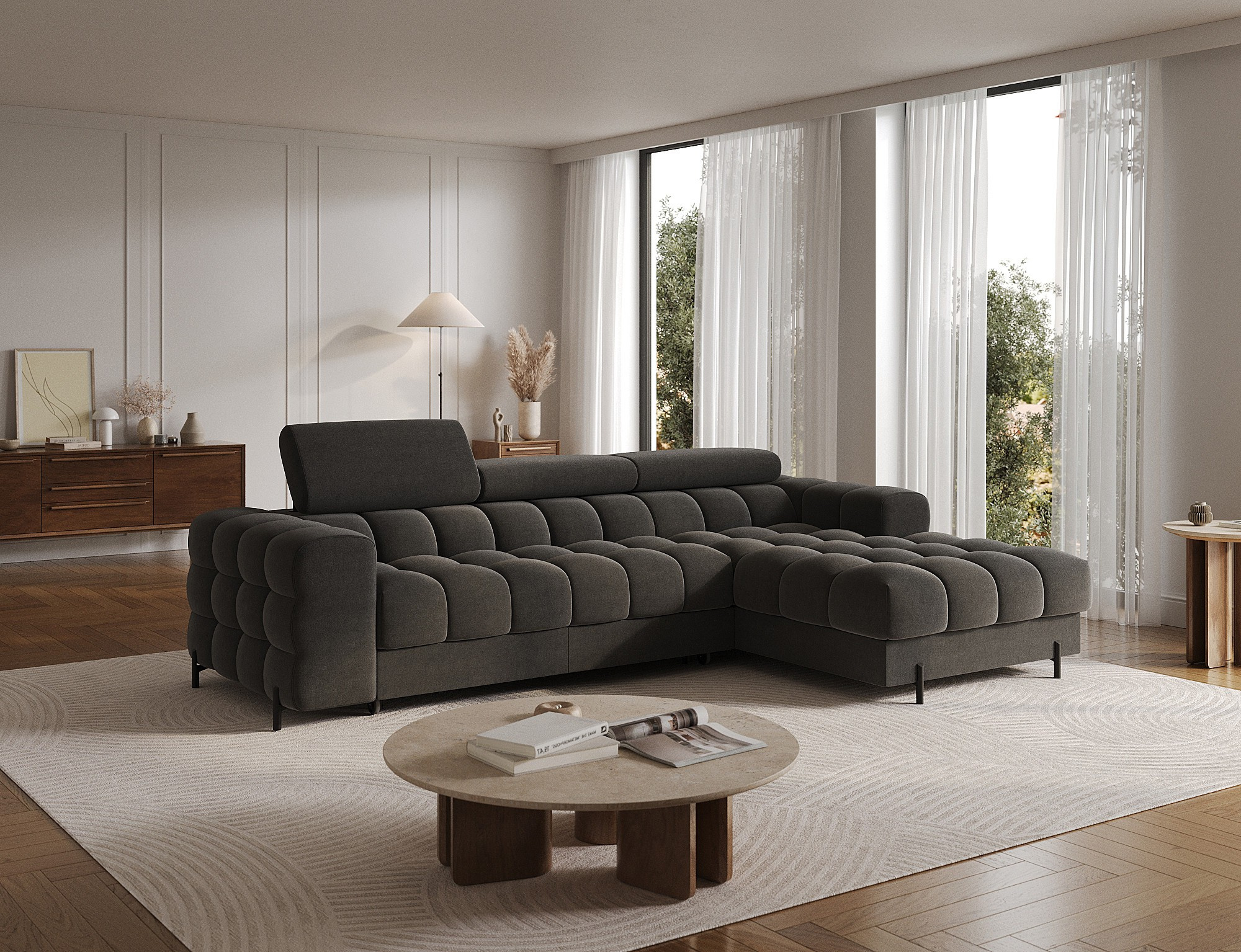 The Felro corner sofa is a combination of modern design, comfort, and functionality. The seat of the sofa is filled with B-type wave springs as well as high-quality T3030 and HR3030 foam, ensuring exceptional comfort for everyday use and relaxation. This makes the furniture not only soft and flexible but also resistant to deformation, guaranteeing long-lasting durability.The sturdy construction is supported by metal legs, powder-coated in black, adding an elegant and modern touch to the overall design. Felro also features a sleeping function, making it a perfect choice for a living room where both style and practicality matter. The "Dolphin" unfolding mechanism allows for an easy and quick transformation of the sofa into a comfortable sleeping space.An additional advantage is the upholstered back, ensuring that the sofa looks great from every angle and can be placed either against a wall or in the center of the room. The entire design follows a modern style, making Felro a perfect fit for contemporary interiors, adding both elegance and functionality.