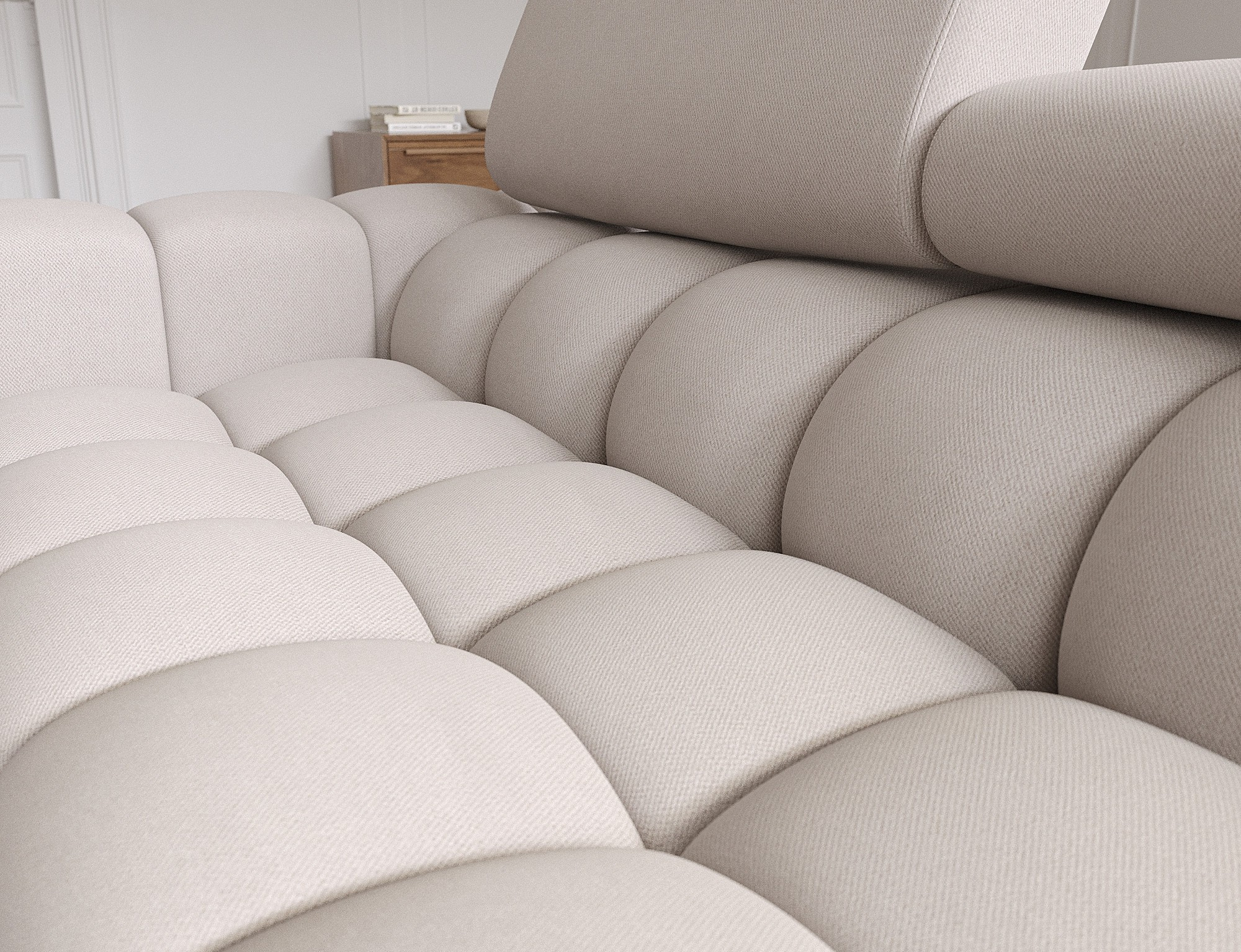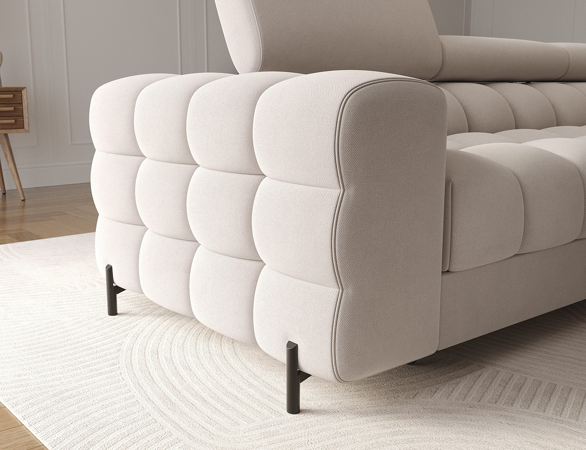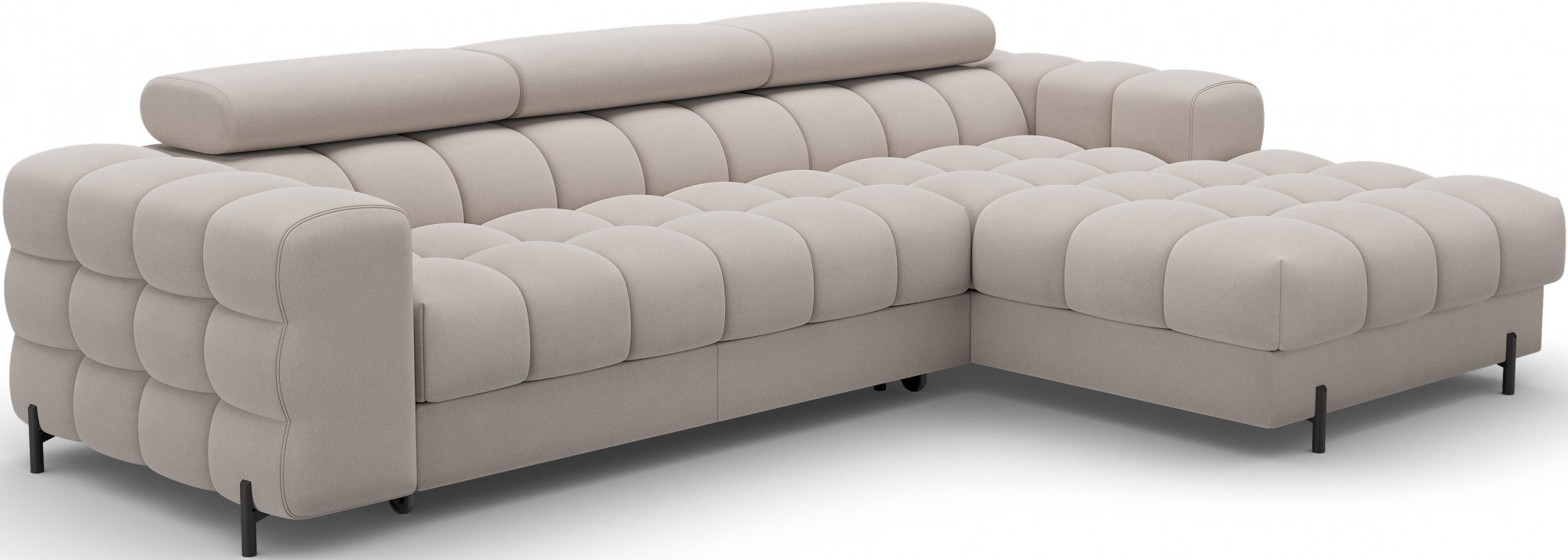 The Felro corner sofa is a combination of modern design, comfort, and functionality. The seat of the sofa is filled with B-type wave springs as well as high-quality T3030 and HR3030 foam, ensuring exceptional comfort for everyday use and relaxation. This makes the furniture not only soft and flexible but also resistant to deformation, guaranteeing long-lasting durability.The sturdy construction is supported by metal legs, powder-coated in black, adding an elegant and modern touch to the overall design. Felro also features a sleeping function, making it a perfect choice for a living room where both style and practicality matter. The "Dolphin" unfolding mechanism allows for an easy and quick transformation of the sofa into a comfortable sleeping space.An additional advantage is the upholstered back, ensuring that the sofa looks great from every angle and can be placed either against a wall or in the center of the room. The entire design follows a modern style, making Felro a perfect fit for contemporary interiors, adding both elegance and functionality.