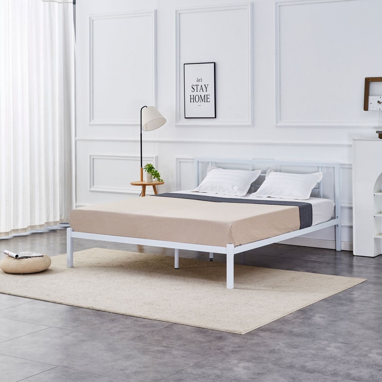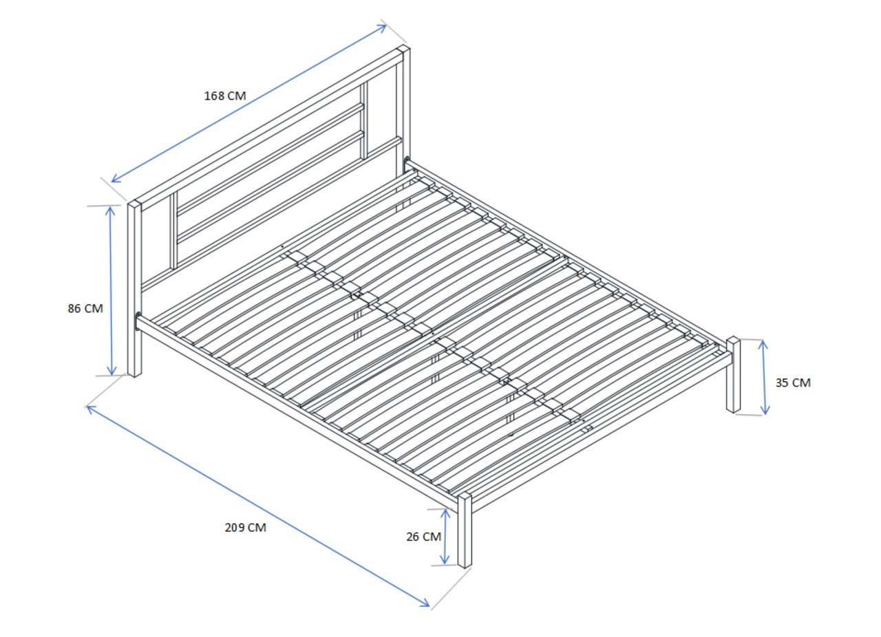 Méretek: - teljes hossz: 209 cm - teljes szélesség: 168 cm - magasság (matrac nélkül): 35 cm - fejtámla magassága: 86 cm - fekvőfelület: 160x200 cm Anyag: - keret: porfestett fém - lécek: rétegelt lemezből készült rugalmas lécek Egyéb: - ágyrács a készletben - lécek száma: 16 db két sorban - ágy matrac nélkül kapható Szín: - fehér
