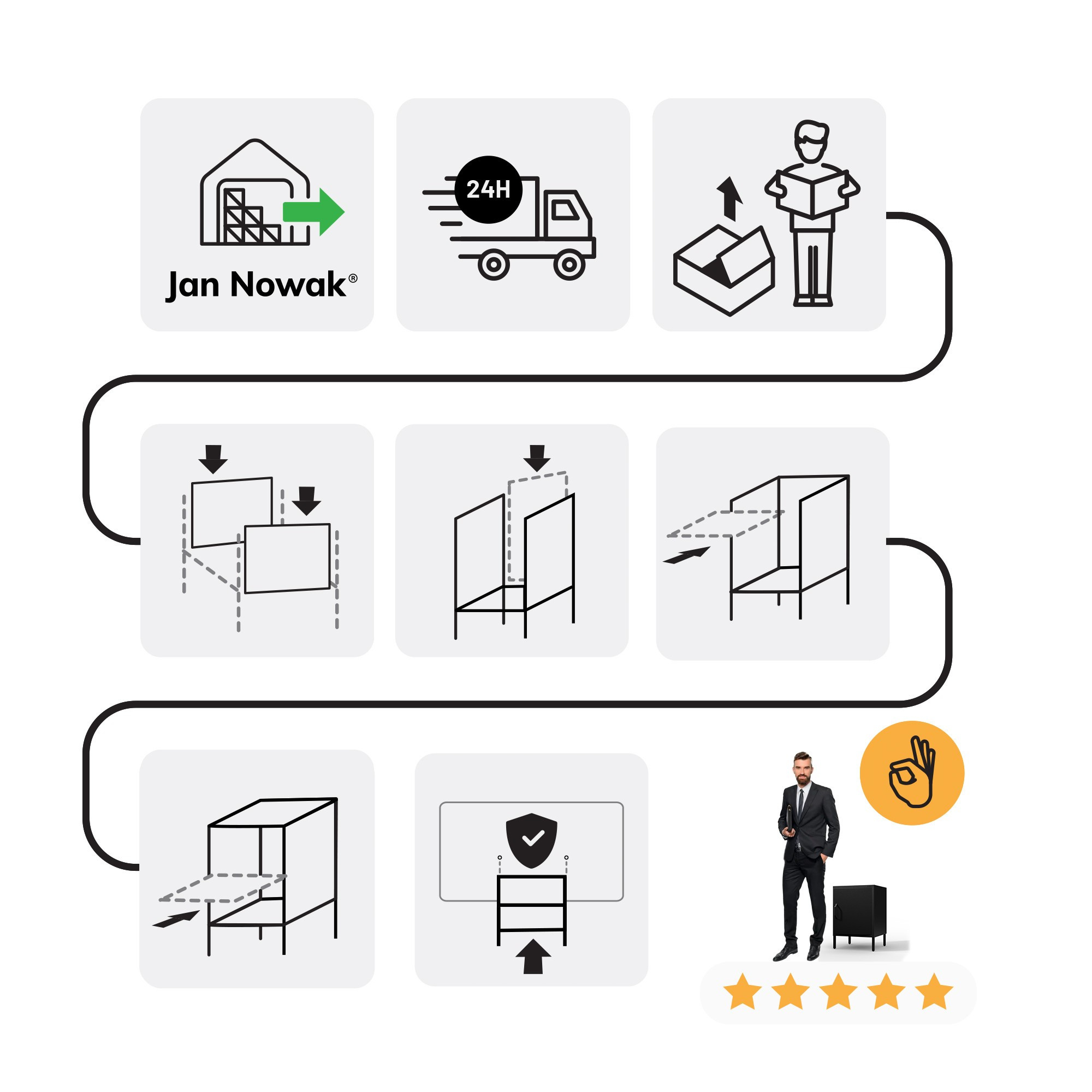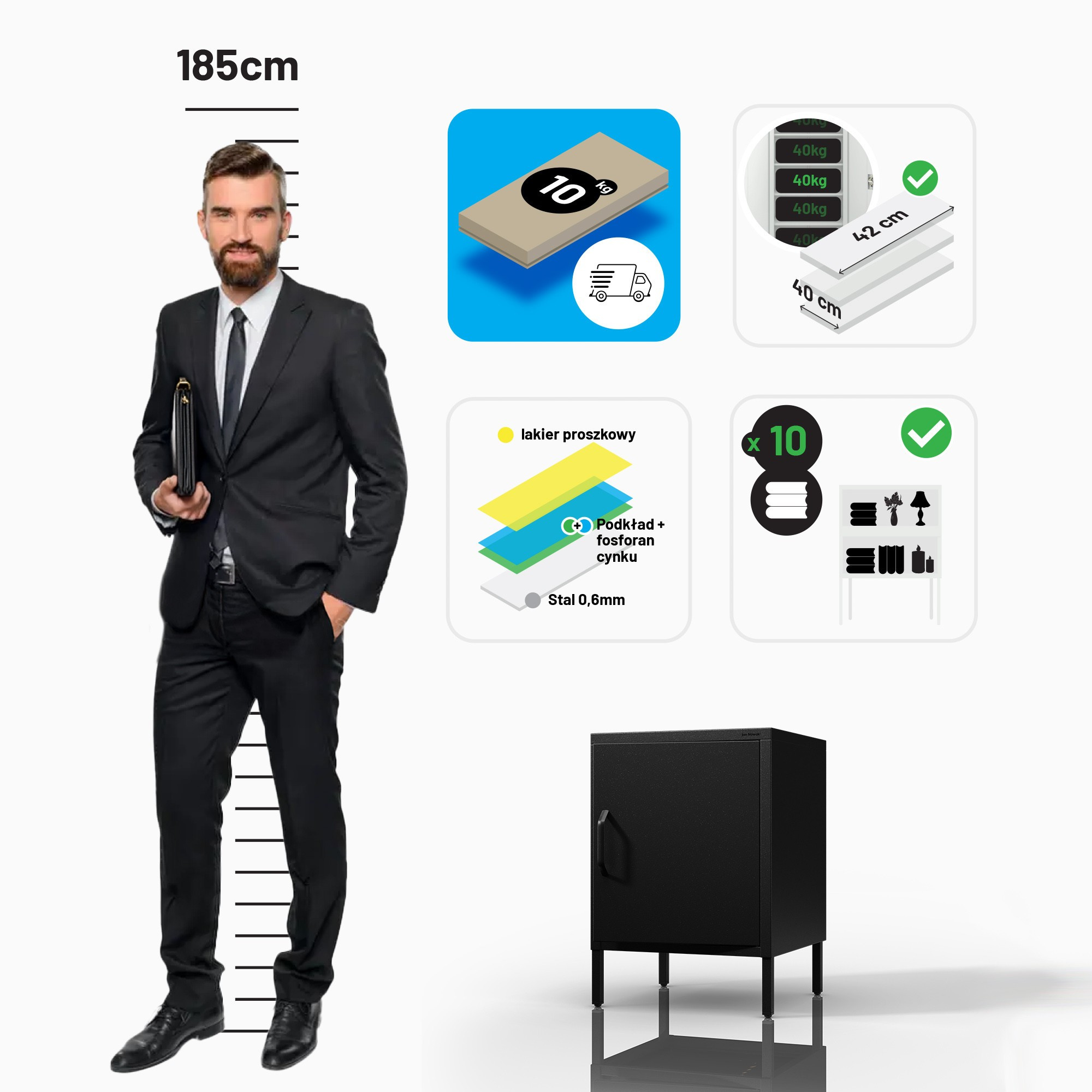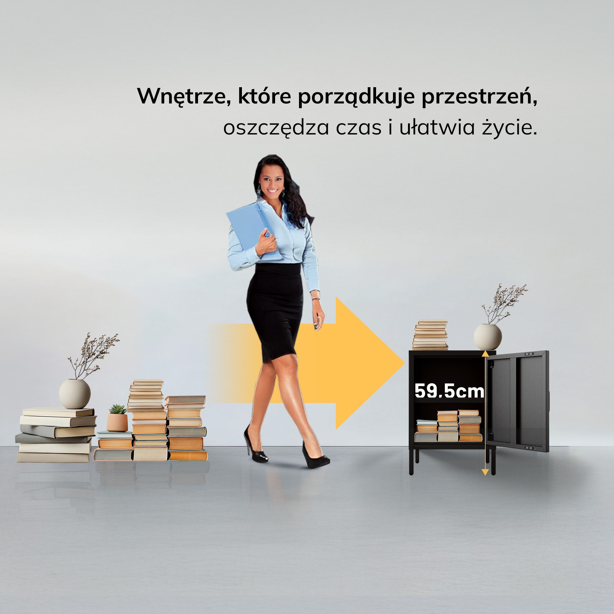 A MIA modell lehetőséget kínál arra, hogy kiválassza, melyik oldalra szeretné az ajtókat elhelyezni. Tehát balról vagy jobbról is rögzítheti őket – pontosan úgy, ahogy a legjobban megfelel önnek. A zárható szekrény belsejében egy tágas polc található, amelynek magassága 25 mm-enként állítható, így szabadon elrendezheti a különböző méretű tárgyakat. A polc teherbírása akár 40 kg is lehet, így gond nélkül tárolhat rajta könyveket, albumokat vagy akár nehezebb elektronikai eszközöket is. Az asztal felső lapja is rendelkezésre áll, ahol a mindennapi használati tárgyak helyet kaphatnak.