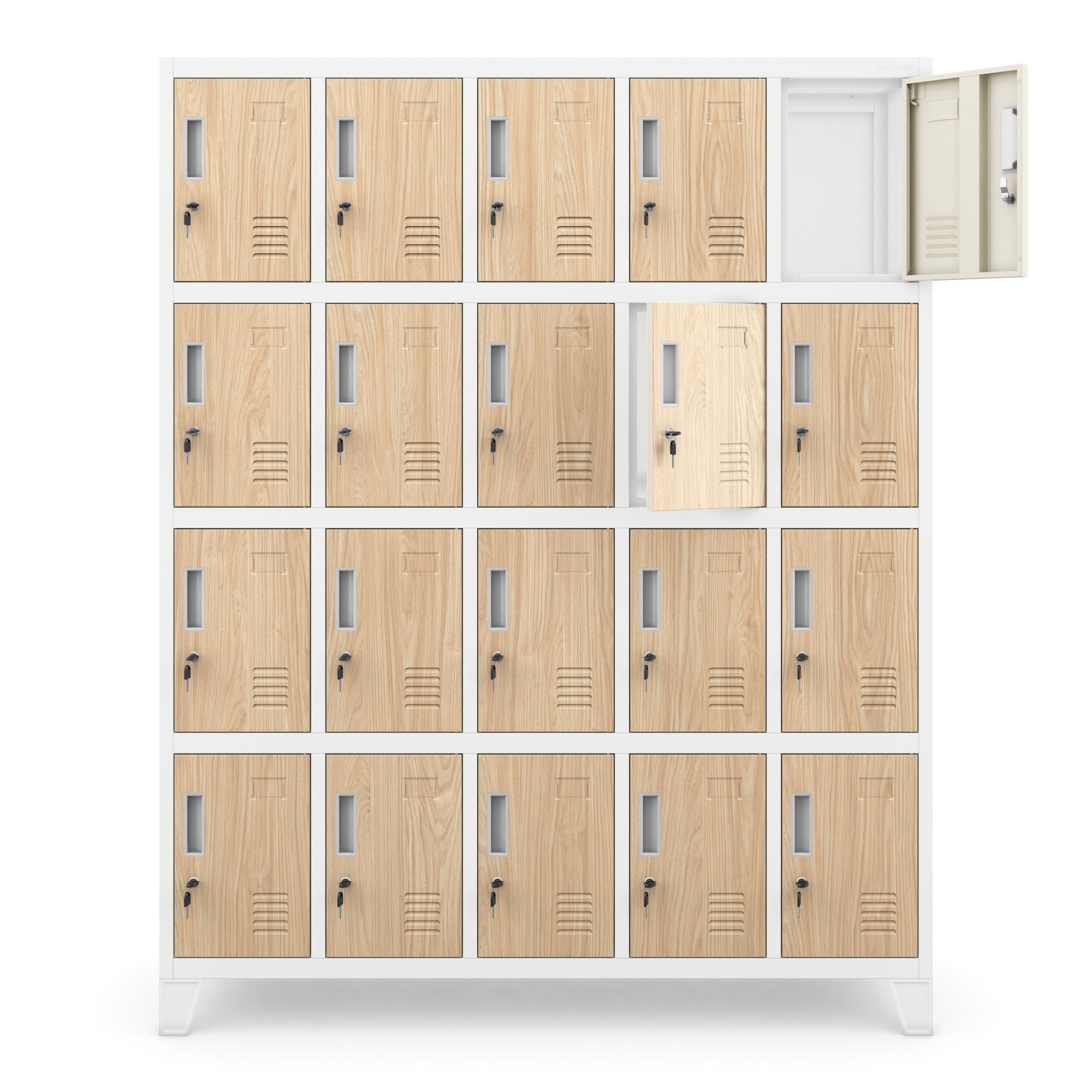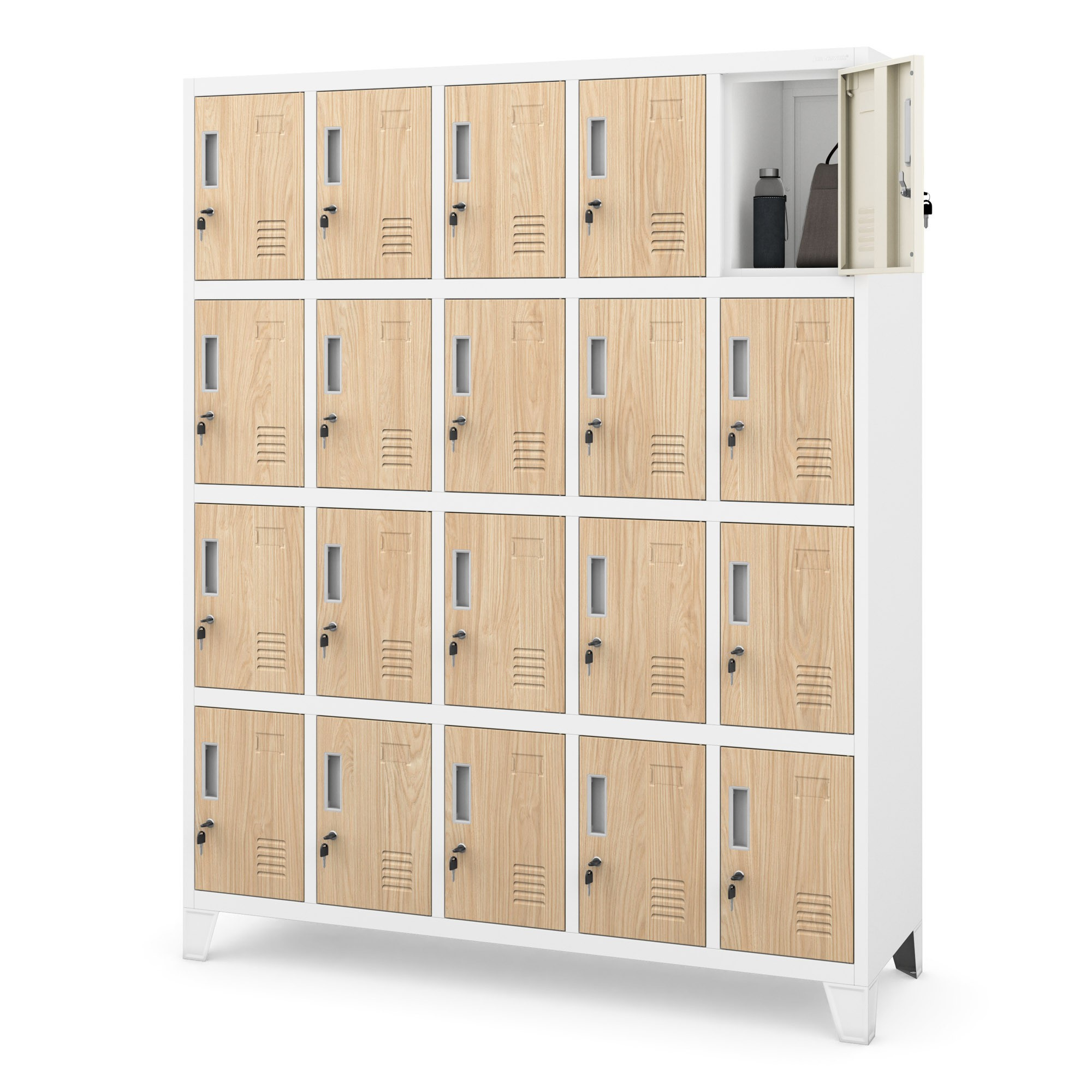 Minden rekesz egypontos zárral van felszerelve, amely biztosítja a személyes tárgyak biztonságos tárolását. A zár zárja megvédi a rekesz tartalmát az illetéktelen hozzáféréstől, és biztosítja a felhasználókat arról, hogy a dolgaik biztonságban vannak.