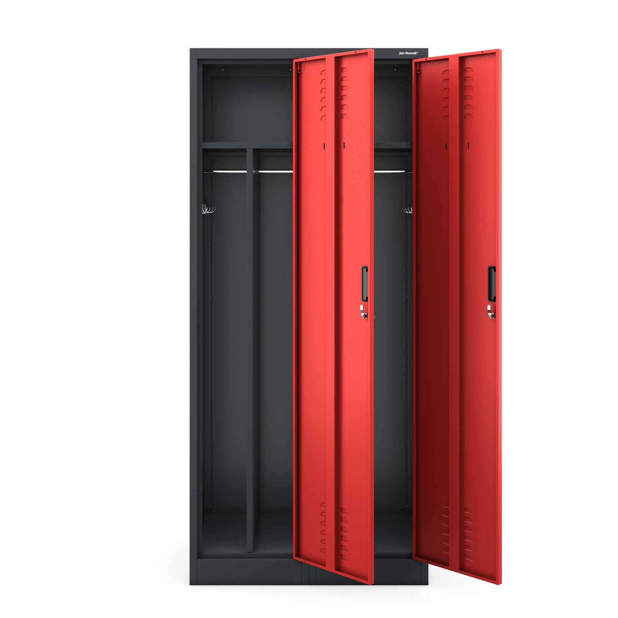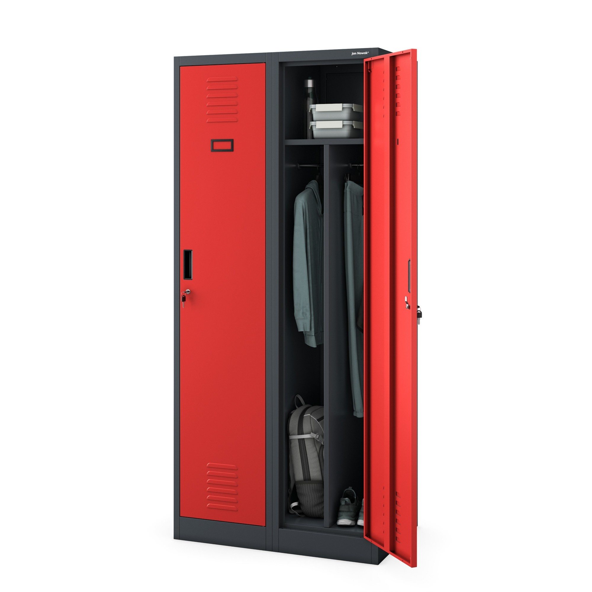 A KACPER szociális szekrény maximális funkcionalitásra és hosszú élettartamra lett tervezve. Kiváló minőségű hidegen hengerelt acélból készült, és porfestékkel van kezelve, ami garantálja a magas mechanikai sérülésekkel és korrózióval szembeni ellenállást. Bízhat benne, hogy hosszú évekig szolgál majd anélkül, hogy veszítene minőségéből és esztétikai megjelenéséből.