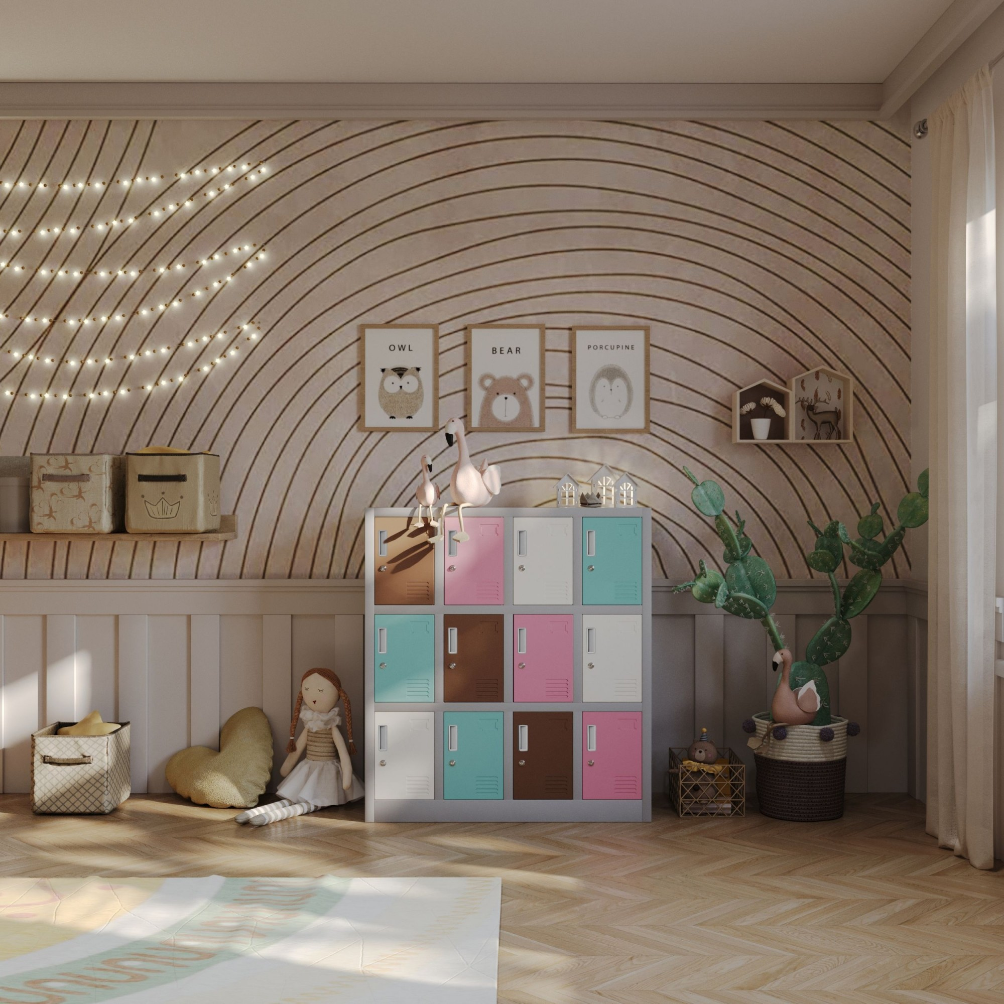 - Könnyű szervezés: Minden szekrény ajtaján van egy hely névjegykártya vagy kép számára, ami megkönnyíti a gyerekek és a szülők számára a megfelelő szekrény megtalálását.