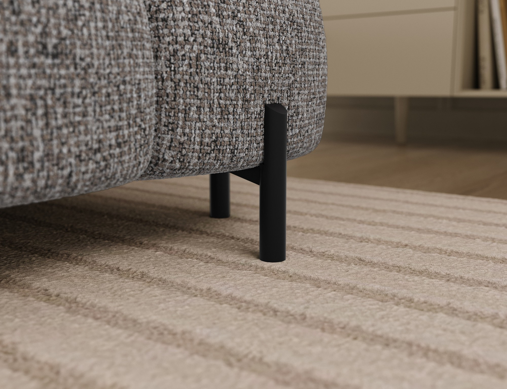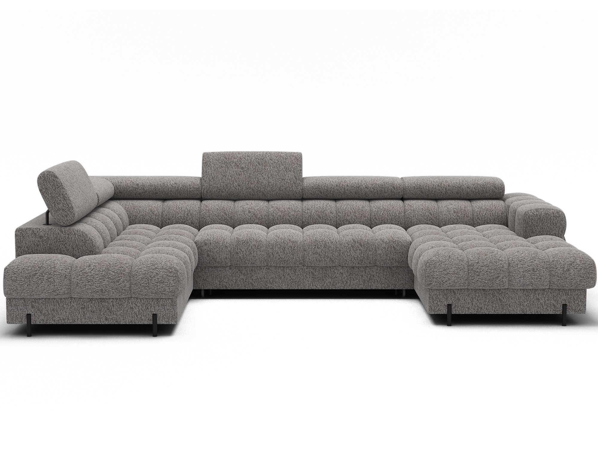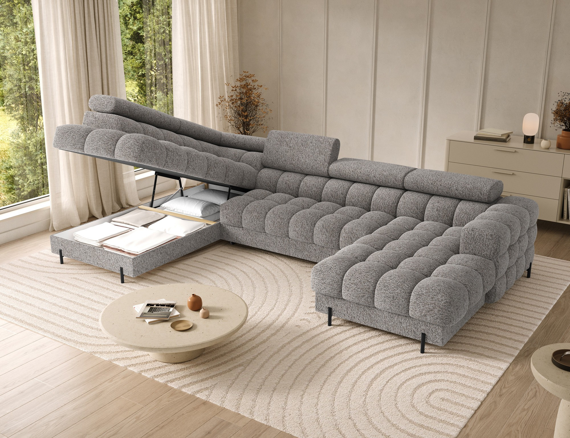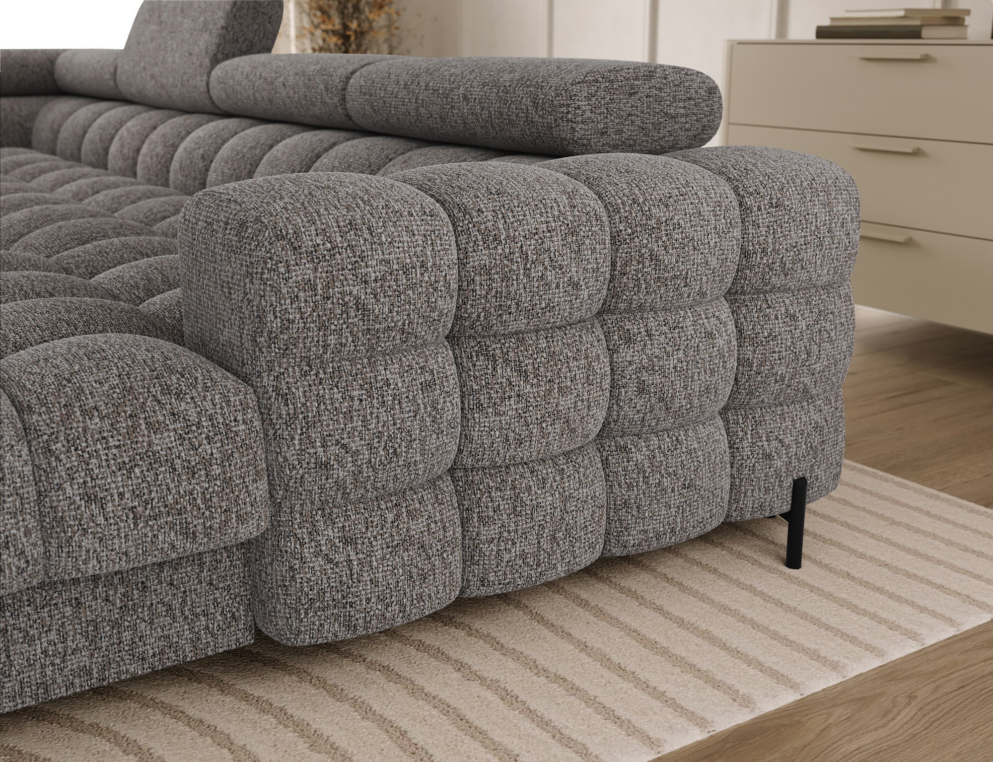 The Feraria corner sofa, with impressive dimensions of 358x202x93 cm, is a modern and functional piece of lounge furniture designed for spacious, stylish living rooms, featuring a type B wave spring system and two types of foam – T3030 and profiled HR3030 – it offers excellent comfort both for sitting and daily sleeping, the practical sleeping function allows for quick conversion into a comfortable bed, while the spacious bedding container provides extra storage space, the fully upholstered backrest enables free placement anywhere in the room without the need to push it against a wall, offering great flexibility in interior arrangement, the entire structure is supported by sturdy black metal legs with a powder-coated finish, emphasizing the modern character of the sofa and adding visual lightness, Feraria is the perfect combination of style, comfort and functionality for those who value quality, design and everyday practicality in one piece of furniture.