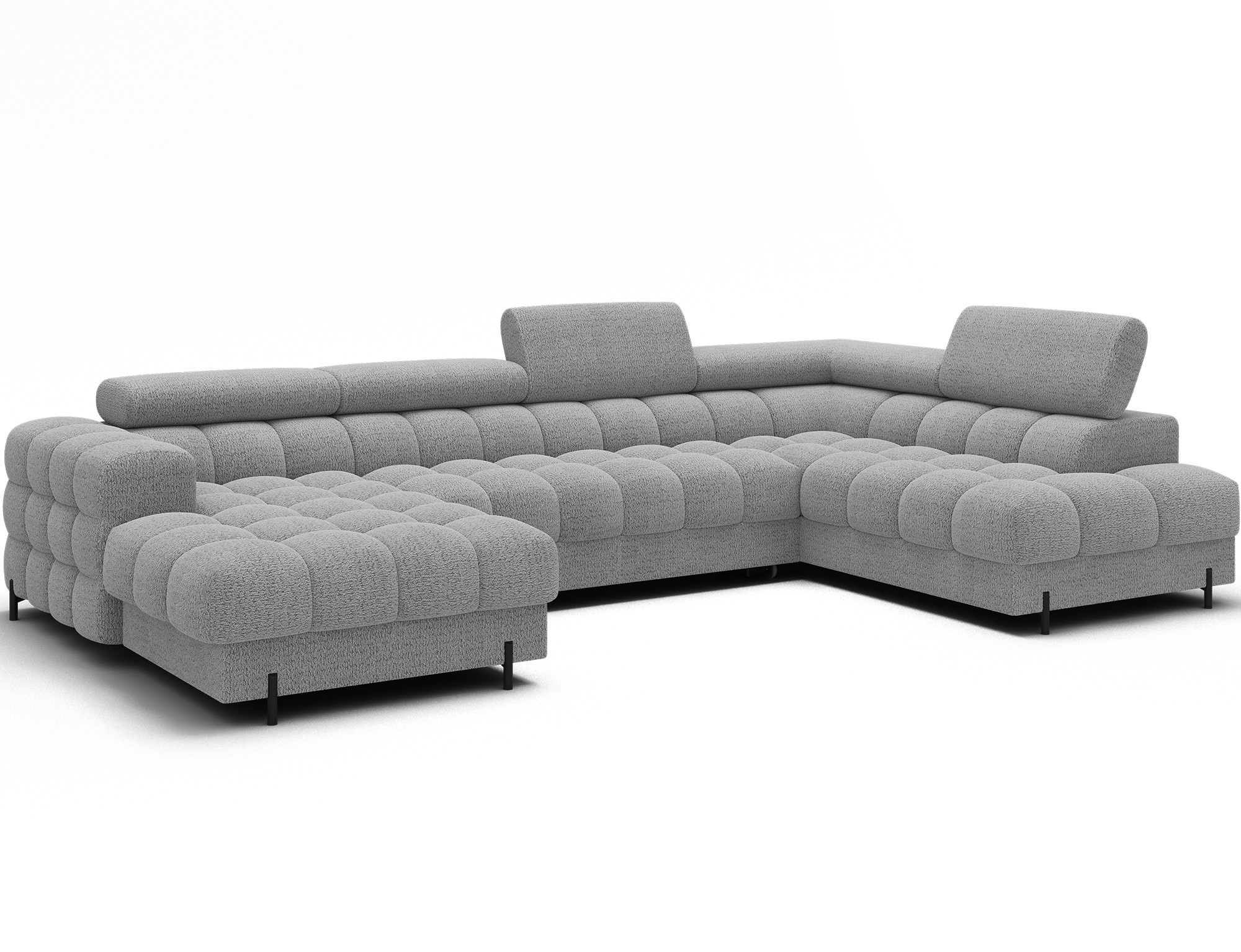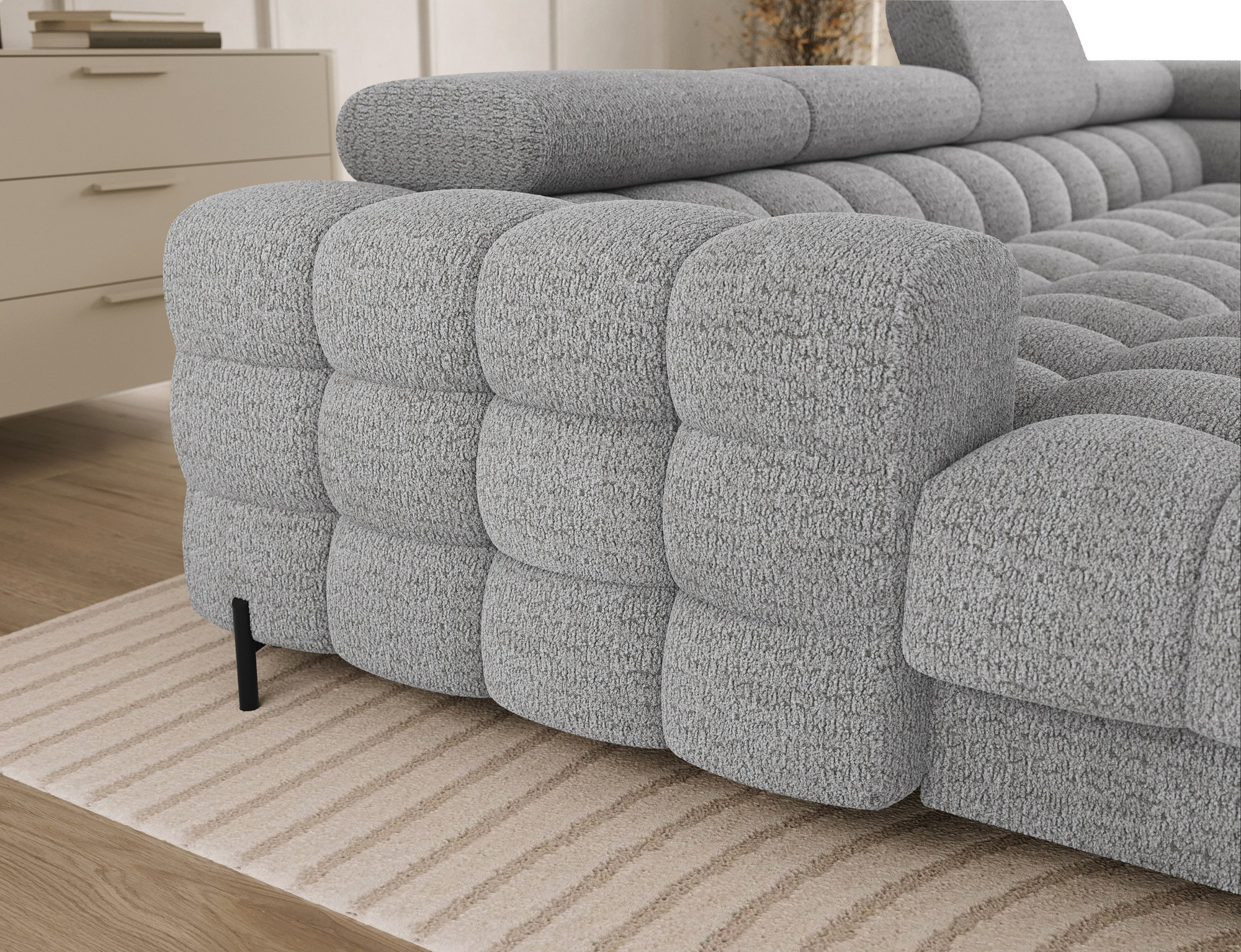The Feraria corner sofa, with impressive dimensions of 358x202x93 cm, is a modern and functional piece of lounge furniture designed for spacious, stylish living rooms, featuring a type B wave spring system and two types of foam – T3030 and profiled HR3030 – it offers excellent comfort both for sitting and daily sleeping, the practical sleeping function allows for quick conversion into a comfortable bed, while the spacious bedding container provides extra storage space, the fully upholstered backrest enables free placement anywhere in the room without the need to push it against a wall, offering great flexibility in interior arrangement, the entire structure is supported by sturdy black metal legs with a powder-coated finish, emphasizing the modern character of the sofa and adding visual lightness, Feraria is the perfect combination of style, comfort and functionality for those who value quality, design and everyday practicality in one piece of furniture.