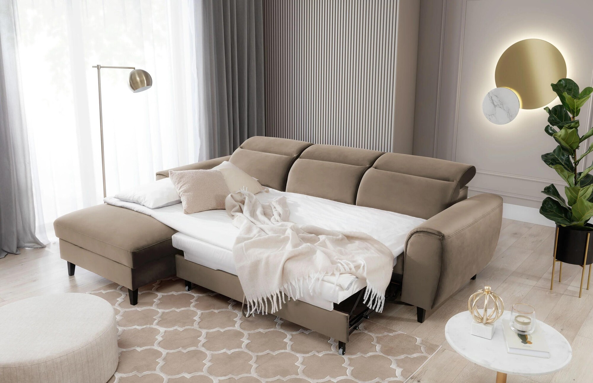 Our Foble model is more than just a piece of furniture. It is a way to regain the energy you lost at work and put a smile back on your face! Don't you believe it? Then take a look at what our cornersofa is made of: at its heart you will find HR high resilience foam, elastic band, T2130 foam and B-type corrugated springs. The construction is therefore able to gently wrap around your body, while taking care to provide its tender areas with the correct support. The right combination of the highest quality materials also makes the corner sofa resistant to creasing and deformation. This meansthat even when used intensively, it will remain free of unsightly and uncomfortable indentations. It will therefore look like a new one for a surprisingly long time! For your maximum safety, Foble is equipped with adjustable headrests. An additional advantage of the corner sofa are the three decorative cushions offered in a standard version. Not only do they increase the comfort of the furniture, but they are also an aesthetically pleasing decoration that enhances its visual appeal. You can also place them on the armchairs to create a harmoniously coherent decor.