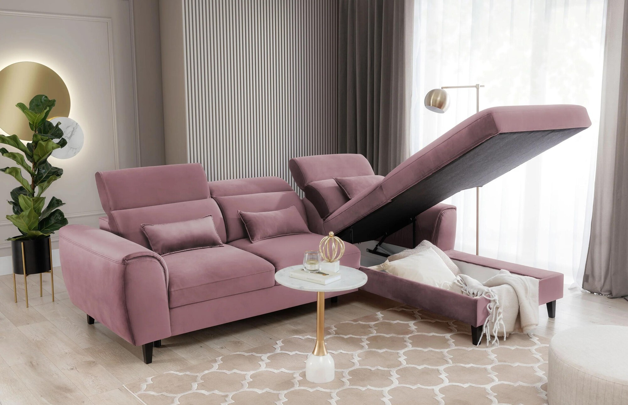 Our Foble model is more than just a piece of furniture. It is a way to regain the energy you lost at work and put a smile back on your face! Don't you believe it? Then take a look at what our cornersofa is made of: at its heart you will find HR high resilience foam, elastic band, T2130 foam and B-type corrugated springs. The construction is therefore able to gently wrap around your body, while taking care to provide its tender areas with the correct support. The right combination of the highest quality materials also makes the corner sofa resistant to creasing and deformation. This meansthat even when used intensively, it will remain free of unsightly and uncomfortable indentations. It will therefore look like a new one for a surprisingly long time! For your maximum safety, Foble is equipped with adjustable headrests. An additional advantage of the corner sofa are the three decorative cushions offered in a standard version. Not only do they increase the comfort of the furniture, but they are also an aesthetically pleasing decoration that enhances its visual appeal. You can also place them on the armchairs to create a harmoniously coherent decor.