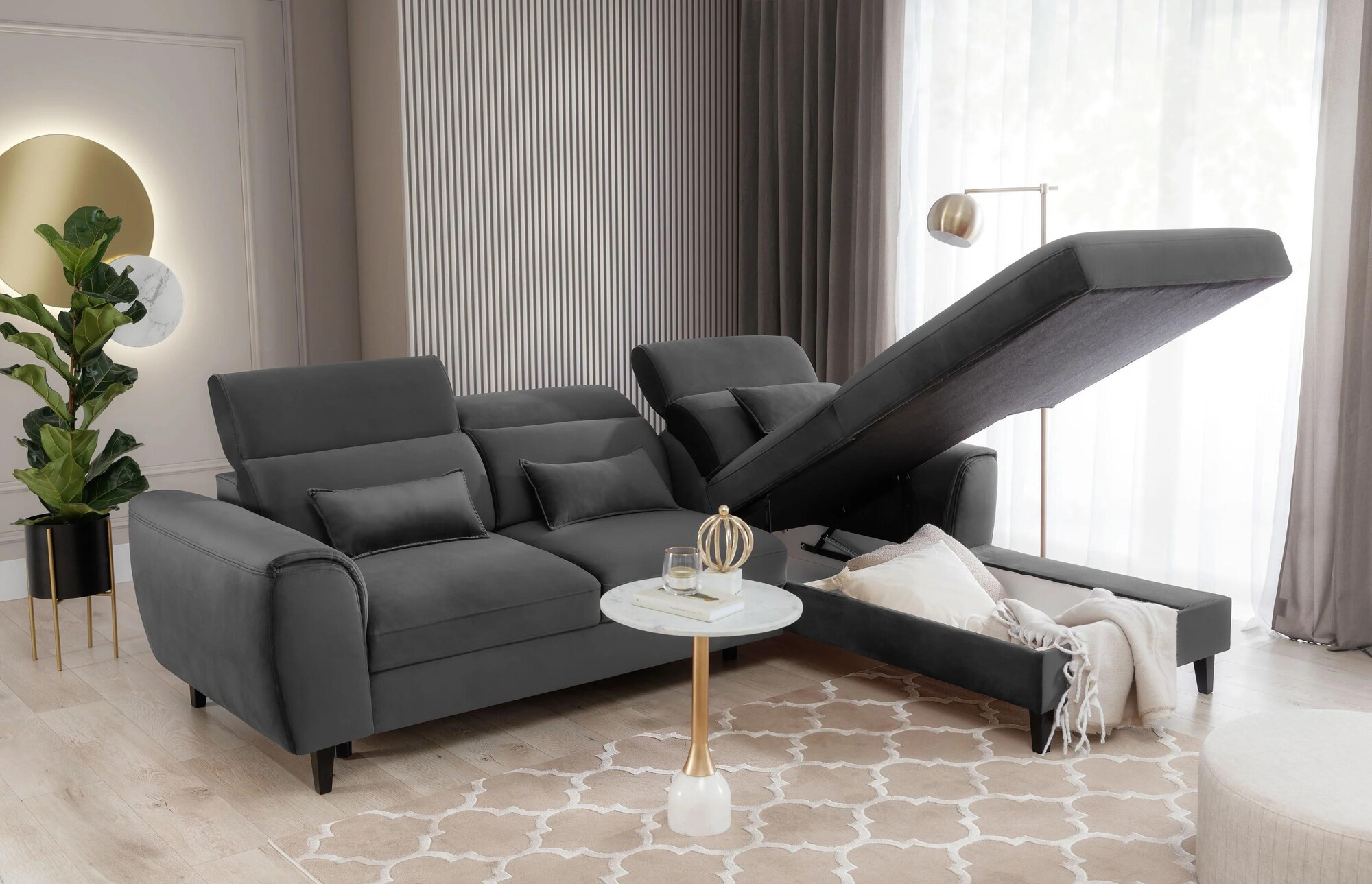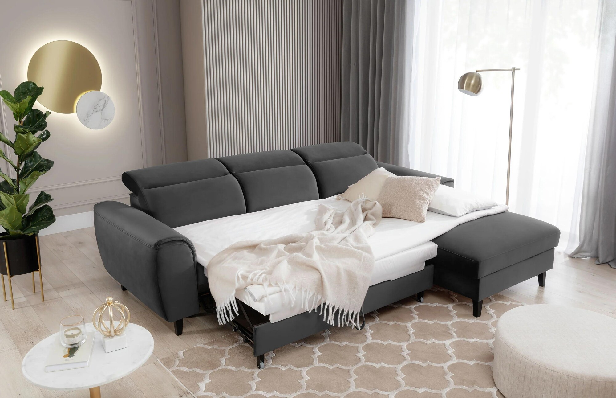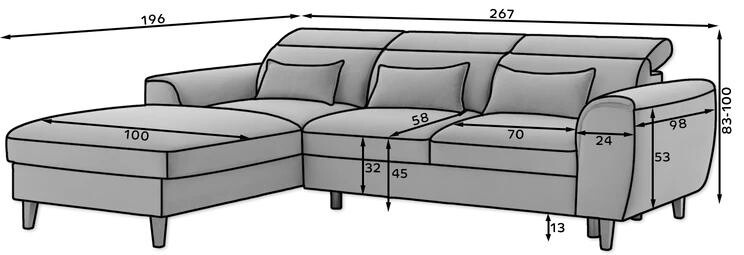 Our Foble model is more than just a piece of furniture. It is a way to regain the energy you lost at work and put a smile back on your face! Don't you believe it? Then take a look at what our cornersofa is made of: at its heart you will find HR high resilience foam, elastic band, T2130 foam and B-type corrugated springs. The construction is therefore able to gently wrap around your body, while taking care to provide its tender areas with the correct support. The right combination of the highest quality materials also makes the corner sofa resistant to creasing and deformation. This meansthat even when used intensively, it will remain free of unsightly and uncomfortable indentations. It will therefore look like a new one for a surprisingly long time! For your maximum safety, Foble is equipped with adjustable headrests. An additional advantage of the corner sofa are the three decorative cushions offered in a standard version. Not only do they increase the comfort of the furniture, but they are also an aesthetically pleasing decoration that enhances its visual appeal. You can also place them on the armchairs to create a harmoniously coherent decor.