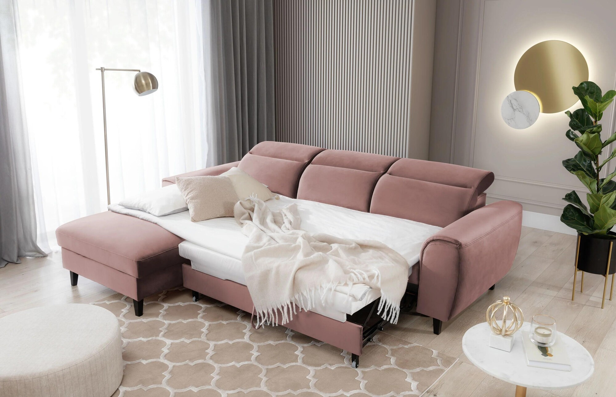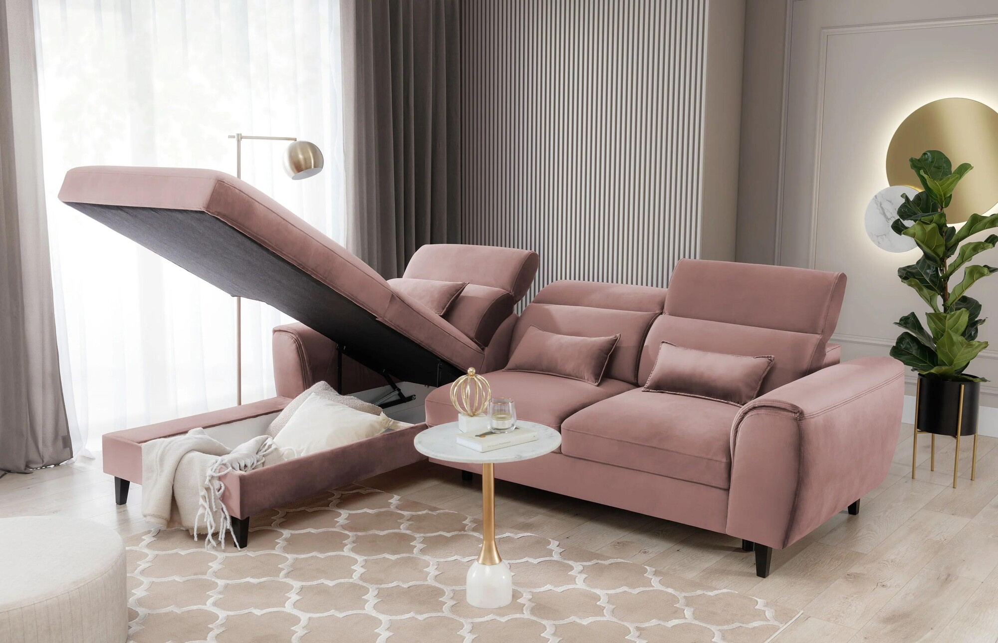 Our Foble model is more than just a piece of furniture. It is a way to regain the energy you lost at work and put a smile back on your face! Don't you believe it? Then take a look at what our cornersofa is made of: at its heart you will find HR high resilience foam, elastic band, T2130 foam and B-type corrugated springs. The construction is therefore able to gently wrap around your body, while taking care to provide its tender areas with the correct support. The right combination of the highest quality materials also makes the corner sofa resistant to creasing and deformation. This meansthat even when used intensively, it will remain free of unsightly and uncomfortable indentations. It will therefore look like a new one for a surprisingly long time! For your maximum safety, Foble is equipped with adjustable headrests. An additional advantage of the corner sofa are the three decorative cushions offered in a standard version. Not only do they increase the comfort of the furniture, but they are also an aesthetically pleasing decoration that enhances its visual appeal. You can also place them on the armchairs to create a harmoniously coherent decor.