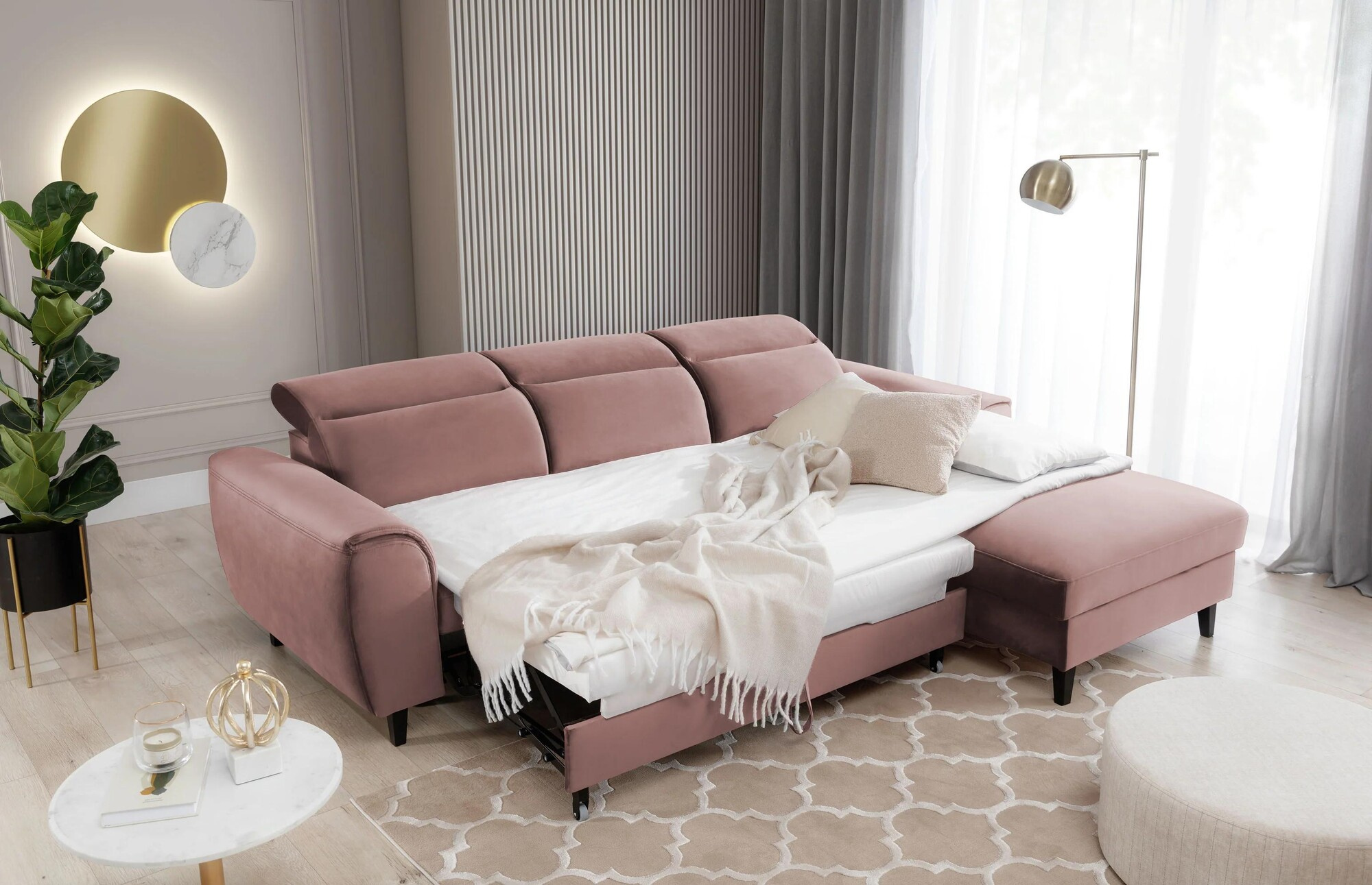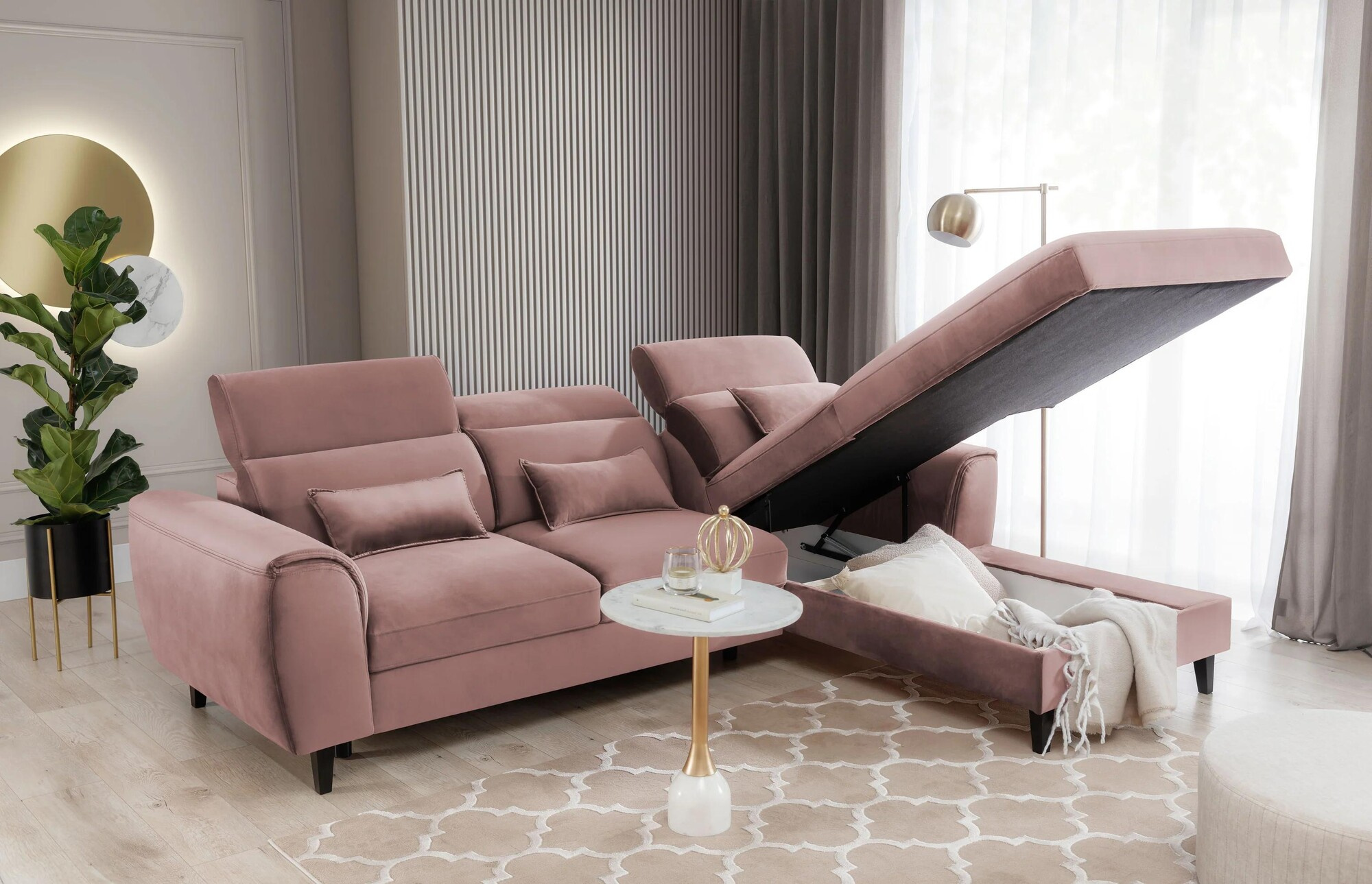 Our Foble model is more than just a piece of furniture. It is a way to regain the energy you lost at work and put a smile back on your face! Don't you believe it? Then take a look at what our cornersofa is made of: at its heart you will find HR high resilience foam, elastic band, T2130 foam and B-type corrugated springs. The construction is therefore able to gently wrap around your body, while taking care to provide its tender areas with the correct support. The right combination of the highest quality materials also makes the corner sofa resistant to creasing and deformation. This meansthat even when used intensively, it will remain free of unsightly and uncomfortable indentations. It will therefore look like a new one for a surprisingly long time! For your maximum safety, Foble is equipped with adjustable headrests. An additional advantage of the corner sofa are the three decorative cushions offered in a standard version. Not only do they increase the comfort of the furniture, but they are also an aesthetically pleasing decoration that enhances its visual appeal. You can also place them on the armchairs to create a harmoniously coherent decor.