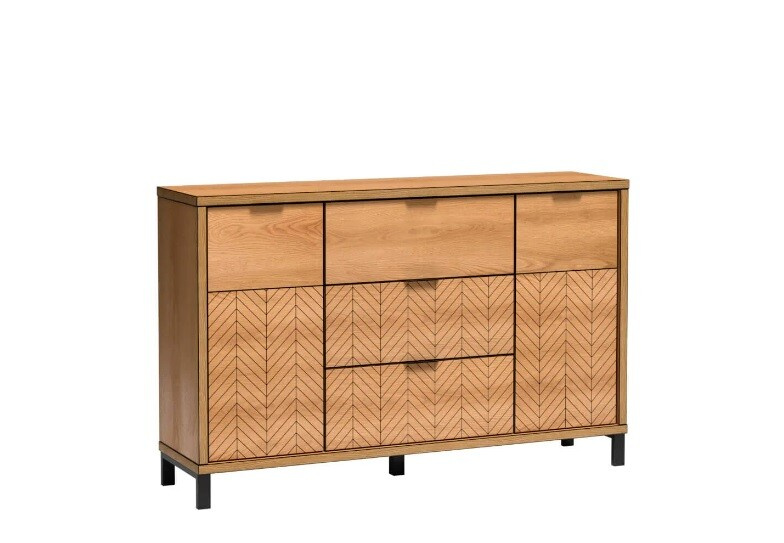 Tágas komód karamell tölgy színben a FONTI kollekcióból. A komód középső részén 3 fiókot találunk, amelyek praktikusságuknak köszönhetően valóban sok mindent elnyelnek! Az oldalakon szekrények találhatók, amelyek mögött polcok vannak, és a teret két részre osztják.