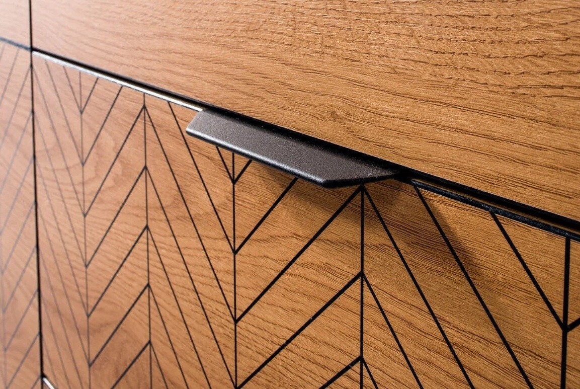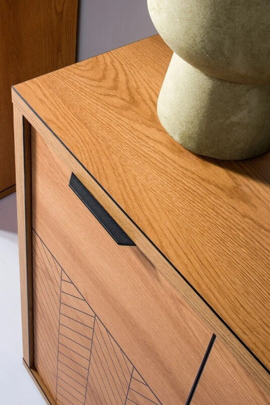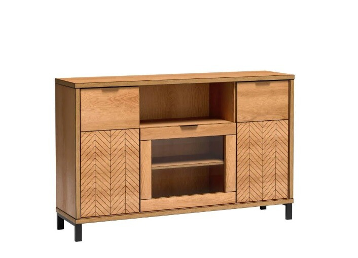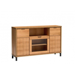 Praktikus komód a FONTI kollekcióból karamell tölgy színben. A bútorok oldalán találunk egy polcos szekrényeket, amelyekbe sok minden elfér. A komód közepén egy üvegezett előlapú szekrény fogad minket, amelyben egy polc osztja ketté a teret. A szekrény fölött találunk egy polcot különféle apróságoknak.