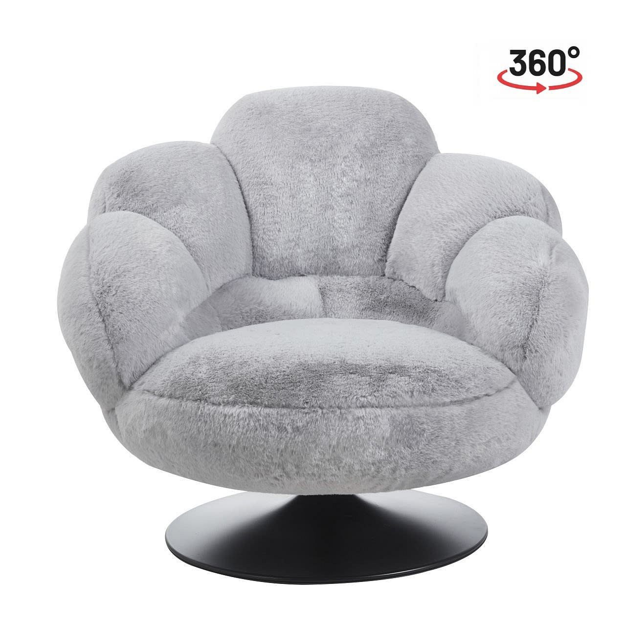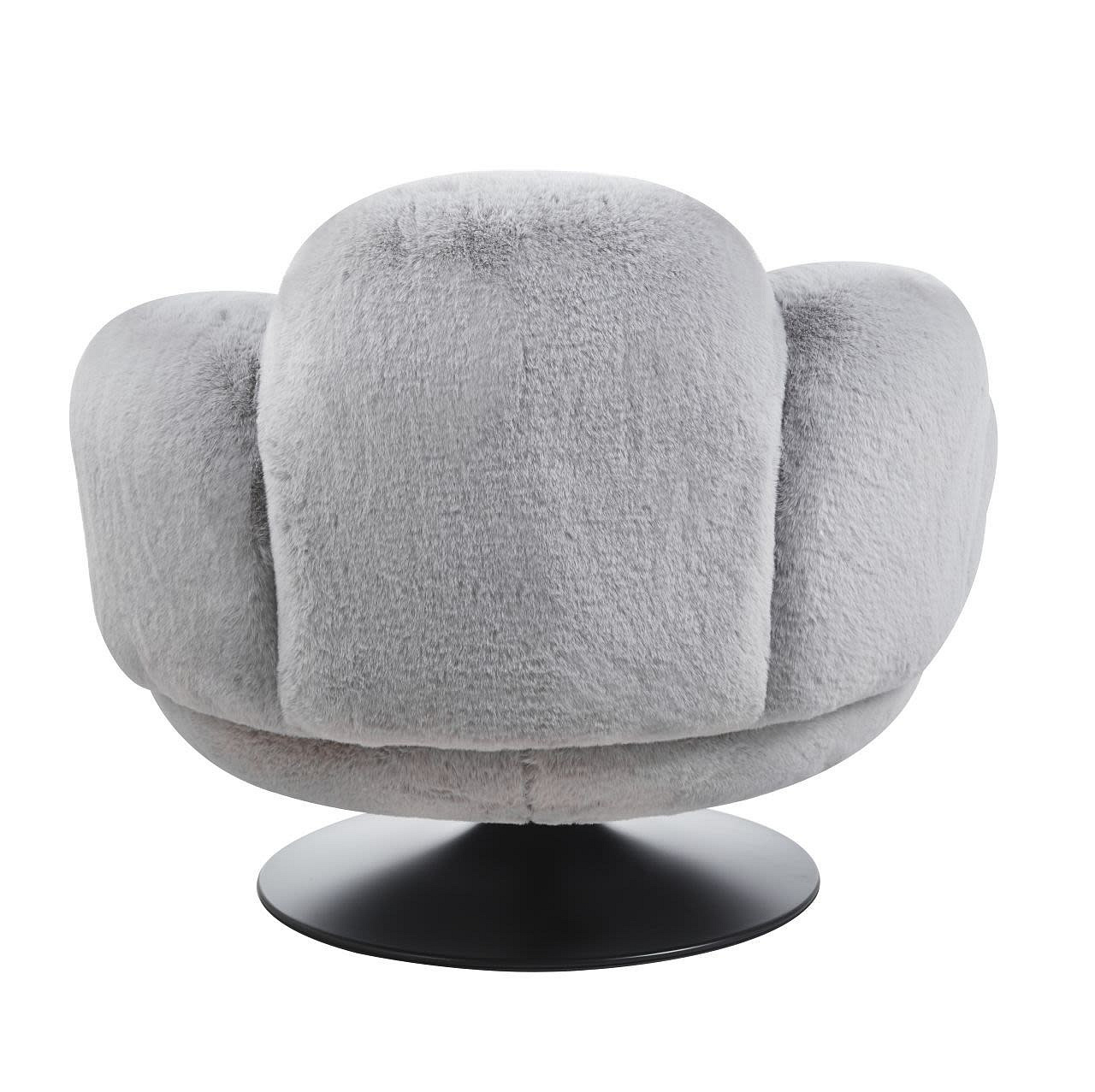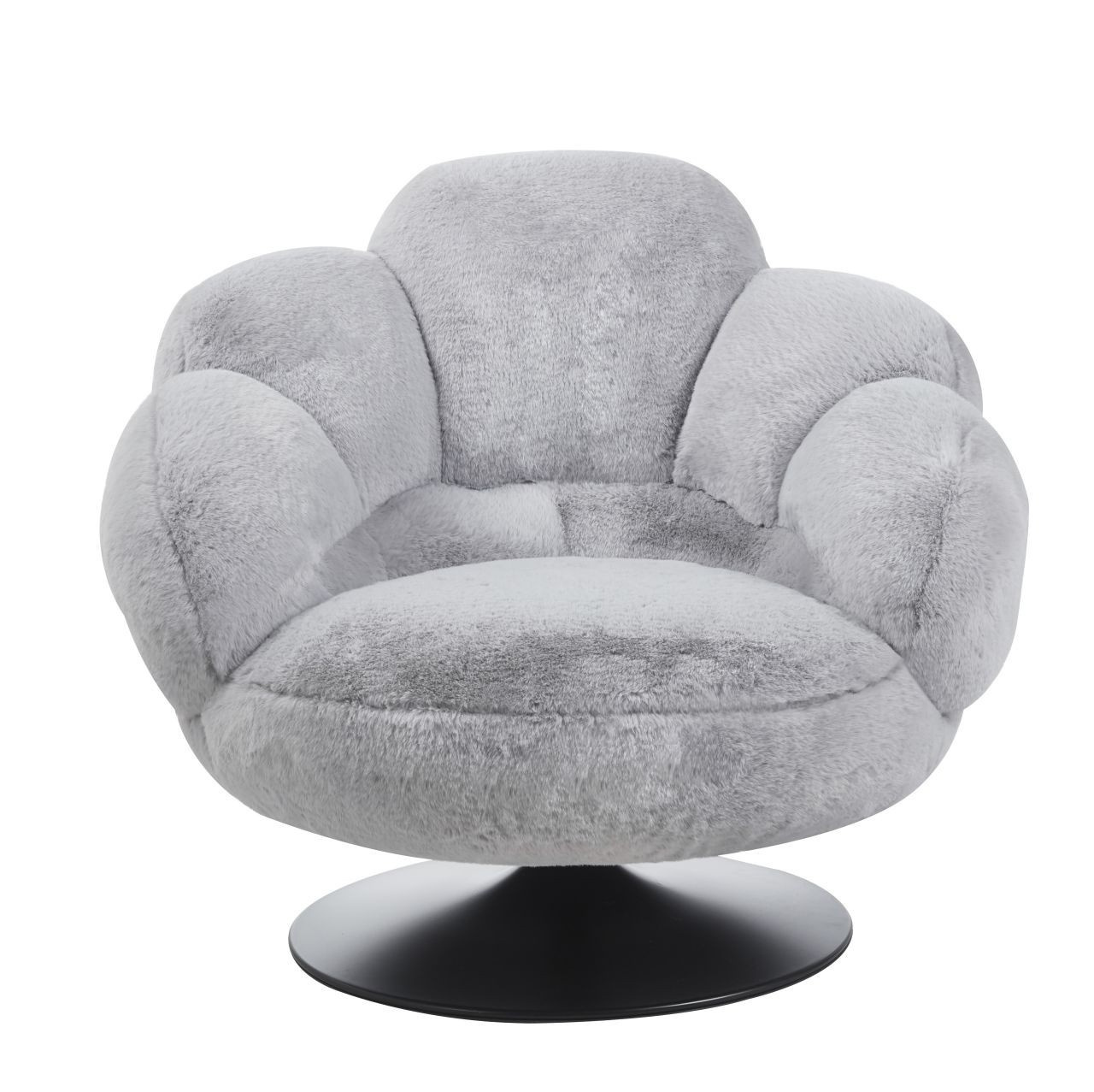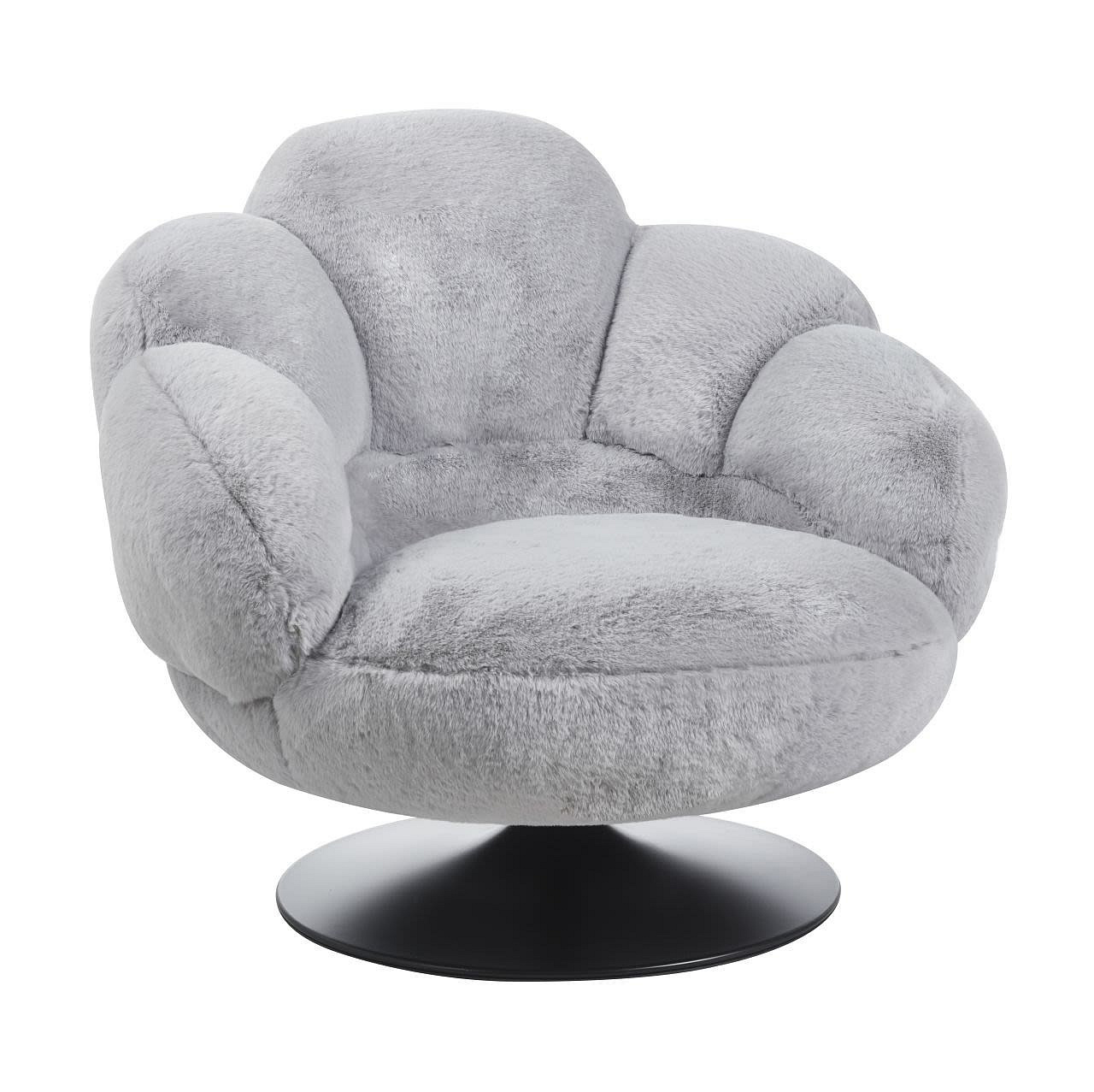 A szék ülőkéje 360 fokban forgatható.Méretek: - teljes magasság: 78 cm - teljes szélesség: 96 cm - teljes mélység: 92 cm - ülésmélység: 55 cm - ülés szélessége: 55 cm - ülésmagasság: 39 cm - alap átmérője: 60 cm Anyag - ülés: szőrme szövet - keret: porfestett fém Szín: - ülés: szürke - alap: fekete