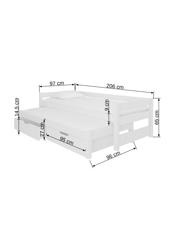 A FRAGA franciaágy ideális megoldás két testvér szobájában. Tökéletesen beválik váratlan vendégek látogatása esetén is. Az ágy két praktikus és funkcionális ágyneműtartó fiókkal, valamint tartós és erős kerettel rendelkezik. Az ággyal együtt kap egy szett habszivacs matracot pamut huzattal, cipzárral.