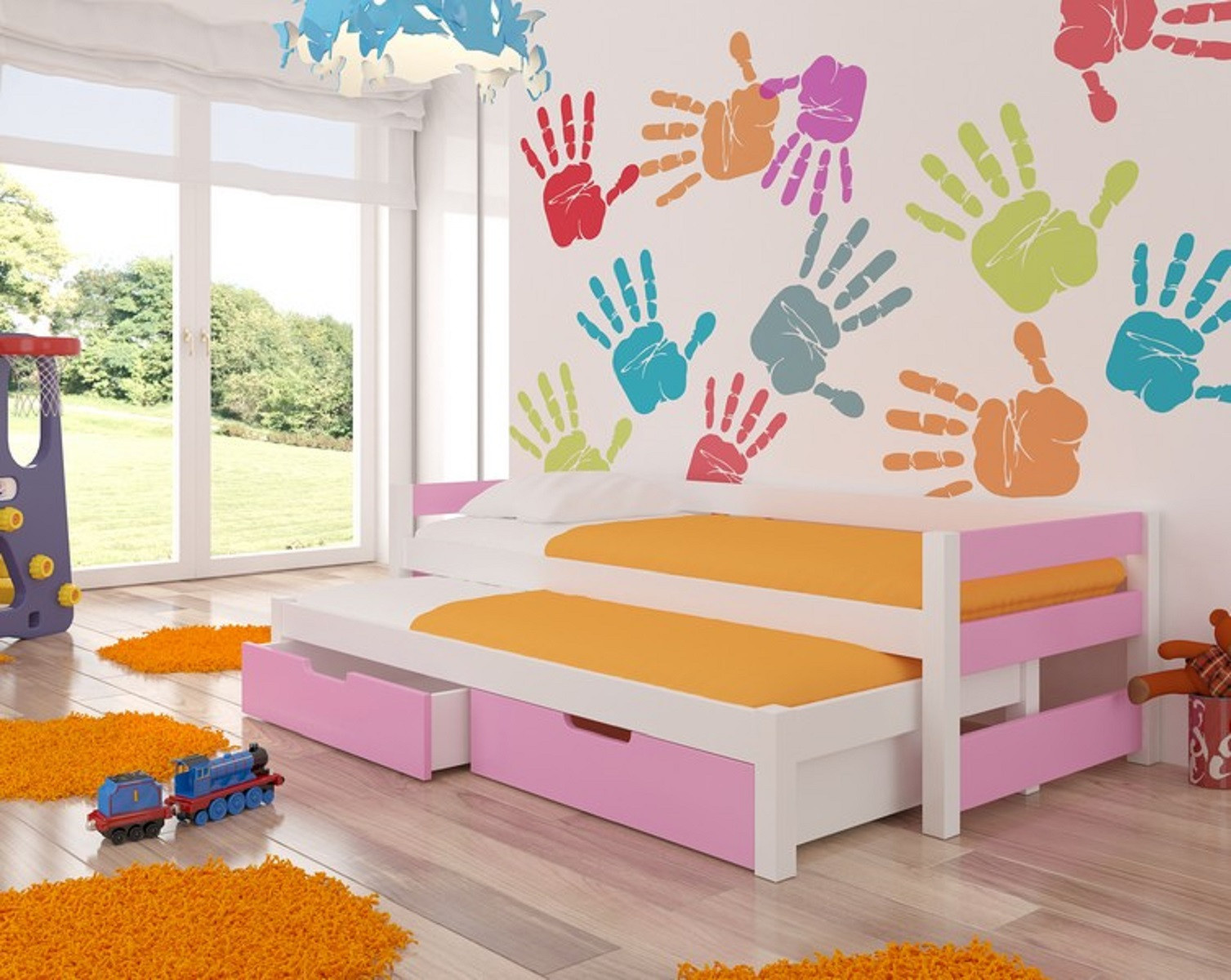 A FRAGA franciaágy ideális megoldás két testvér szobájában. Tökéletesen beválik váratlan vendégek látogatása esetén is. Az ágy két praktikus és funkcionális ágyneműtartó fiókkal, valamint tartós és erős kerettel rendelkezik. Az ággyal együtt kap egy szett habszivacs matracot pamut huzattal, cipzárral.