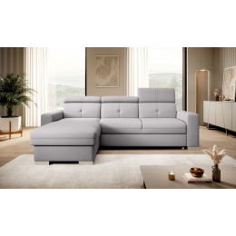 The Fresia corner settee is an L-shaped piece of furniture that looks great and was designed with a blissful rest in mind. In addition, apart from providing aesthetic values, it is also very functional and comfortable, because it is equipped with 3 movable headrests. Fresia is a piece of furniture 247 cm wide, 176 cm deep and 104 cm high. Fresia's wooden and chrome-plated legs, 5.5 centimetres long, are a beautiful decoration and emphasise its elegant look. Another advantage of the corner settee is the bedding container, thanks to which you can keep the living room or guest room tidy. The fold-out function also provides a sleeping area of 204 x 126 cm – a great option in the case of unexpected guests visiting. The mechanism used to open the corner settee is of the very popular and convenient dolphin type. The impressive upholstery from the ELTAP collection adds character and style to the piece of furniture. The offer includes both classic and more original colours. Thanks to the seat filled with T30 foam, the corner settee provides stable support and a comfortable rest. Another important part of upholstered furniture are the springs. The type B corrugated spring was used in the Fresia corner settee, so the seat of this piece of furniture is more flexible and bent, and thus extremely comfortable.