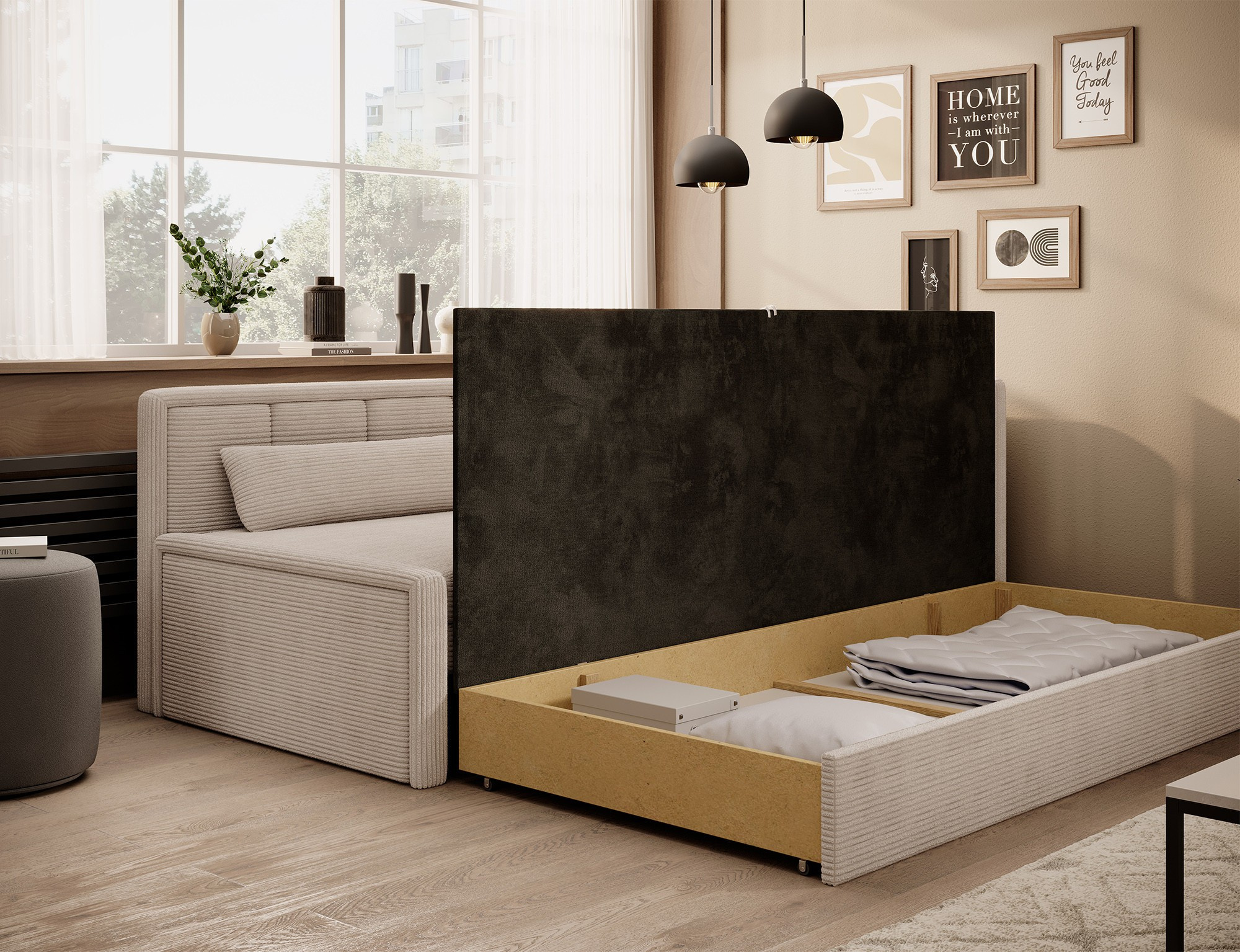 The Fulgeo sofa bed is a solution designed for the demanding, modern user. It offers not only a minimalist and aesthetically pleasing shape but also a functional folding system that allows you to quickly and efficiently transform it into a comfortable bed. This option is perfect for a studio apartment, a living room with a kitchenette, or a youth room. The seat is filled with T2540 polyurethane foam, while the backrest contains T2130 polyurethane foam. It features an easy-to-use sleeping function and a spacious storage compartment for bedding. The lower storage space helps keep textiles organized, making the bed-making process exceptionally smooth. The Fulgeo model is upholstered in an elegant velour fabric with a subtle woven texture that gently shimmers under the light. This material not only boasts a beautiful appearance but also offers high resistance to friction, abrasion, and pilling. Additionally, it does not fade when exposed to light, ensuring that you can enjoy its flawless charm on your new furniture for years to come!