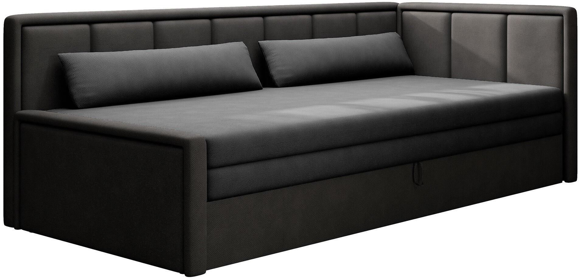 The Fulgeo couch is a solution designed with the demanding, modern user in mind. Therefore, it offers not only a minimalist and eye-pleasing shape, but also a functional unfolding system, thanks to which you can quickly and efficiently transform the whole into a comfortable bed. This product will beperfect for a studio apartment, a living room with a kitchenette or a teenager's room. The seat of this piece of furniture is filled with T2540 polyurethane foam, and its backrest – with T2130 polyurethane foam. It has an easy-to-use sleeping function and a capacious storage for bedding. The container at the bottom helps with taming the mess among sheets and pillowcases, thus the process of making the bed becomes quick and efficient. The Fulgeo model is equipped with an extremely elegant upholstery. It is made entirely of velour fabric with a subtle, braided structure which gently shimmers under the light. This material, in addition to its beautiful appearance, is also very resistant to friction,abrasion and pilling. It also does not fade when exposed to light. This means that you will be able to enjoy the pristine charm of your new piece of furniture for a long time!