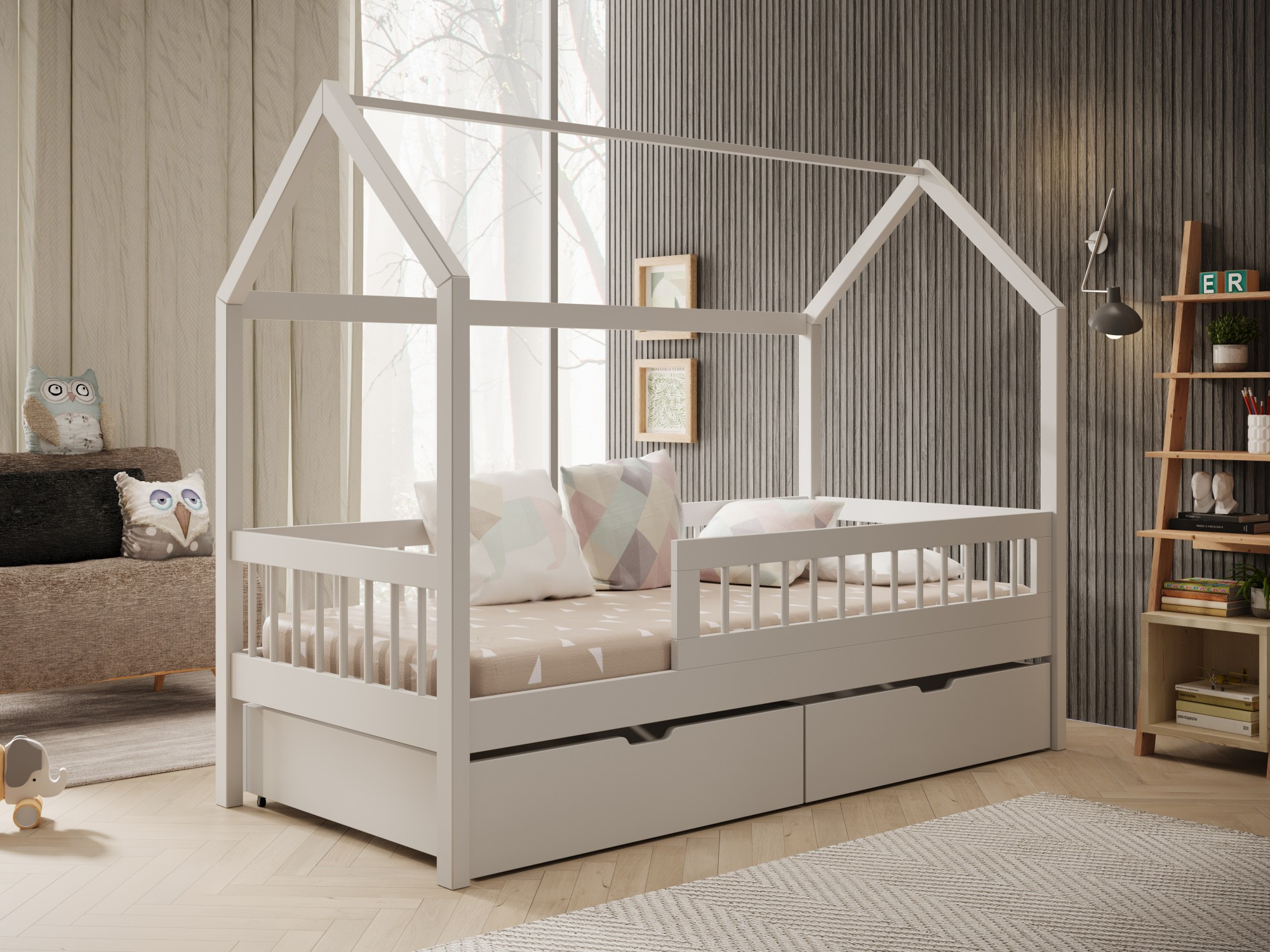 A Galicja ház ágy egy kivételes bútordarab, amely ötvözi a funkcionalitást és a barátságos, skandináv esztétika által inspirált dizájnt. Tömör fából készült, az ágy stabilitást és tartósságot biztosít, miközben meleg, természetes bájt kölcsönöz a belső térnek. Kialakítása házikó formájában ösztönzi a gyermekek képzeletét, és kényelmes helyet teremt a játékhoz és pihenéshez. Ideális központi elemként szolgál a gyerekszobában, biztosítva a kényelmes alvást és inspirálva a kreatív játékra. Az egyszerű forma és a természetes kivitelezés miatt a Galicja ágy harmonikusan illeszkedik bármilyen belső térbe, függetlenül az elrendezés stílusától.