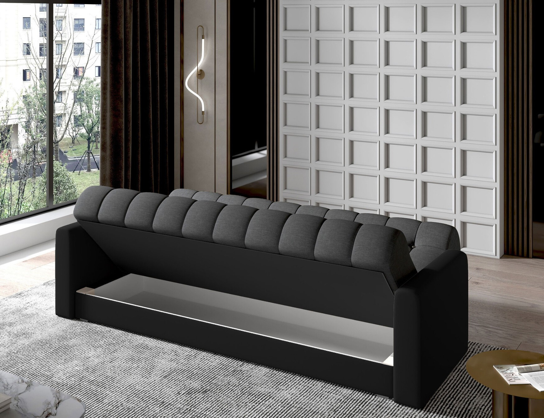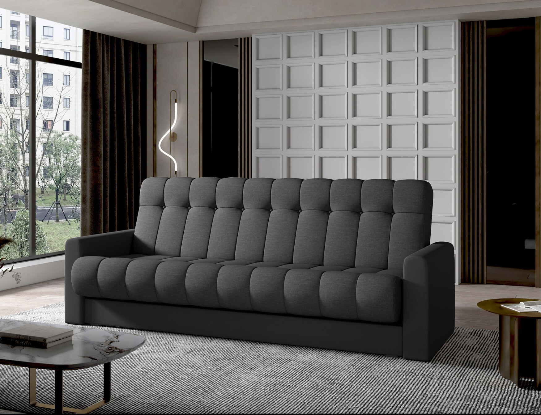 Garett is an elegant and very stylish sofa that impresses with its workmanship. The classic shape with a stylish finish gives the sofa a unique character. Garett is a piece of furniture with dimensions of 210 x 85 x 90 cm - for resting during the day, as well as at night - thanks to the sleeping function - a bed of 115 x 190 cm with an additionally spacious bedding container supported by the Klik-clack opening mechanism. Thanks to the use of bonel and T25 foam, the seat of the sofa is extremely flexible, soft and resistant to any kind of deformation. Simple form, elegant finish and secure construction - this is what Garett lounge furniture is. Such a sofa will certainly meet all your expectations.