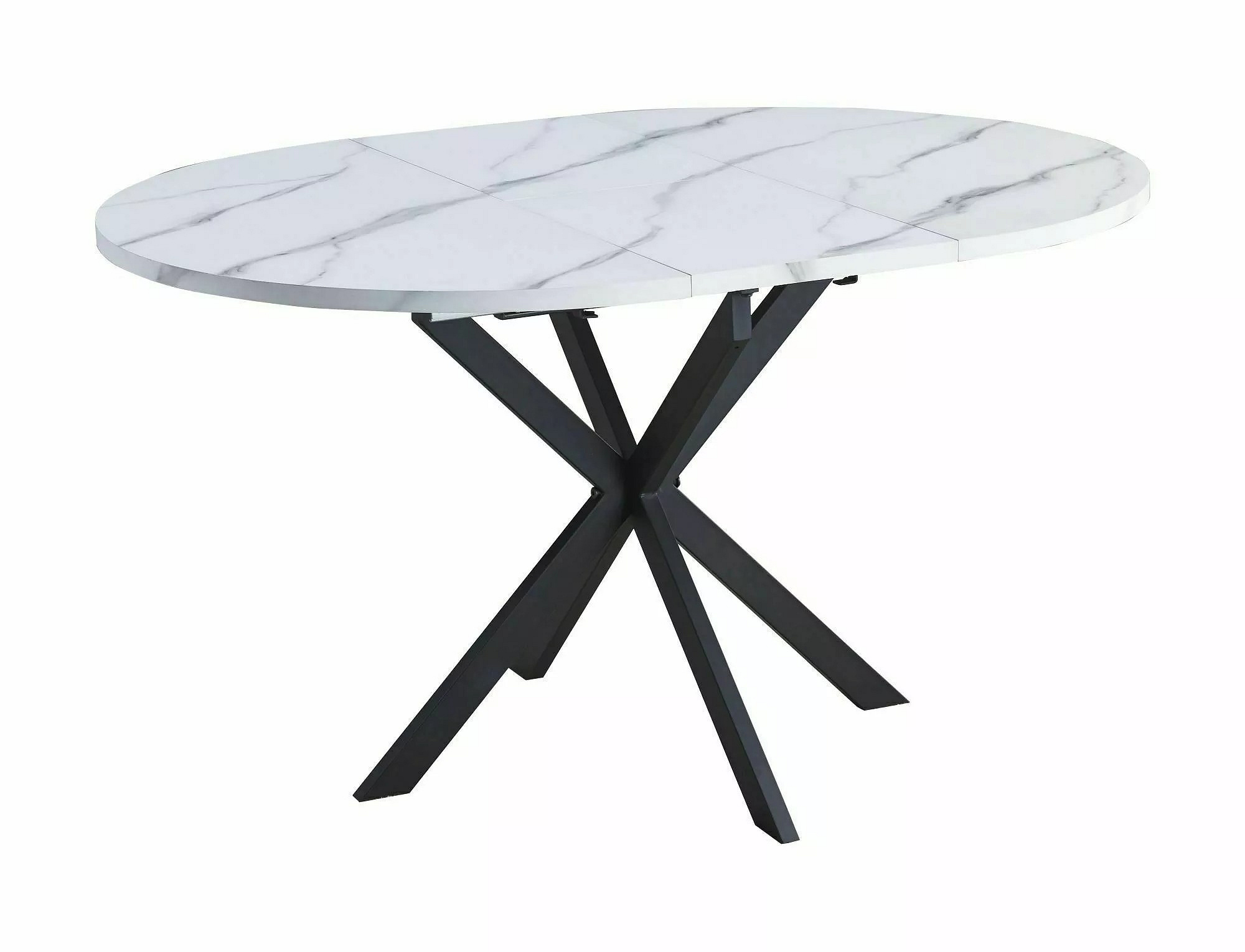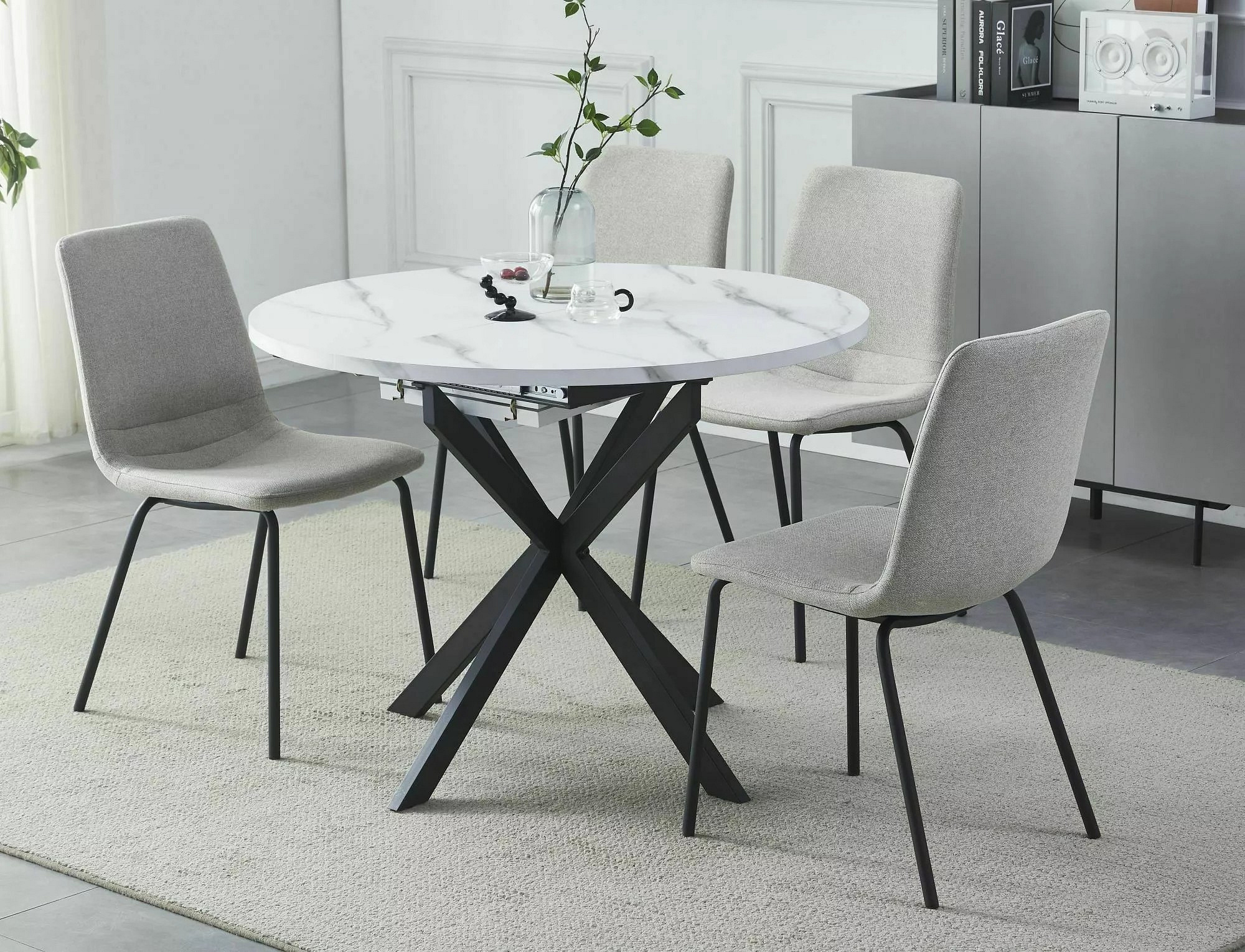Az asztal felülete fehér márványt utánoz, ami friss és modern megjelenést kölcsönöz a belső térnek. A fekete matt fém lábak stabilitást biztosítanak, miközben ipari jelleget kölcsönöznek, ami jelenleg nagyon népszerű.Gyakorlati Méretek és Kihúzható Funkció