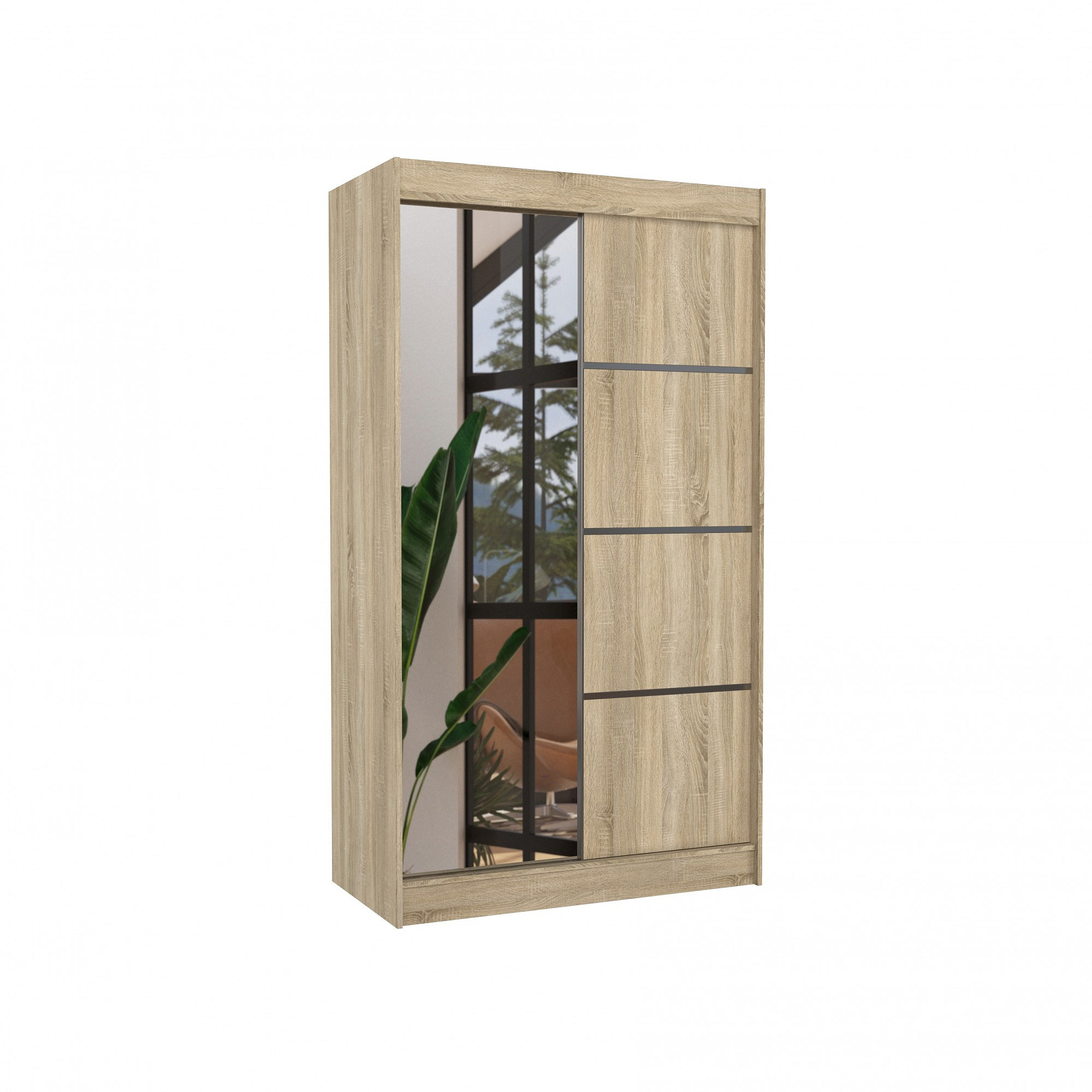 A GILTON tolóajtós és tükrös ruhásszekrény ideális módja a tér rendezésének. A bútor tágas polcokkal és egy rúddal van felszerelve, amelyre felakaszthatja a ruhákat, öltönyöket, felsőruházatot vagy ingeket. Az elülső oldalra tükör és díszítő szalagok voltak rögzítve, amelyek egyedi stílust kölcsönöznek. Annak köszönhetően, hogy a szekrény tolóajtós, nem kell további helyet biztosítani az ajtók kinyitásához, ami ideális megoldássá teszi egy kis szoba vagy keskeny előszoba számára.