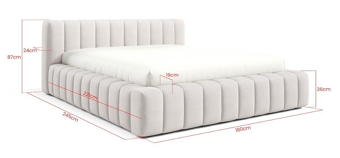 A GINO ágy kiváló minőségű kárpitozott anyaggal van bevonva, amely luxus és elegancia érzetet kölcsönöz a belső térnek. Finom textúrája és tartóssága hosszú élettartamot és könnyű karbantartást biztosít. A termék paramétereiben megadott fekvőfelület méreteivel ideális választás azok számára, akik tágas és kényelmes ágyat szeretnének.