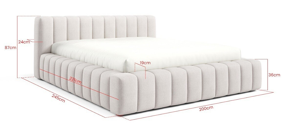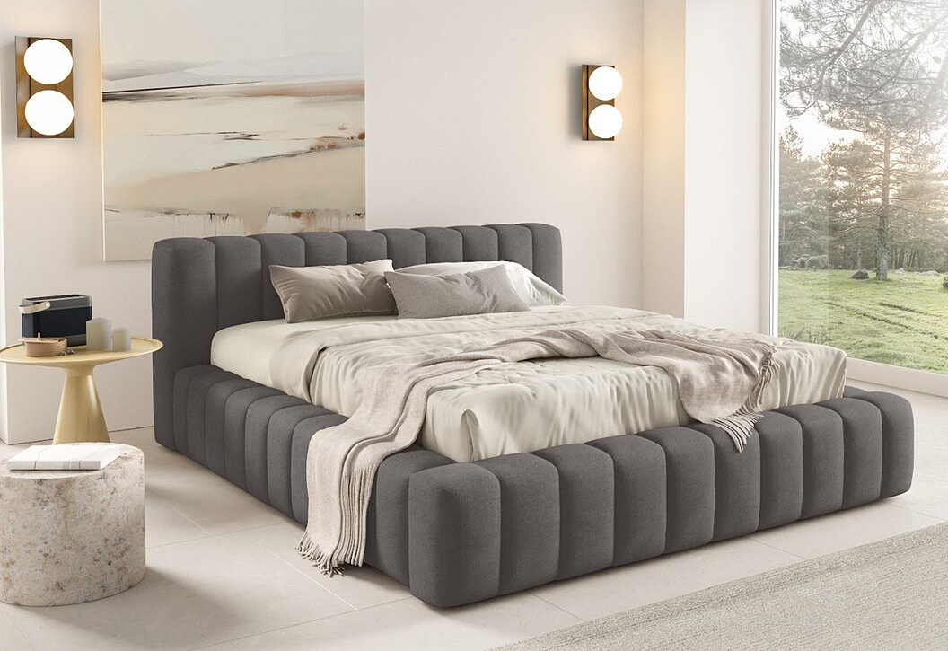A GINO ágy kiváló minőségű kárpitozott anyaggal van bevonva, amely luxus és elegancia érzetet kölcsönöz a belső térnek. Finom textúrája és tartóssága hosszú élettartamot és könnyű karbantartást biztosít. A termék paramétereiben megadott fekvőfelület méreteivel ideális választás azok számára, akik tágas és kényelmes ágyat szeretnének.