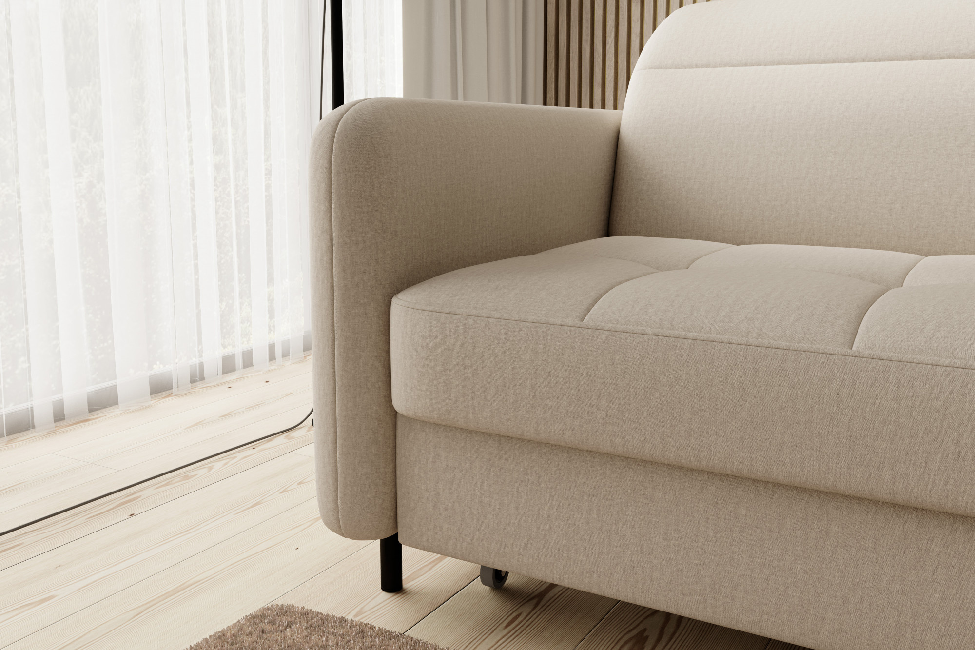 The Gomsi corner settee with the dimensions of 228x165x100 centimetres will perfectly complement the interior. Quilted seats and black metal legs give it a unique appearance, while the upholstered back of the product makes it universal. It will perfectly fit into both modern and elegant interiors. Thanks to the sleeping function with the area of 128x200 centimetres you can take a breath and relax while watching your favourite movies and series. The comfort of your everyday rest will be ensured not only by the sleeping function, but also by the highly elastic HR foam and high-quality B-type corrugated springs used in the seats, providing them with springiness. Another convenient element is the bedding container with the dimensions of 117x97x15 cm, which will help you store additional blankets, pillows and bedding.