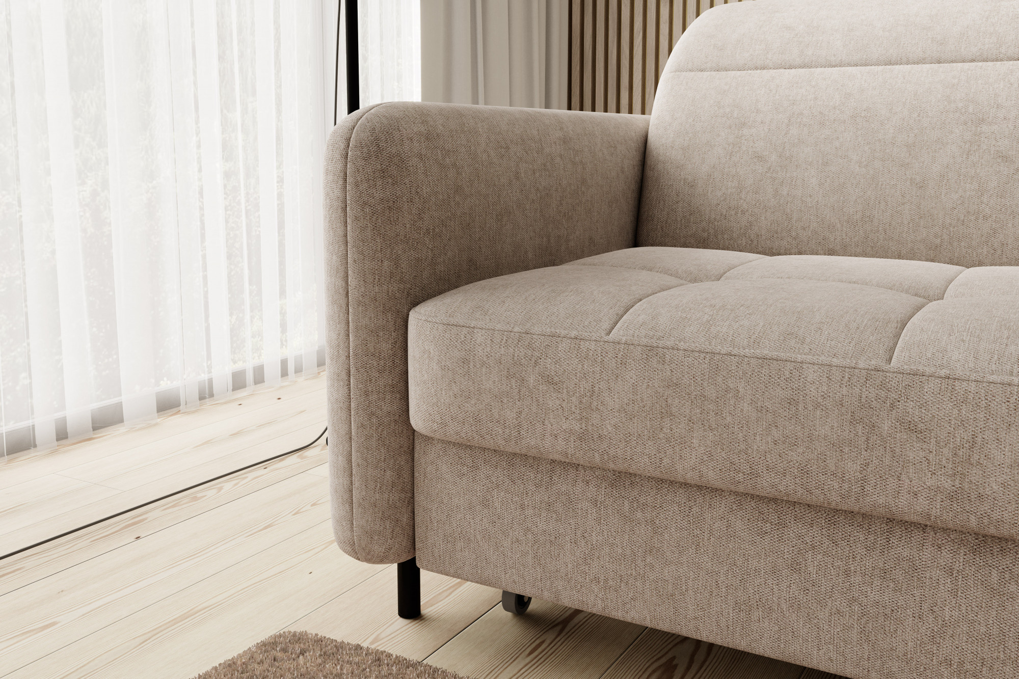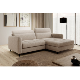 The Gomsi corner settee with the dimensions of 228x165x100 centimetres will perfectly complement the interior. Quilted seats and black metal legs give it a unique appearance, while the upholstered back of the product makes it universal. It will perfectly fit into both modern and elegant interiors. Thanks to the sleeping function with the area of 128x200 centimetres you can take a breath and relax while watching your favourite movies and series. The comfort of your everyday rest will be ensured not only by the sleeping function, but also by the highly elastic HR foam and high-quality B-type corrugated springs used in the seats, providing them with springiness. Another convenient element is the bedding container with the dimensions of 117x97x15 cm, which will help you store additional blankets, pillows and bedding.