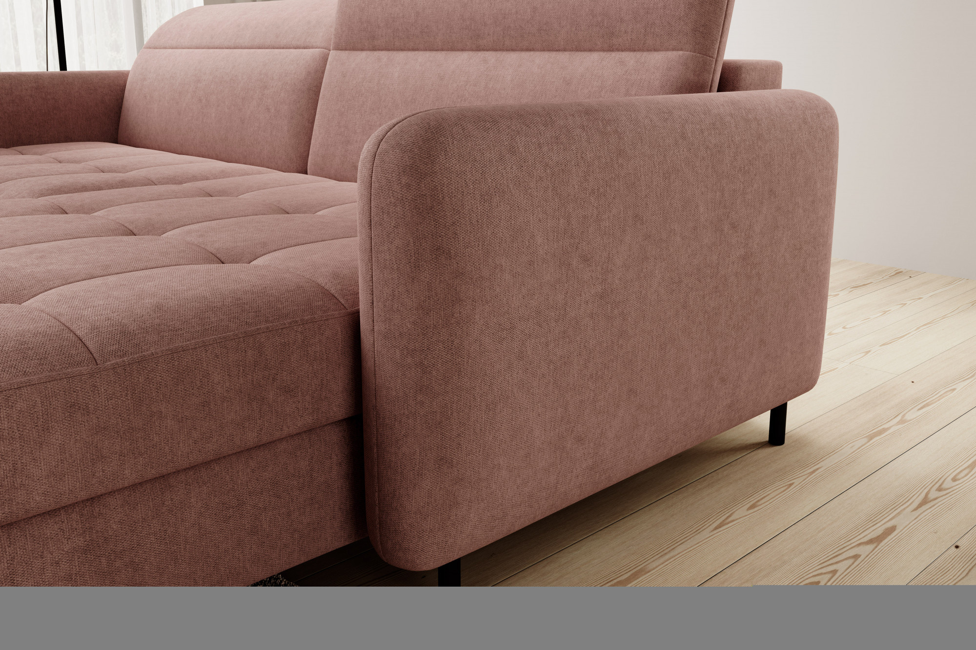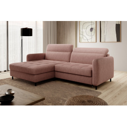 The Gomsi corner settee with the dimensions of 228x165x100 centimetres will perfectly complement the interior. Quilted seats and black metal legs give it a unique appearance, while the upholstered back of the product makes it universal. It will perfectly fit into both modern and elegant interiors. Thanks to the sleeping function with the area of 128x200 centimetres you can take a breath and relax while watching your favourite movies and series. The comfort of your everyday rest will be ensured not only by the sleeping function, but also by the highly elastic HR foam and high-quality B-type corrugated springs used in the seats, providing them with springiness. Another convenient element is the bedding container with the dimensions of 117x97x15 cm, which will help you store additional blankets, pillows and bedding.