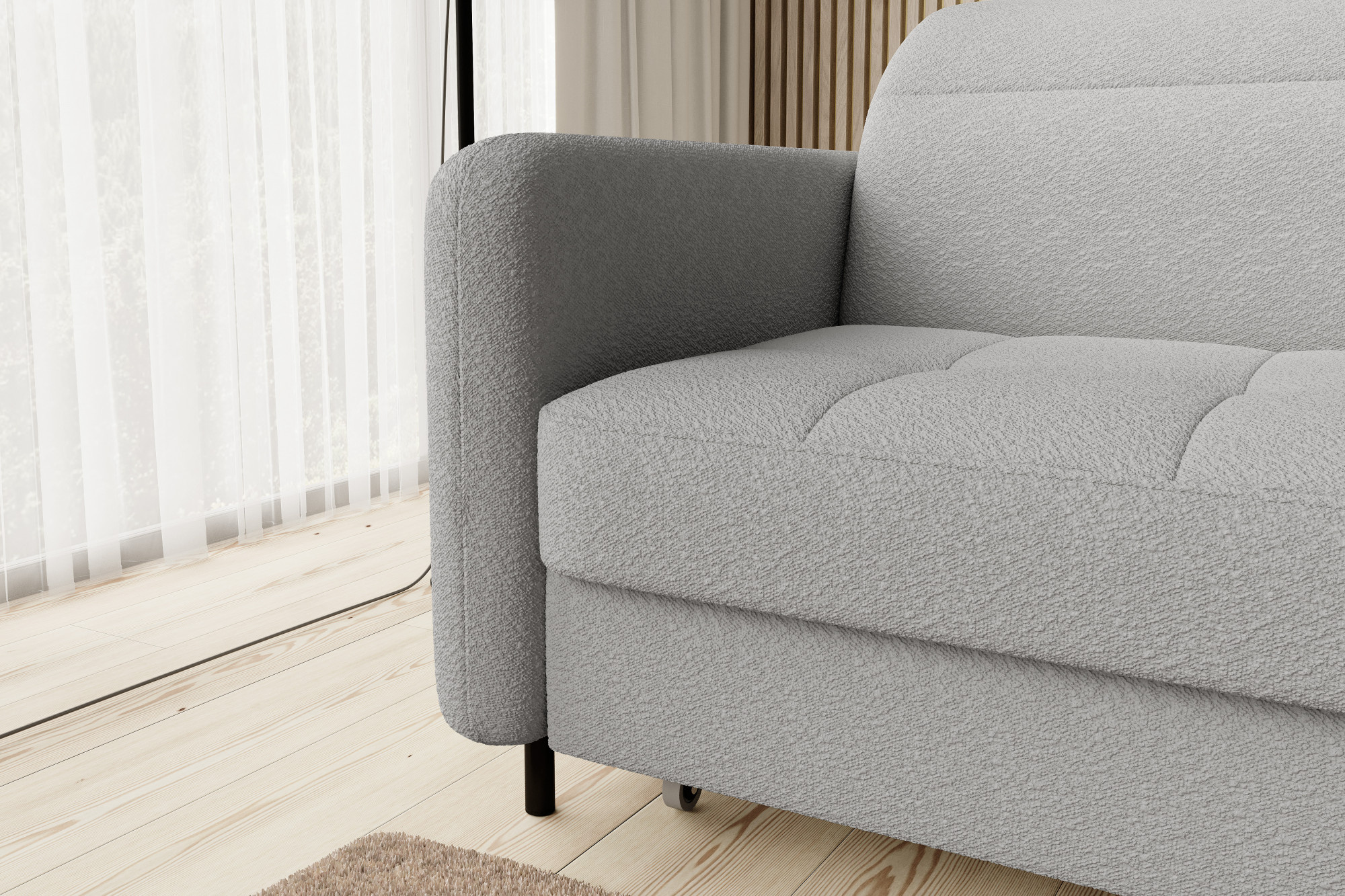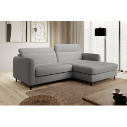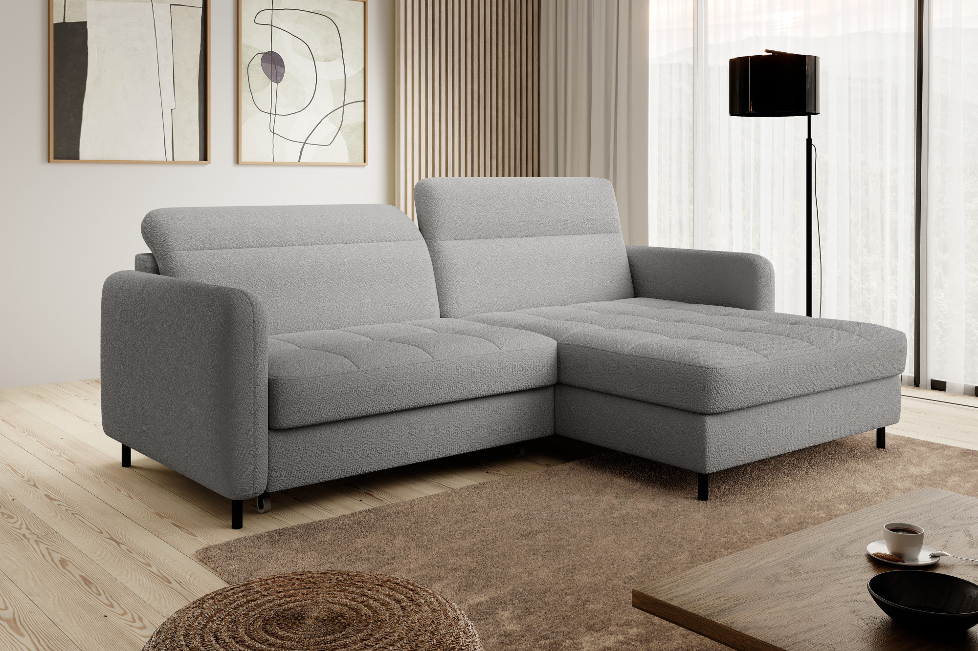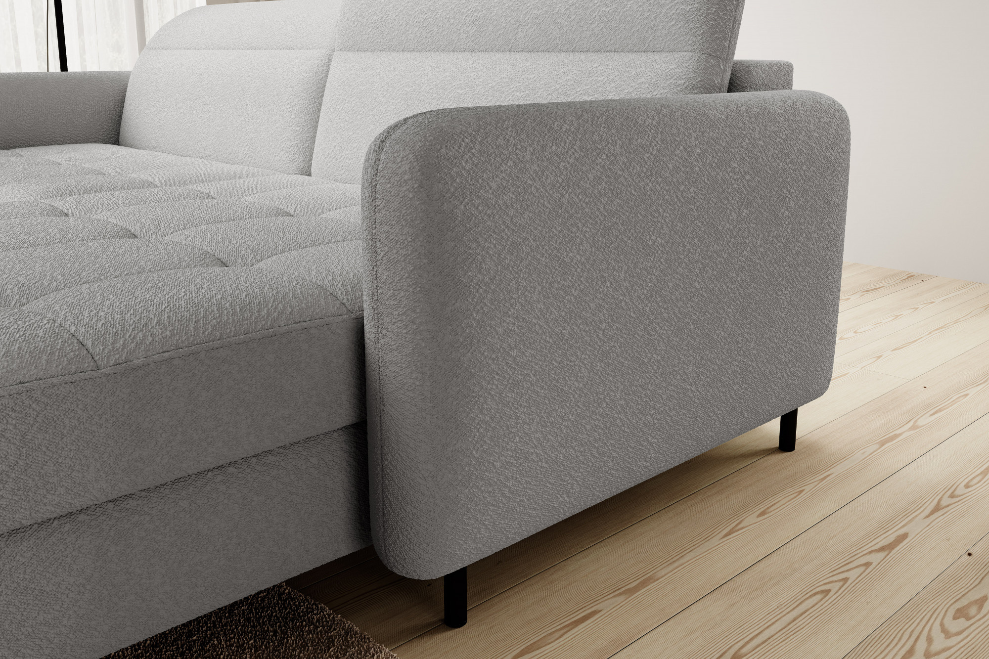 The Gomsi corner settee with the dimensions of 228x165x100 centimetres will perfectly complement the interior. Quilted seats and black metal legs give it a unique appearance, while the upholstered back of the product makes it universal. It will perfectly fit into both modern and elegant interiors. Thanks to the sleeping function with the area of 128x200 centimetres you can take a breath and relax while watching your favourite movies and series. The comfort of your everyday rest will be ensured not only by the sleeping function, but also by the highly elastic HR foam and high-quality B-type corrugated springs used in the seats, providing them with springiness. Another convenient element is the bedding container with the dimensions of 117x97x15 cm, which will help you store additional blankets, pillows and bedding.