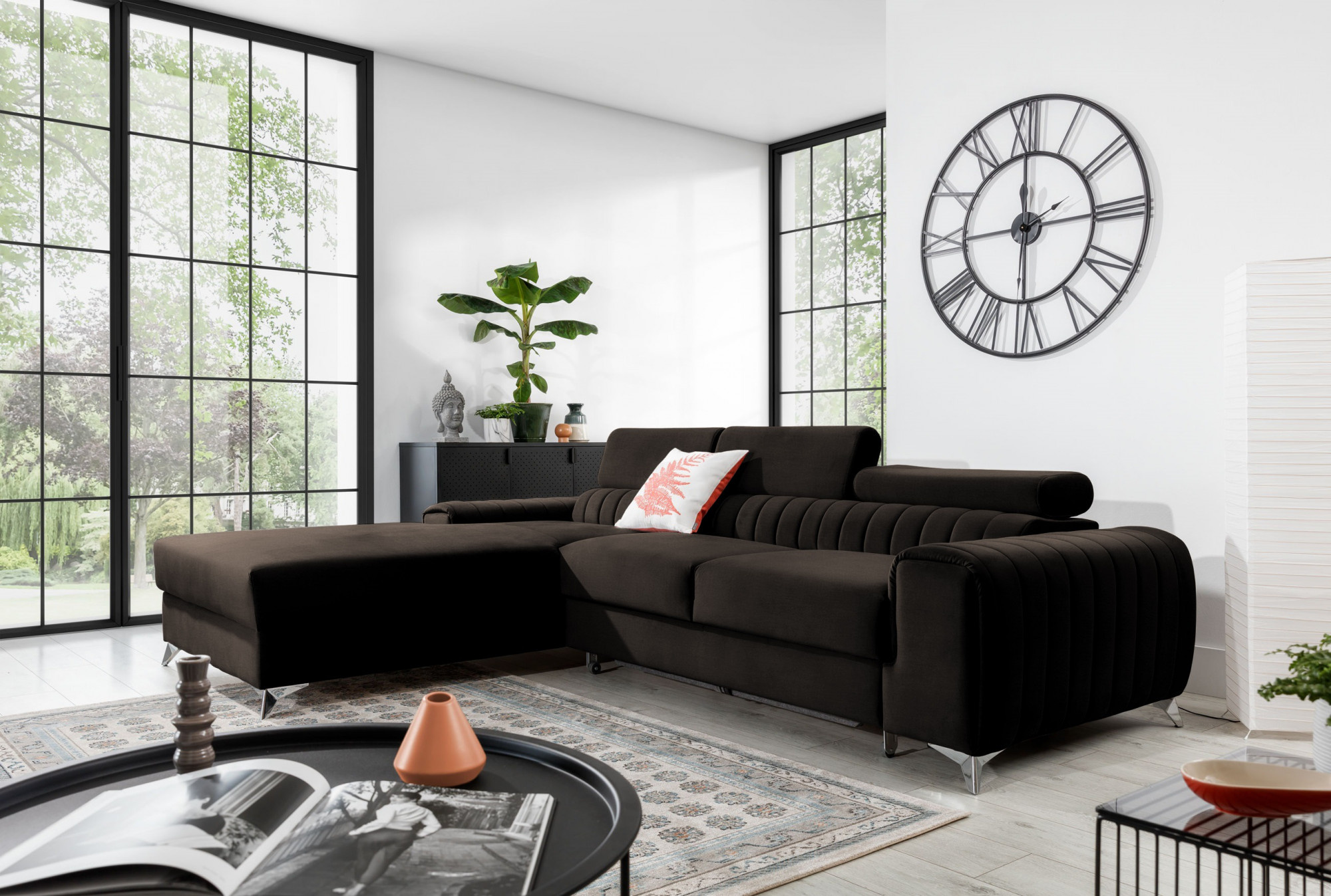Grayson is a multifunctional, elegant and spacious L-shaped corner sofa that can become a luxurious finishing touch to any living room. It is a high-quality piece of furniture, synonymous with comfort and class, thanks to, among other things, the innovative T30+HR foam, which increases the elasticity and resilience of the seat, and is resistant to any kind of deformation. Behind the Grayson corner sofa, measuring 278 x 205 x 92 cm, there is not only comfort, but also well-slept nights, thanks to its large sleeping area - 125 x 216 cm. The type of unfolding mechanism "dolphin" allows you to simply and intuitively unfold the corner sofa, which transforms into a spacious bed. For ease of use, it has also been equipped with a practical linen storage compartment, which is sure to make household cleaning easier. Our Grayson model has a unique, modern design, is springy, durable, and besides, it is also characterized by above-average comfort, solid construction, adjustable, movable headrests and a contoured backrest. If you are curious about what else our Grayson furniture has to offer - we invite you to test this corner sofa. It will certainly be a 100% right choice.